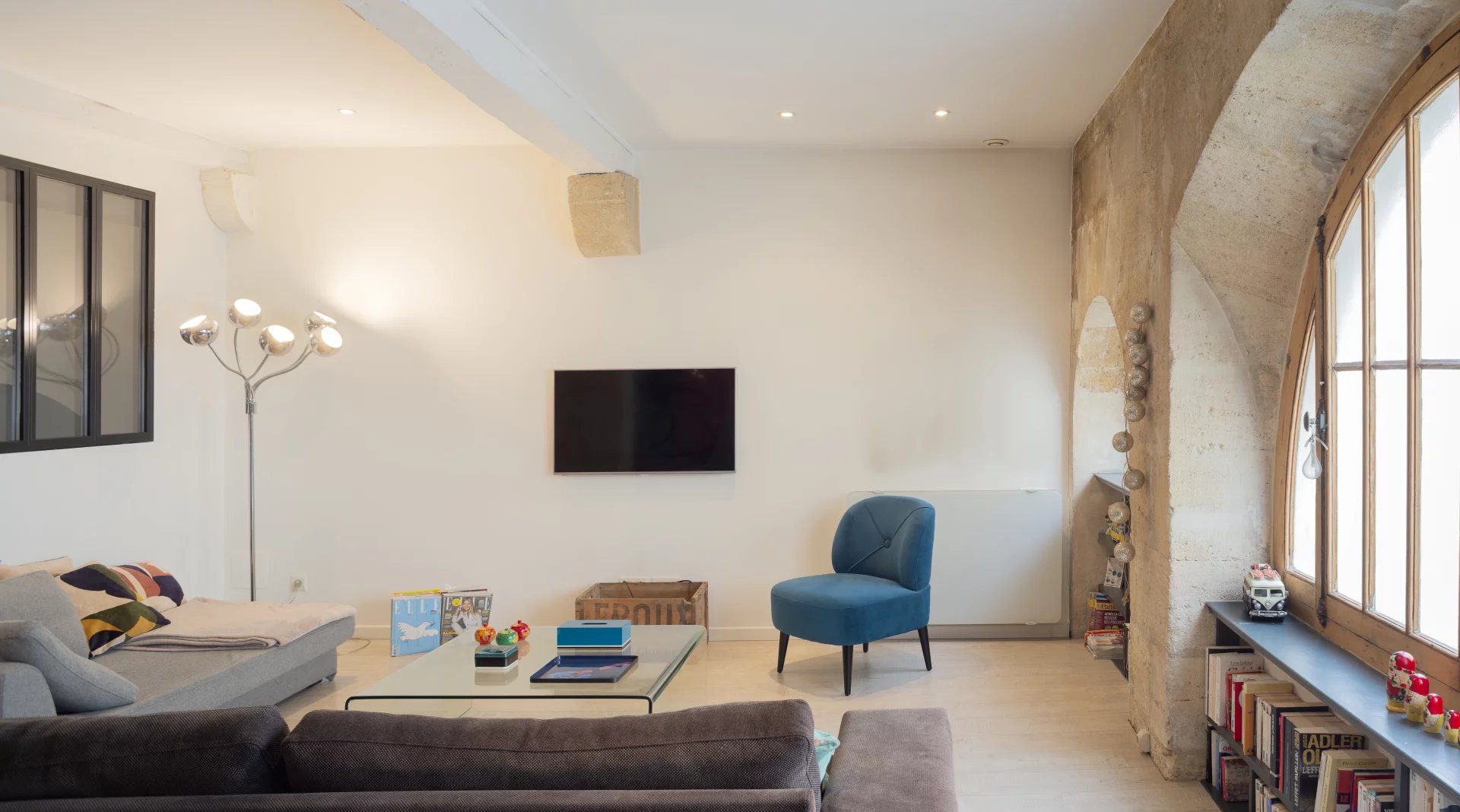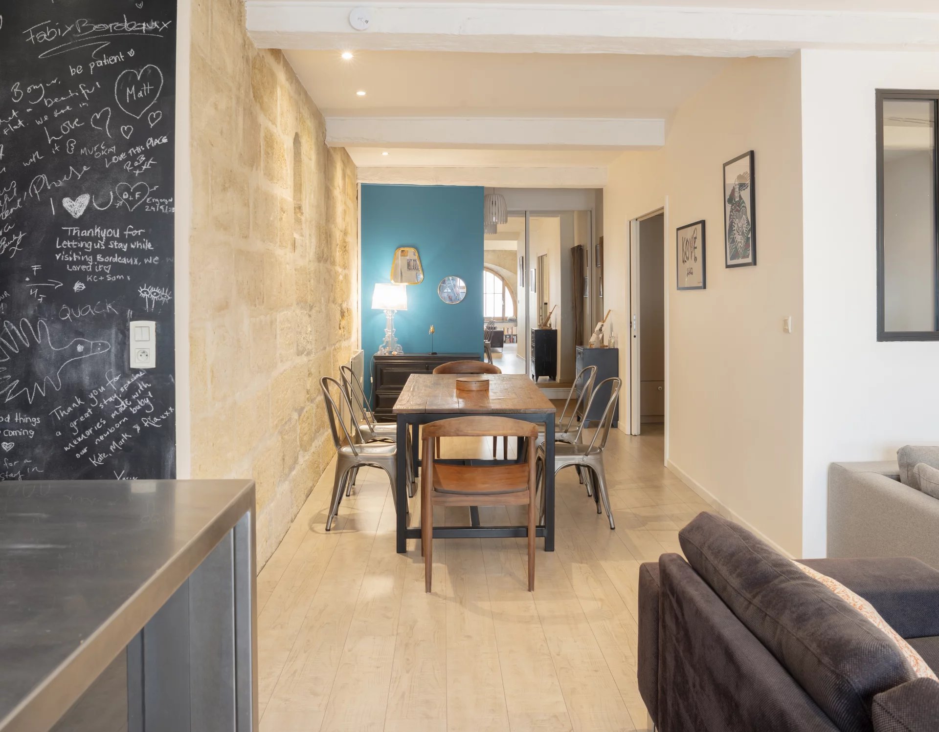 La cuisine ouverte sur le séjour est entièrement équipée et vous permettra de profiter de moments conviviaux et chaleureux. Les murs en pierre apparente ajoutent un caractère unique et authentique à cet espace de vie spacieux. L'appartement est idéal pour un jeune couple, une personne seule à la recherche de confort et de style dans un cadre urbain ou pour un pied à terre bien placé à quelques arrêts de Tram de la gare.