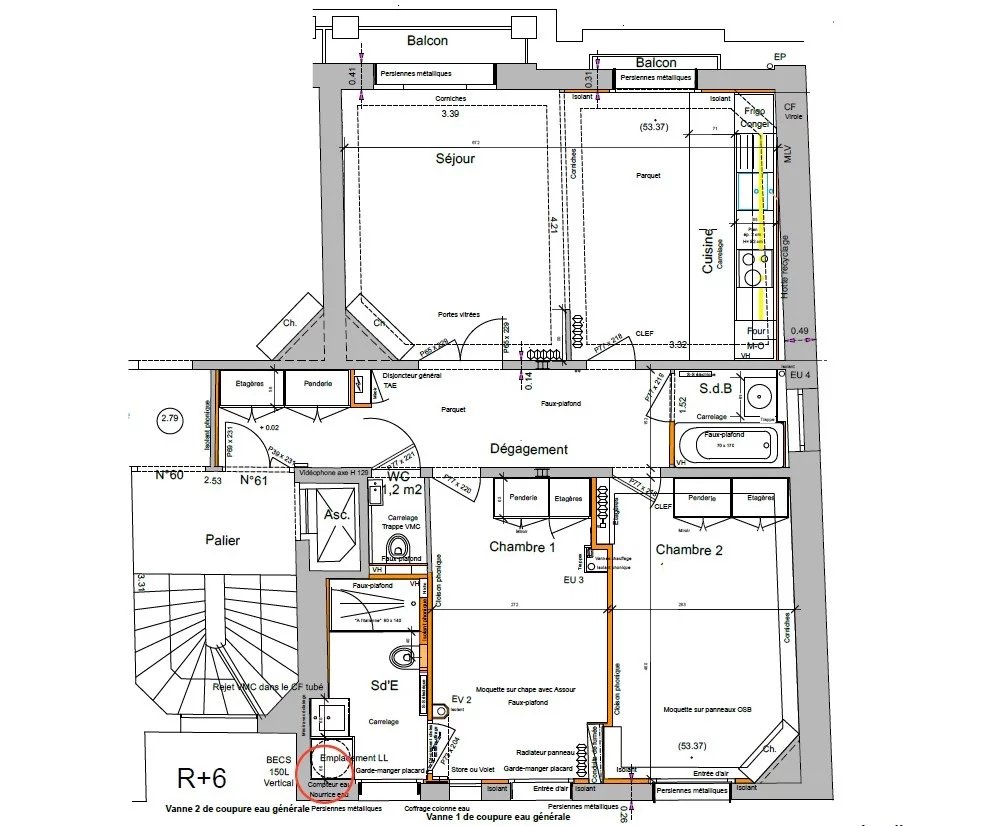 L'appartement comprend également 2 belles chambres, une salle de douche contemporaine avec WC, une salle de bains, un WC séparé. Beaux volumes charme du moderne et de l'ancien. Parquet dans le séjour et moquette dans les chambres, cheminées. Chauffage central. Interphone, digicode. Local à vélos/poussettes.