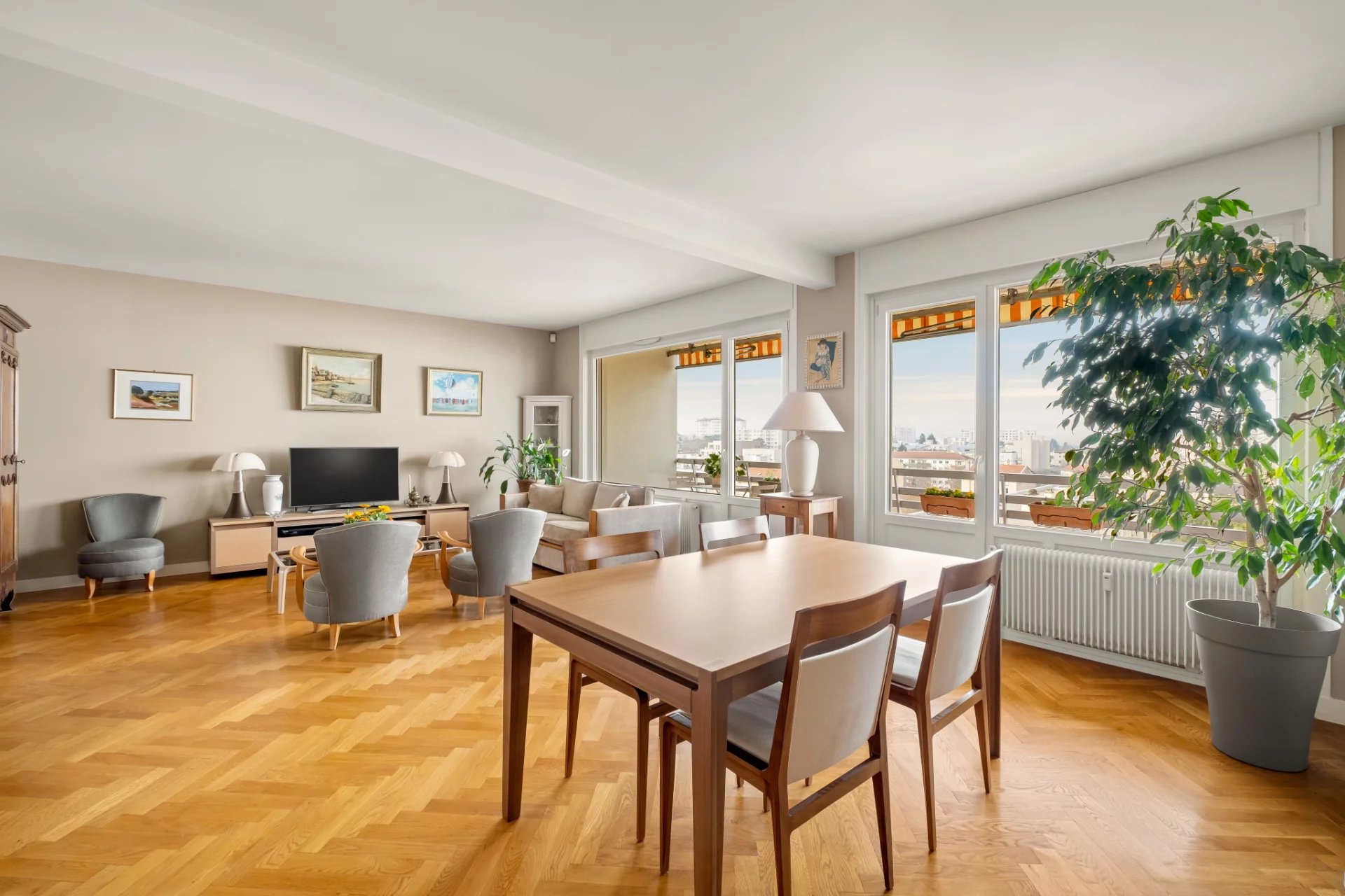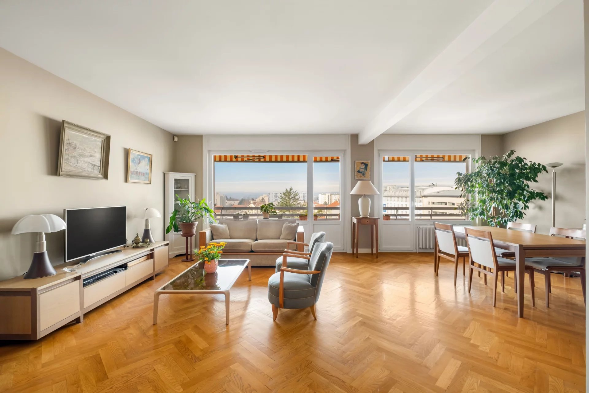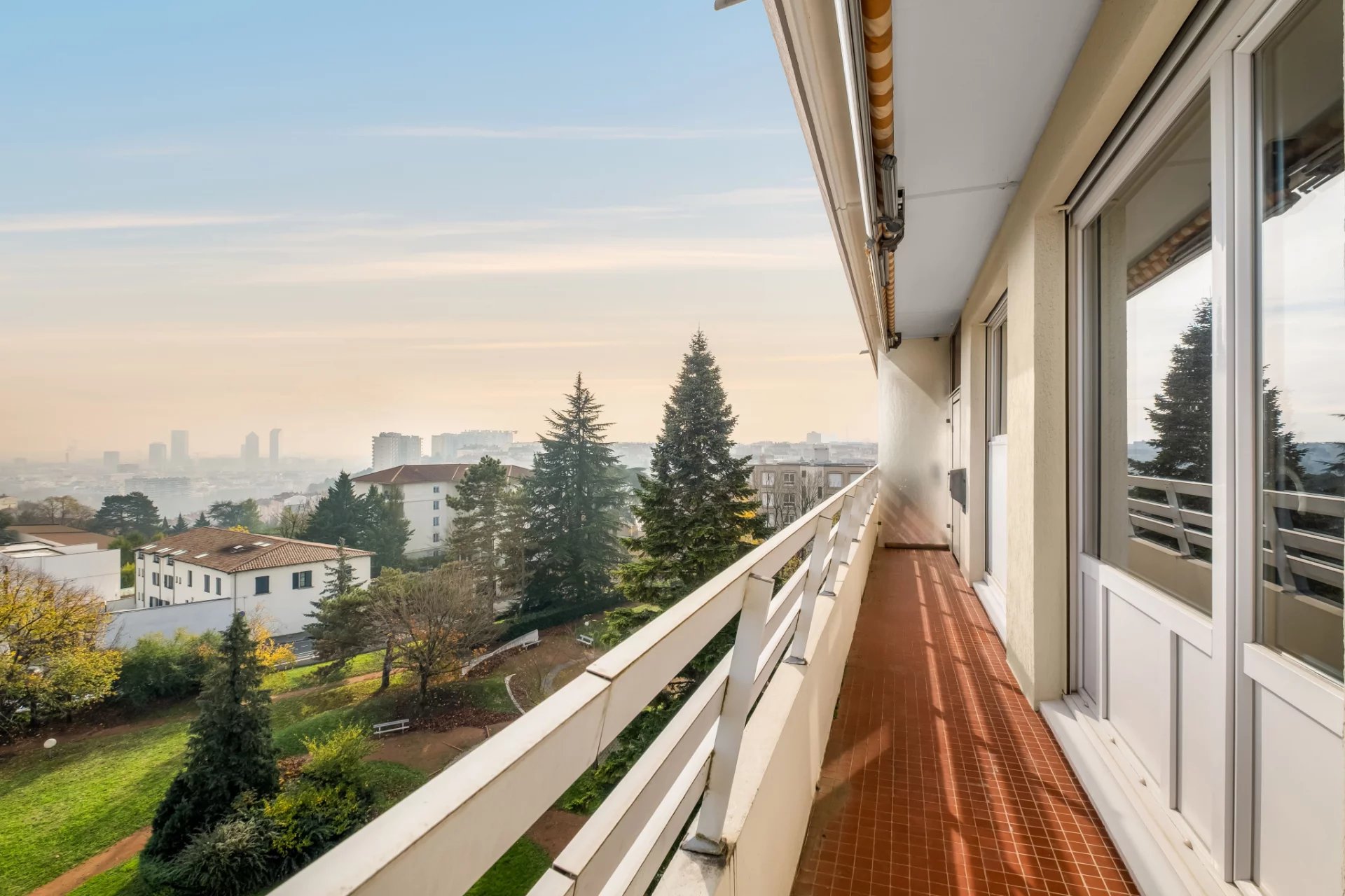Exclusivité Croix Rousse Immobilier. Nouveau. Découvrez un appartement exceptionnel de 120 m2 situé au 6e et dernier étage d'une résidence hautement recherchée à Caluire, parfaitement sécurisée, avec gardien, espaces verts soignés, parking privatif extérieur et stationnement invité. Ce dernier étage rare bénéficie d'une lumière plein Ouest grâce à ses immenses baies vitrées, d'une pièce de vie très agréable grâce à ses grandes baies vitrées, d'un balcon accessible depuis toutes les pièces, d'une cuisine aménagée et équipée, d'une suite parentale élégante avec sa salle de bain, de deux chambres généreuses, d'une salle d'eau et de toilettes séparés. Une place de stationnement extérieur et une cave viennent compléter ce bien d'exception. Traversant Est Ouest. À proximité immédiate du métro Cuire, des commerces, des écoles et de toutes les commodités, l'emplacement offre un cadre de vie recherché, pratique et raffiné. L'appartement a bénéficié d'une rénovation de qualité, permettant une installation immédiate dans une atmosphère élégante, lumineuse et parfaitement entretenue. Notre avis : un dernier étage de 120 m2 avec vues dégagées, baies vitrées, balcon intégral et emplacement stratégique au coeur de Caluire constitue une opportunité unique pour un acquéreur en quête d'espace, de lumière et de qualité. À noter : Compris dans les charges le chauffage urbain offrant un confort thermique stable, et l'eau froide et chaude, permettant une optimisation des coûts et une approche plus responsable qu'une production individuelle.