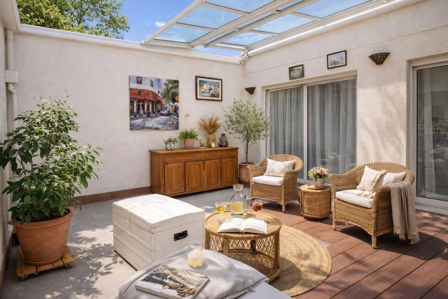 Un très beau patio de 25 m², doté d’un toit amovible, complète ce bien et peut être aménagé en salle de sport, espace de détente ou simplement pour profiter des journées ensoleillées en toute intimité.