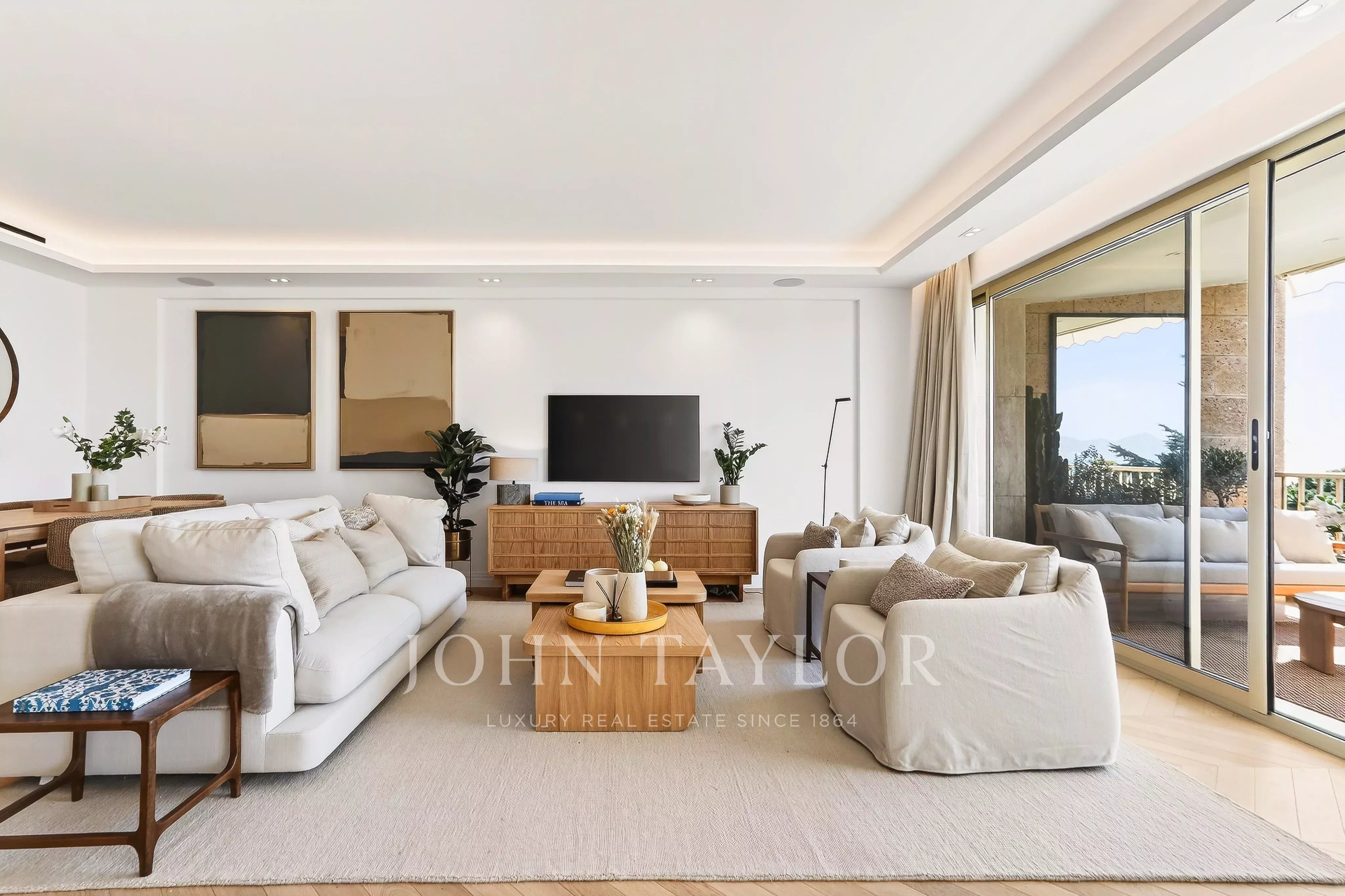 L’appartement se compose d’un vaste double séjour lumineux avec une somptueuse cuisine ouverte, s’ouvrant sur une terrasse exposée sud-ouest offrant une agréable vue sur la verdure et la baie de Cannes. Il dispose également de deux chambres, chacune avec sa salle de bains en suite.