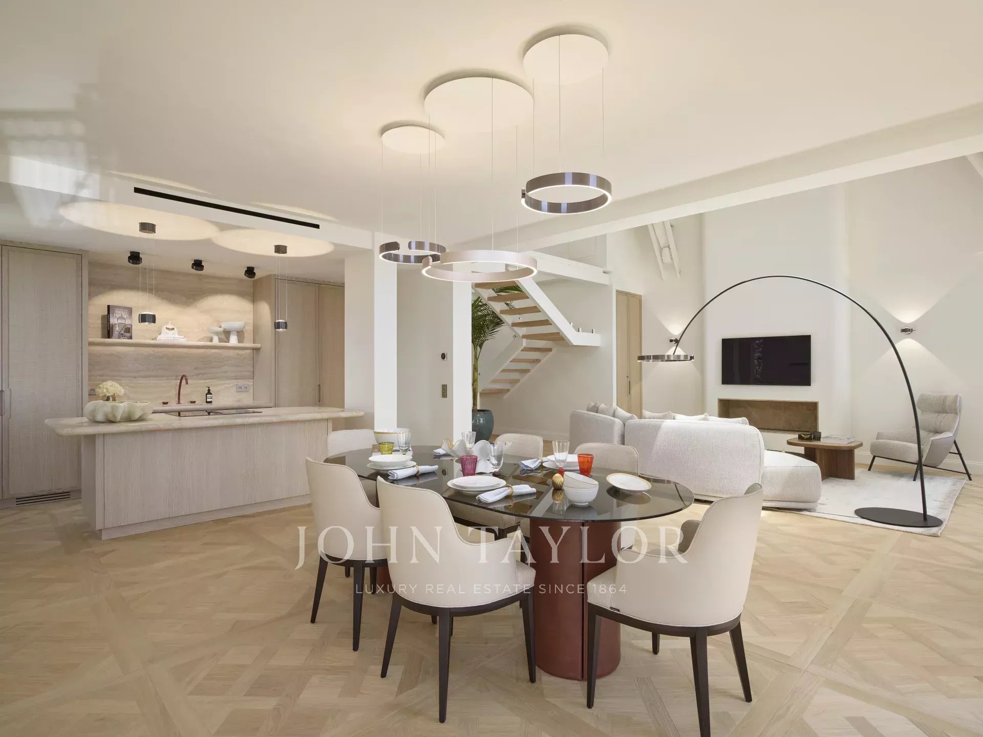 Dès l'entrée, l'espace et la lumière se dégagent grâce à la hauteur sous plafond impressionnante du séjour, et un magnifique escalier relie les deux niveaux de ce duplex.