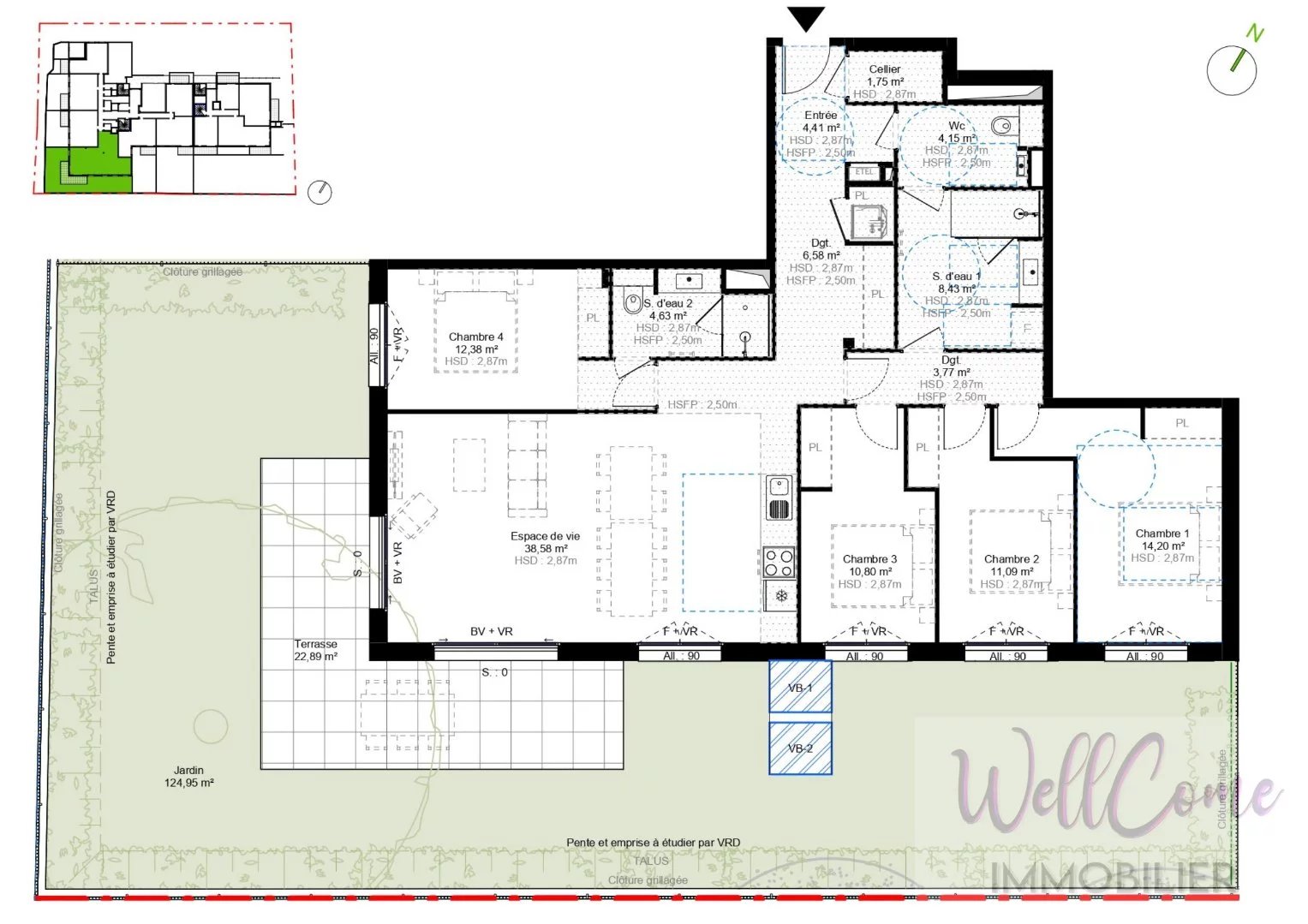 578 000 €Appartement neuf T5 de 120,76 m² en rez-de-jardin coté SUD + 2 Box Challes-les-Eaux À Challes-les-Eaux, sur lAvenue de Chambéry à seulement 400 m du centre-ville dans la nouvelle résidence « Belle Horizon », découvrez cet appartement neuf 3 pièces de 66,82 m² situé au 1er étage sur 3 et bénéficiant dune belle exposition Sud. La résidence se compose de deux bâtiments à taille humaine (2 étages + attique), à larchitecture élégante et contemporaine, conçus pour sintégrer harmonieusement dans leur environnement naturel. Offre commerciale du 15/02/26 au 31/03/26 : Frais de notaire OFFERTS et 2.000 de REMISE par pièce sur un grand nombre de logements. Lappartement T5 comprend : -Entrée / 2 Dégagements : 14,76m² -Séjour/Cuisine : 38,58m² côté Sud-Ouest avec accès terrasse et jardin de 147,84m² -1 Chambre avec salle d'eau et WC : 17,01m² -3 Chambres : 10,80m², 11,09m², 14,20m² -Salle d'eau 8,43m² et WC indépendant : 4,15m² -Cellier interieur : 1,75m² Vendu avec 2 garages au sous-sol. Présence de locaux vélos dans la résidence. Dautres appartements (du T2 au T5) sont disponibles dans la résidence Pour plus dinformations et pour réserver votre futur appartement, contactez votre agence WellCome Immobilier ! Frais de notaires réduits Livraison : 4ème Trimestre 2027 Programme conforme RE 2020, seuil 2022 Éligible : Accession Libre, Jeanbrun, Zone B1, LMNP Prix TTC et Honoraires à charge vendeur TTC Bien soumis au statut juridique de la Copropriété. Nb de lots : 36. Pas de procédure en cours. Surface CARREZ : 120.76 m²
