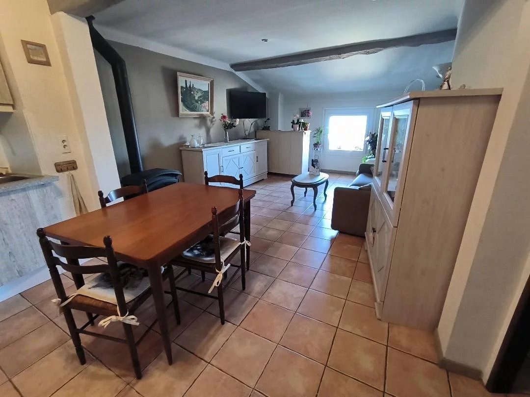 Séjour lumineux de 28 m² avec cuisine équipée, poêle à bois aux normes et large ouverture sur la vue. • Au même niveau, deux chambres spacieuses et lumineuses vous attendent, accompagnées d’une salle de bain avec wc et sèche serviettes.
