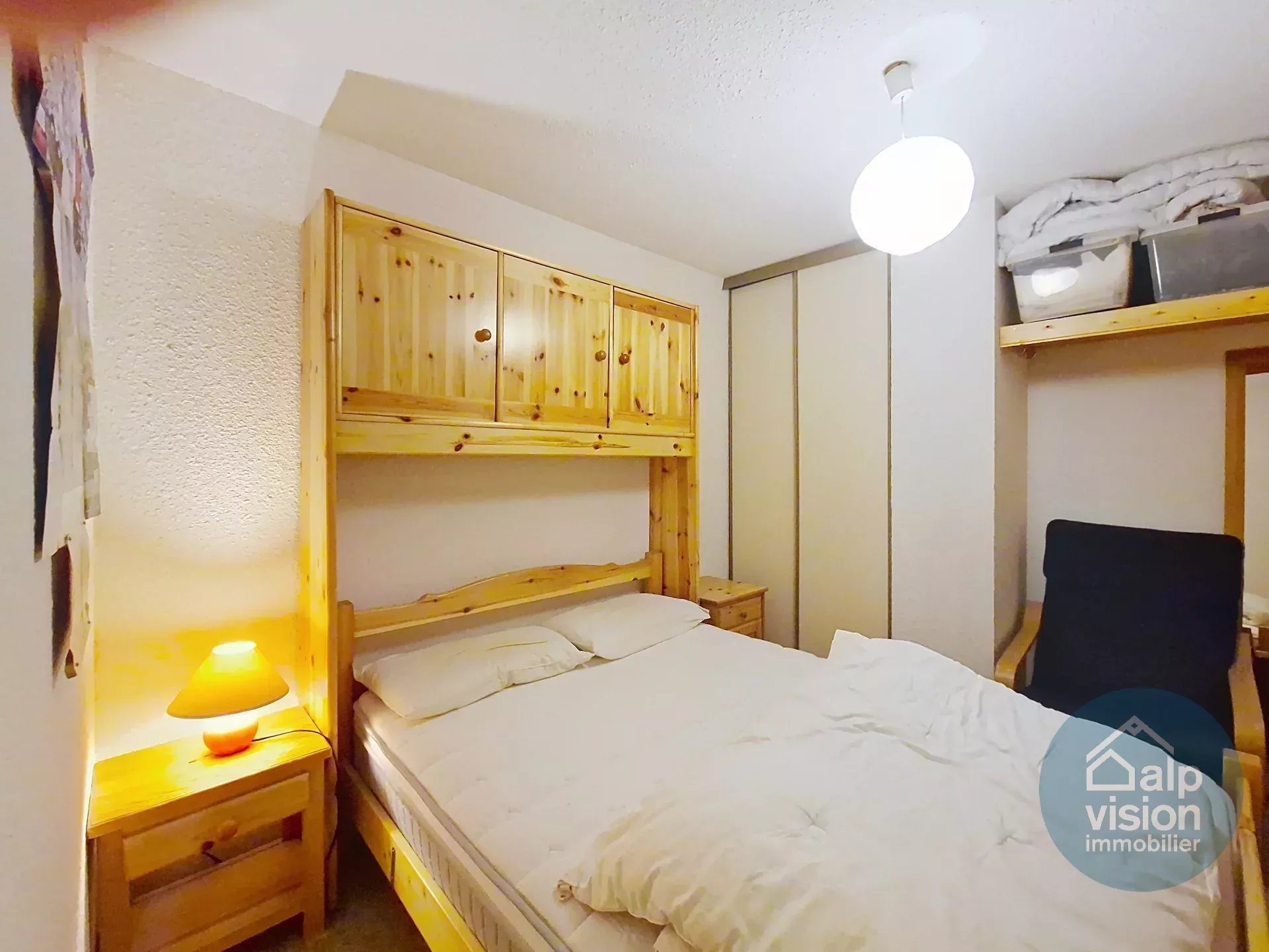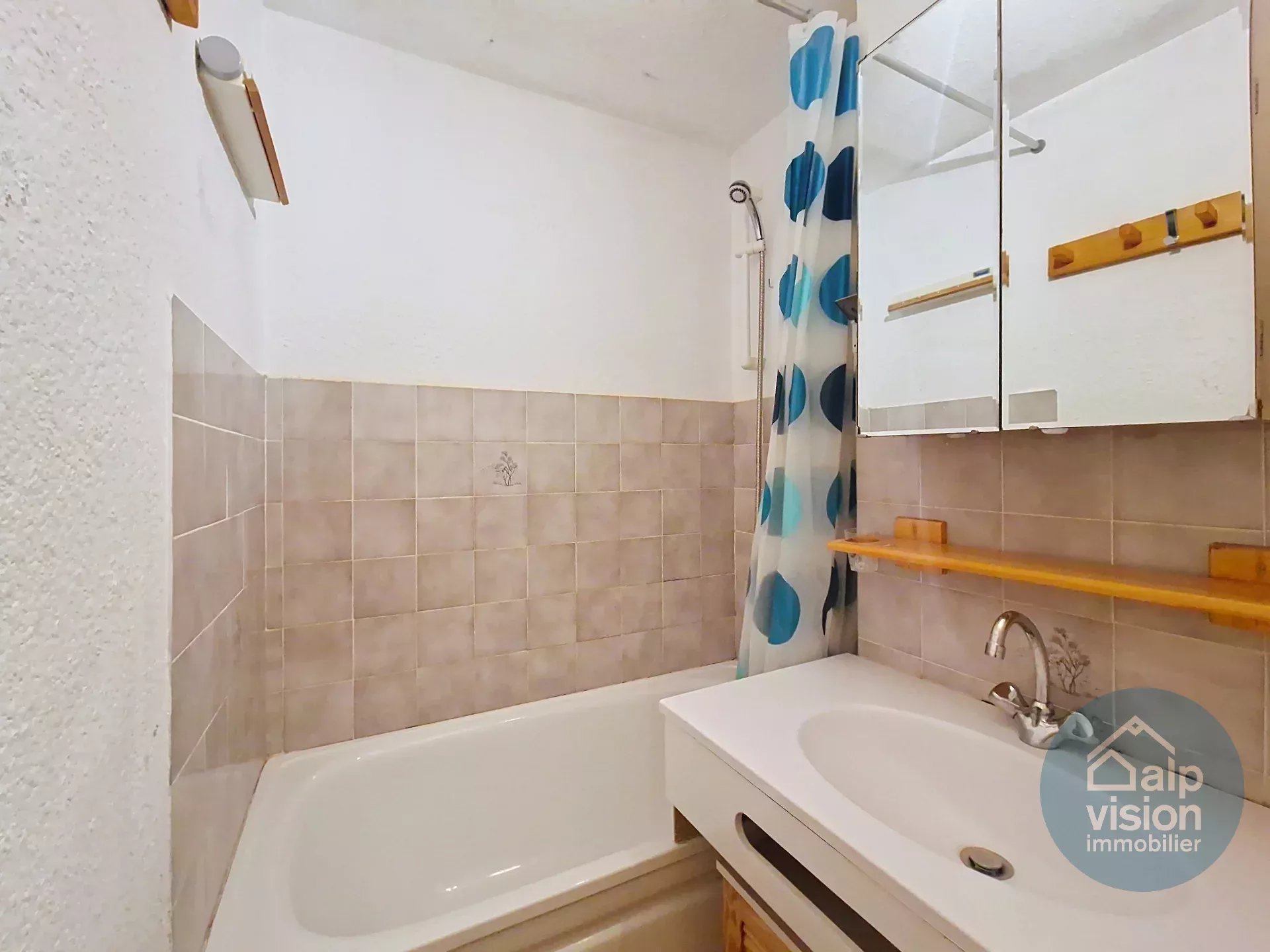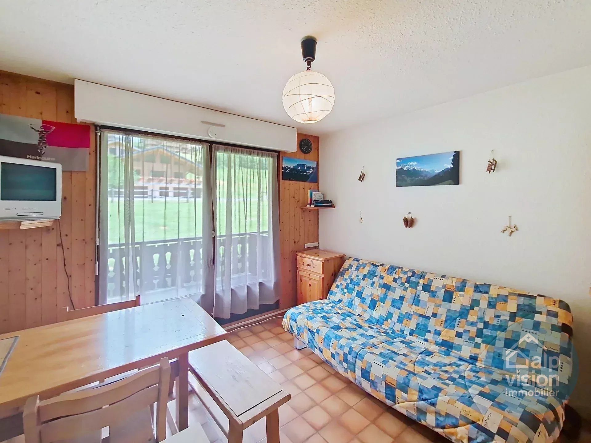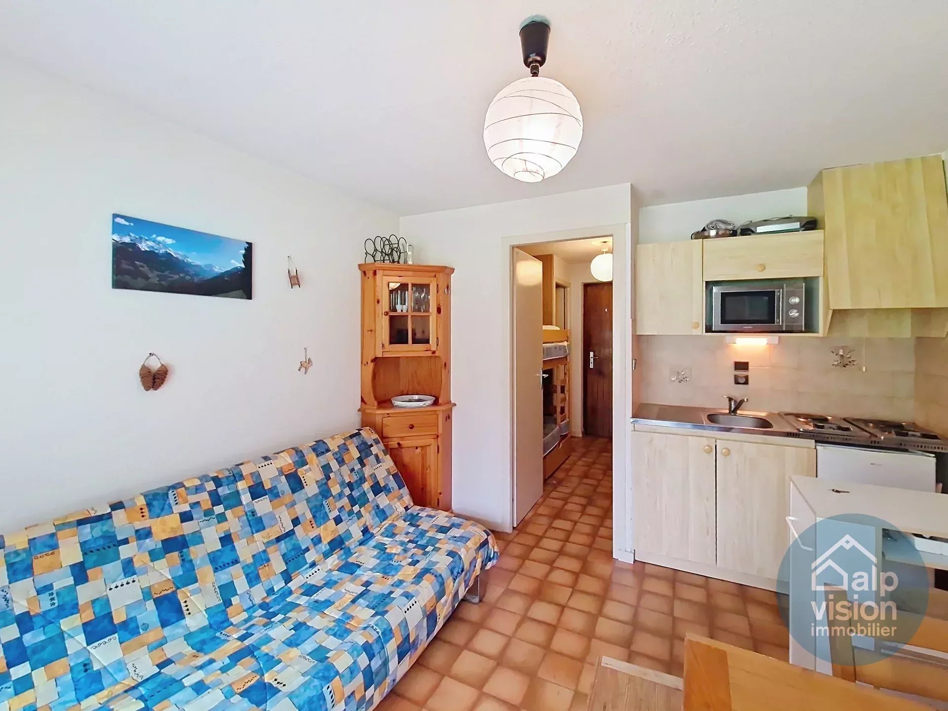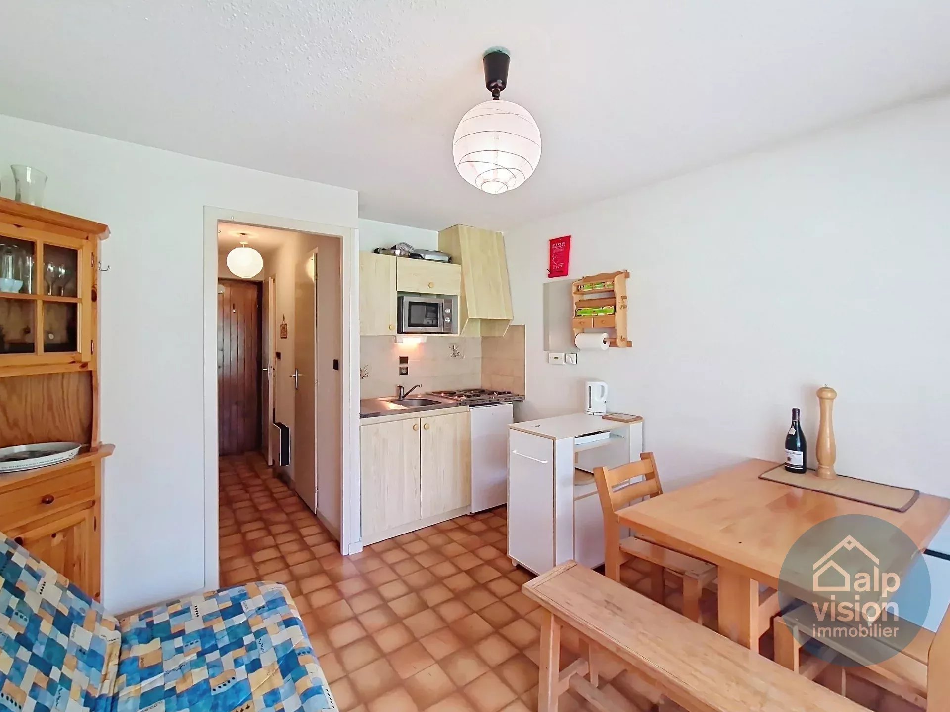 Appartement de 27 m² se composant d'une entrée avec coin montagne, une chambre avec placard, une salle de bains, un WC indépendant, un séjour avec kitchenette équipée et accès terrasse exposé Sud/Est.