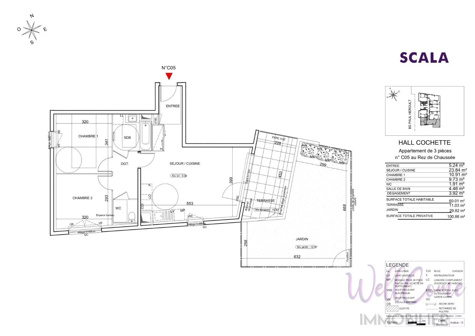 305 000 €À Cognin, aux portes de Chambéry, à seulement 7 minutes du centre-ville, découvrez la nouvelle résidence « SCALA », idéalement située dans un secteur résidentiel recherché, à proximité immédiate des commodités (commerces, écoles, transports) et offrant de belles vues dégagées sur les reliefs montagneux. Profitez dune offre en cours avec frais de notaire réduits, pour une livraison prévue au 2ème trimestre 2028, actable dès maintenant. Cette résidence à larchitecture élégante se compose de 5 bâtiments de 6 étages maximum, parfaitement intégrés dans un environnement verdoyant avec cur dîlot paysager, offrant un cadre de vie agréable entre nature et ville. Nous vous proposons ici un appartement 3 pièces de 60 m², situé au RDC, conçu pour offrir confort, fonctionnalité et luminosité naturelle. Il se compose de : Une entrée (5,24 m²) Un séjour avec cuisine ouverte (23,84 m²) Une chambre 1 (10,91 m²) Une chambre 2 (9,73 m²) Une salle de bain (4,46m²) WC (m 1,91²) Dégagement (3,92m²) Vendu avec box électrique privative en sous-sol, lappartement bénéficie également dun accès à un local à vélos au sein dune résidence sécurisée. Idéal pour habiter, réaliser un premier achat, disposer dun pied-à-terre ou investir dans une ville dynamique aux portes des Alpes. Contactez-nous dès maintenant pour en savoir plus et réserver votre futur appartement parmi les premiers lots disponibles ! Programme certifié NF Habitat et conforme à la RT 2012. Éligible aux dispositifs Pinel (zone B1), PTZ, LLI, LMNP et LMP. Bien soumis au statut de la copropriété 140 lots (hors annexes). Aucune procédure en cours. Prix TTC Honoraires à la charge du vendeur. Surface CARREZ : 60.01 m²