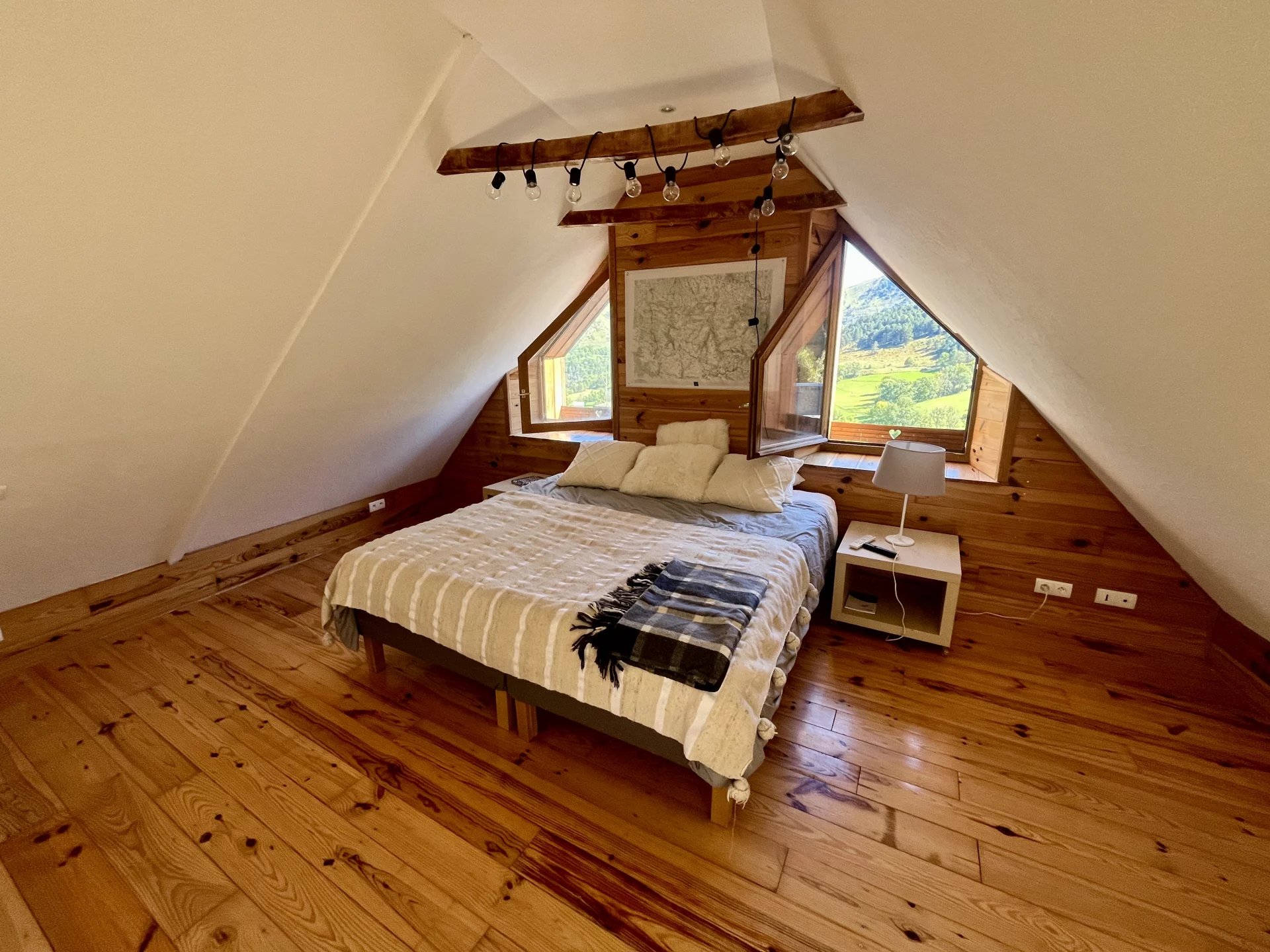 * À l’étage : deux suites parentales avec salles d’eau et WC, bénéficiant de plafonds cathédrale et de charpentes apparentes