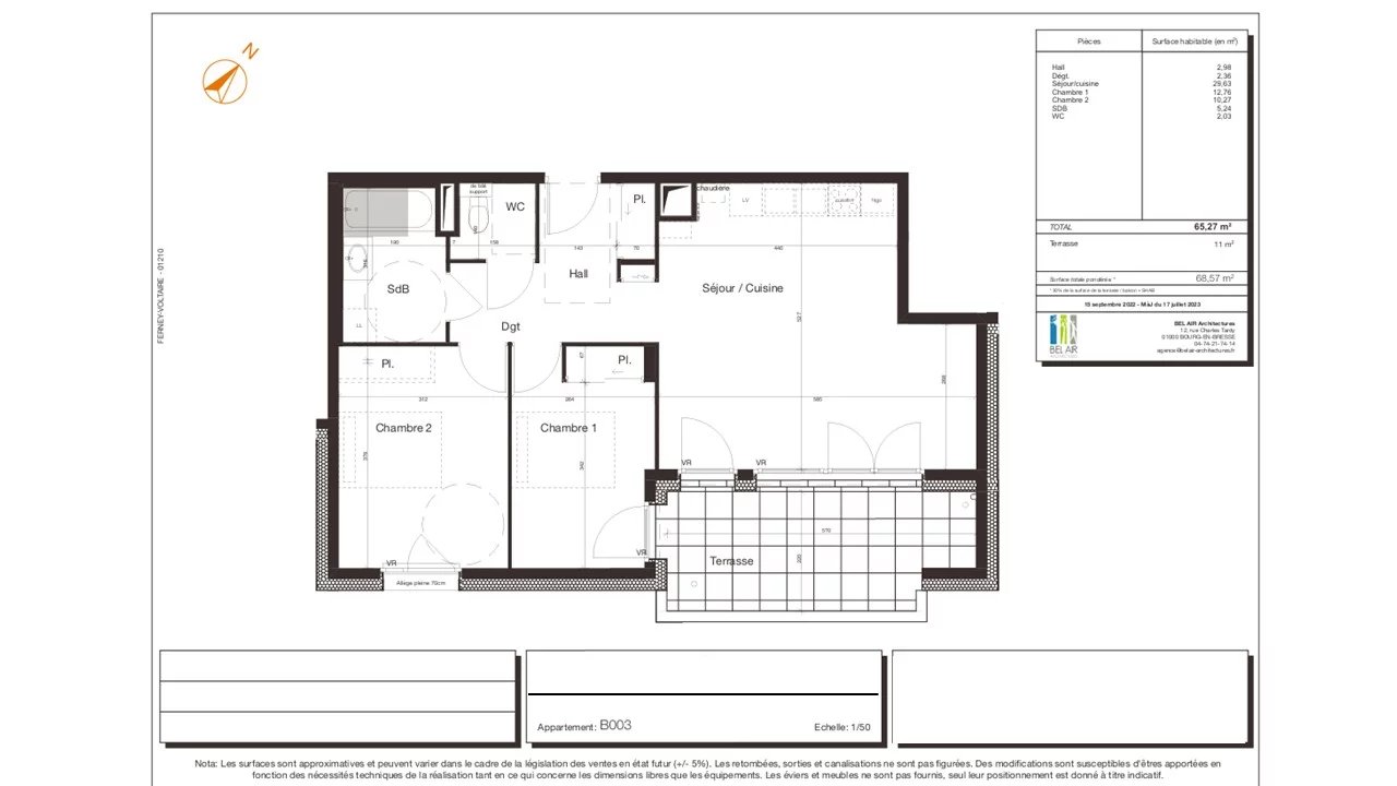 Au coeur de la dynamique ville de Ferney-Voltaire, dans un quartier résidentiel réputé calme et proche des commodités, nous vous proposons cet appartement neuf 3 pièces de 65.27 m² en rez-de-chaussée, composé d'une entrée avec placard, d'un séjour/cuisine de 29.63 m² donnant sur balcon de 11 m², de deux chambres dont une avec placard, d'une salle de bains et d'un wc séparé.