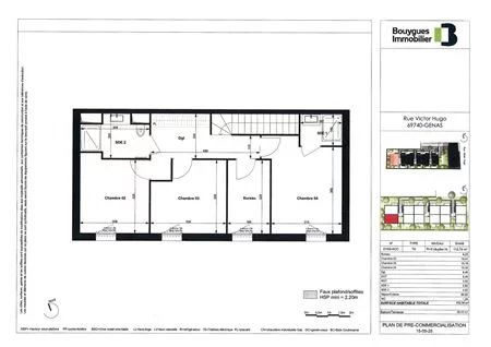 Il se compose d'une entrée, d'une belle pièce de vie avec cuisine ouverte de 40.45 m², de trois chambres, d'une salle de bains, d'unes salle d'eau et d'un WC.