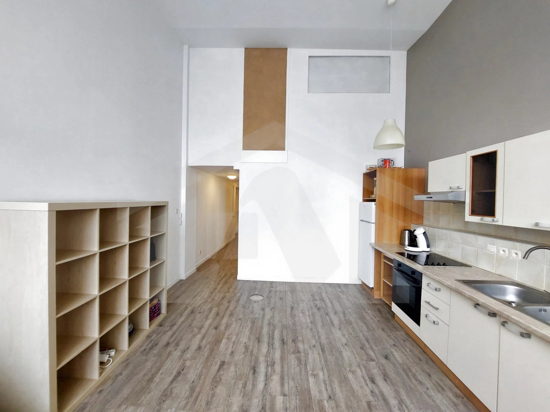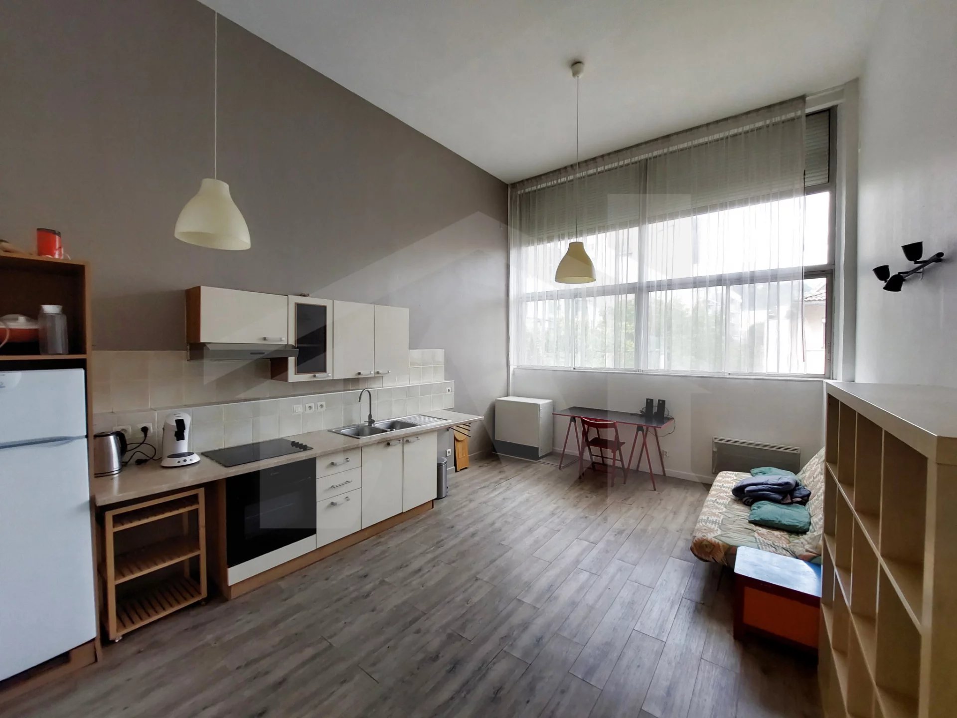 L'espace salon-cuisine offre une agréable pièce de vie baignée de lumière, grâce à ses grandes fenêtres qui laissent largement entrer le soleil. La grande hauteur sous plafond donne une véritable sensation d'espace, accentuée par l'architecture atypique du bâtiment, héritée de son passé industriel.