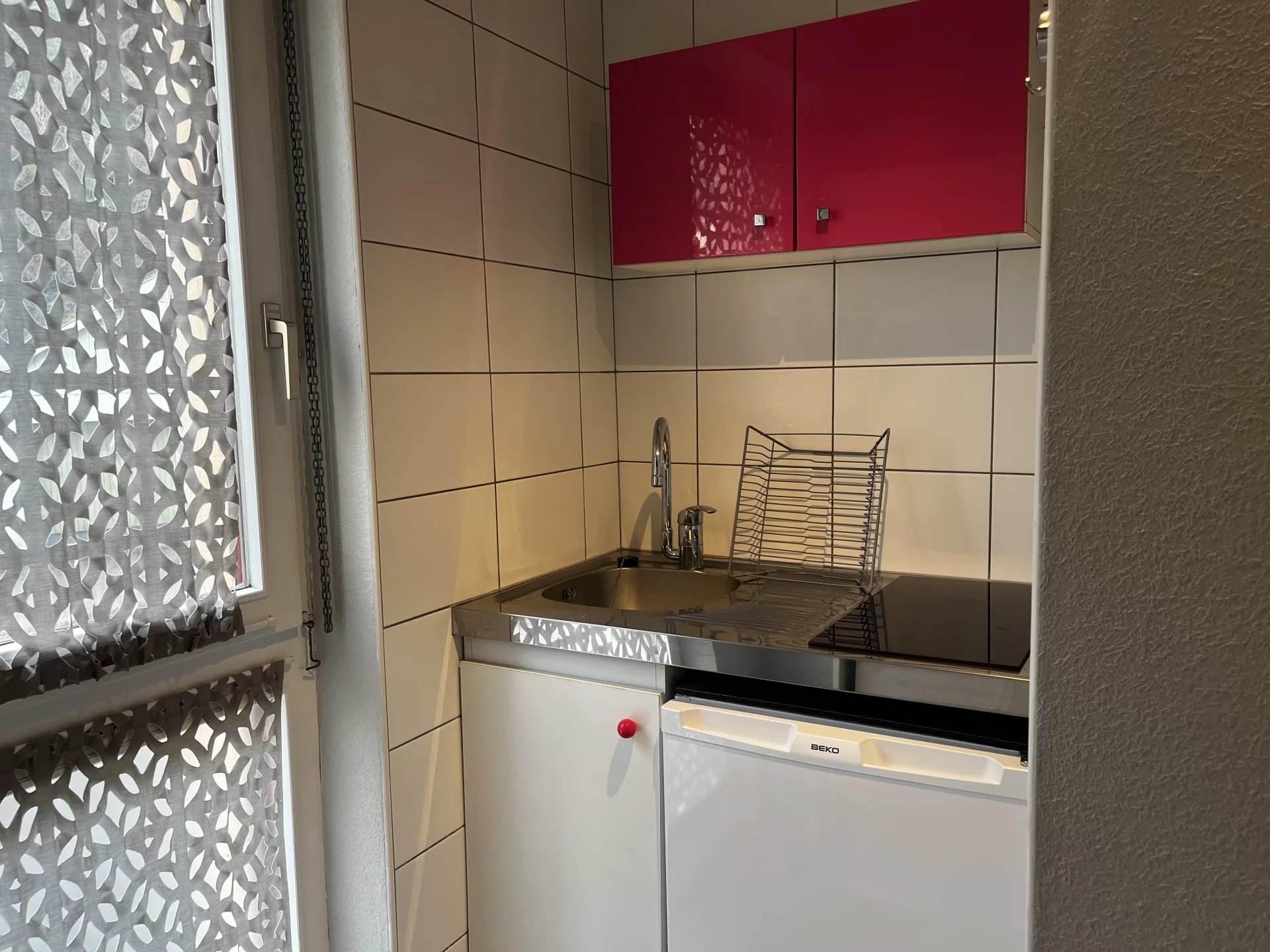 - Un espace kitchenette avec évier en inox, une plaque 2 feux et un frigo