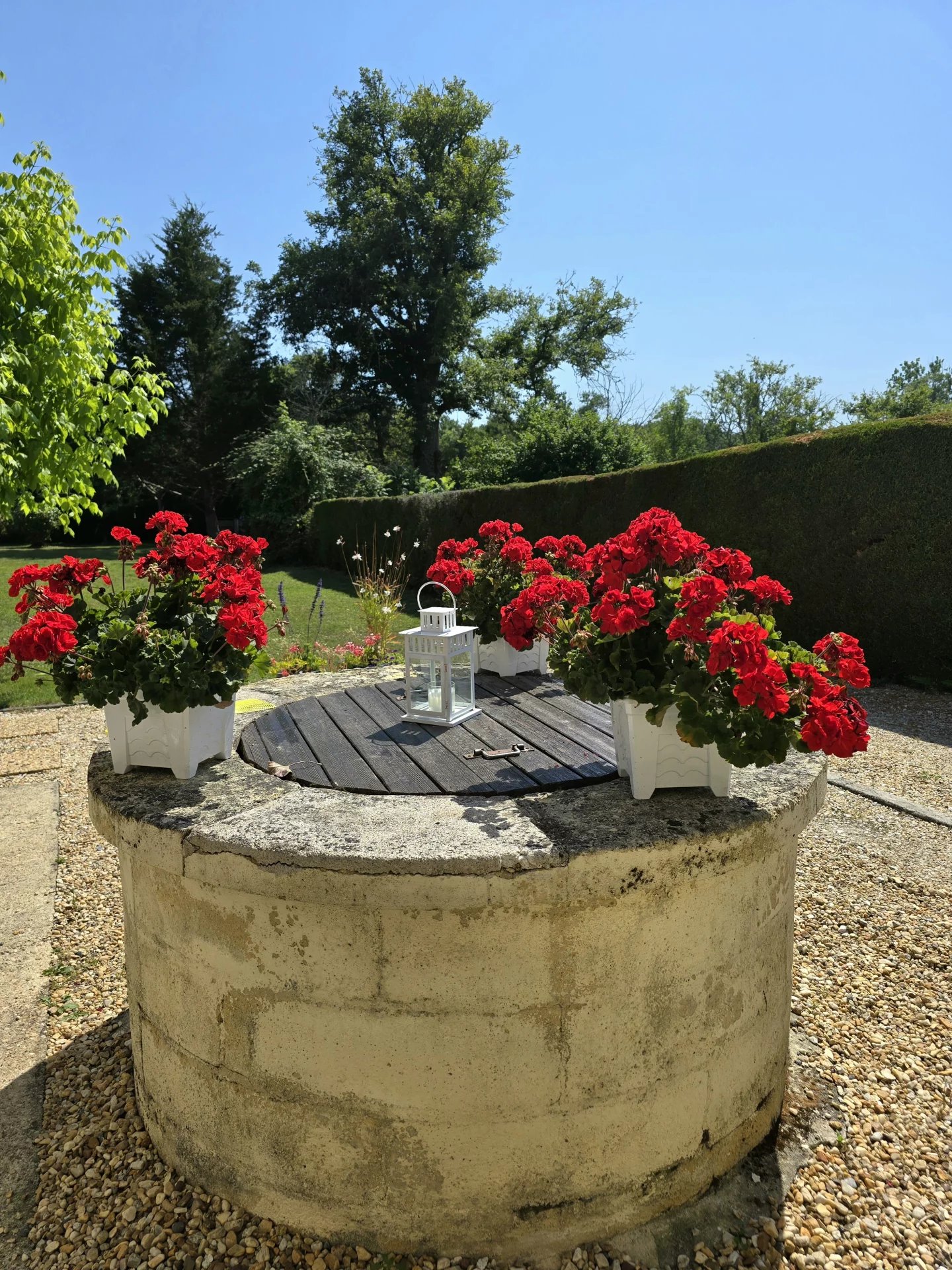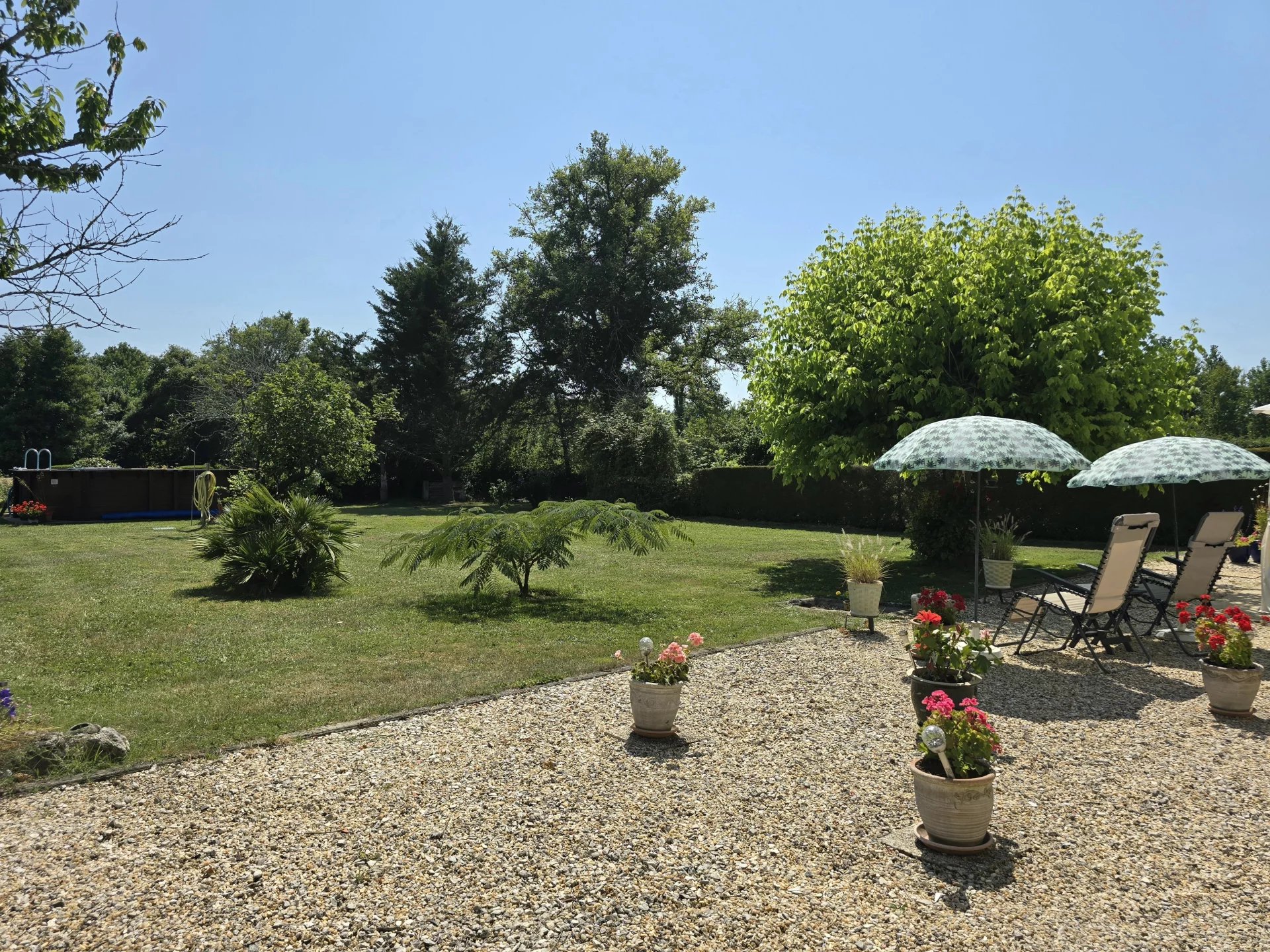 Très beau jardin facile d'entretien avec piscine hors sol aménagée, puits et barbecue.