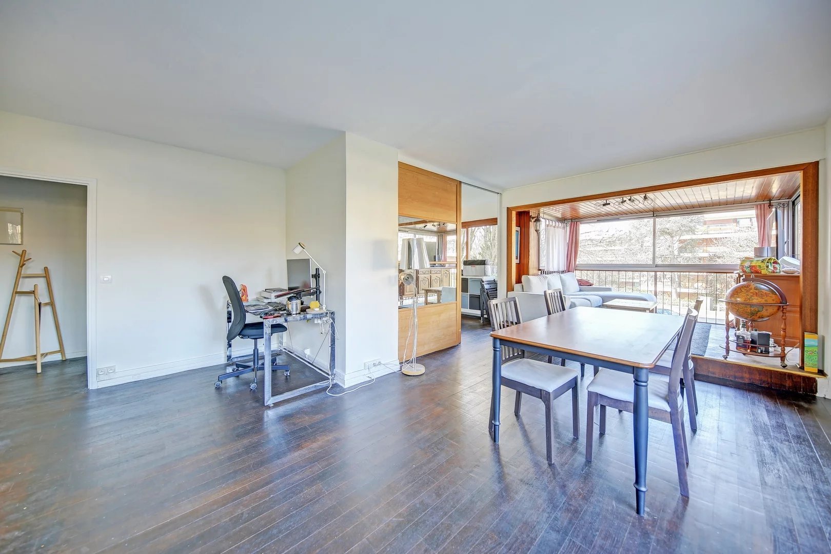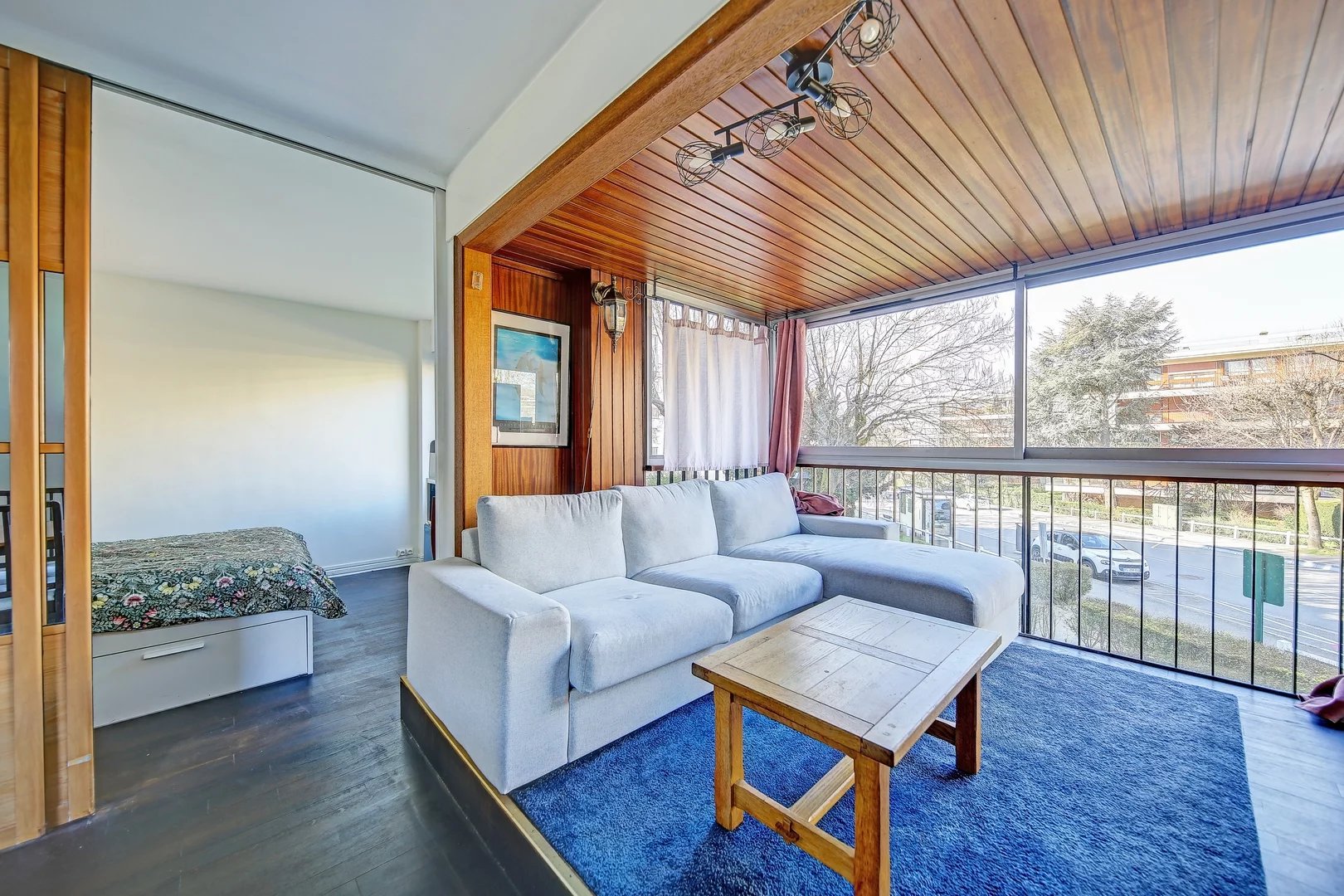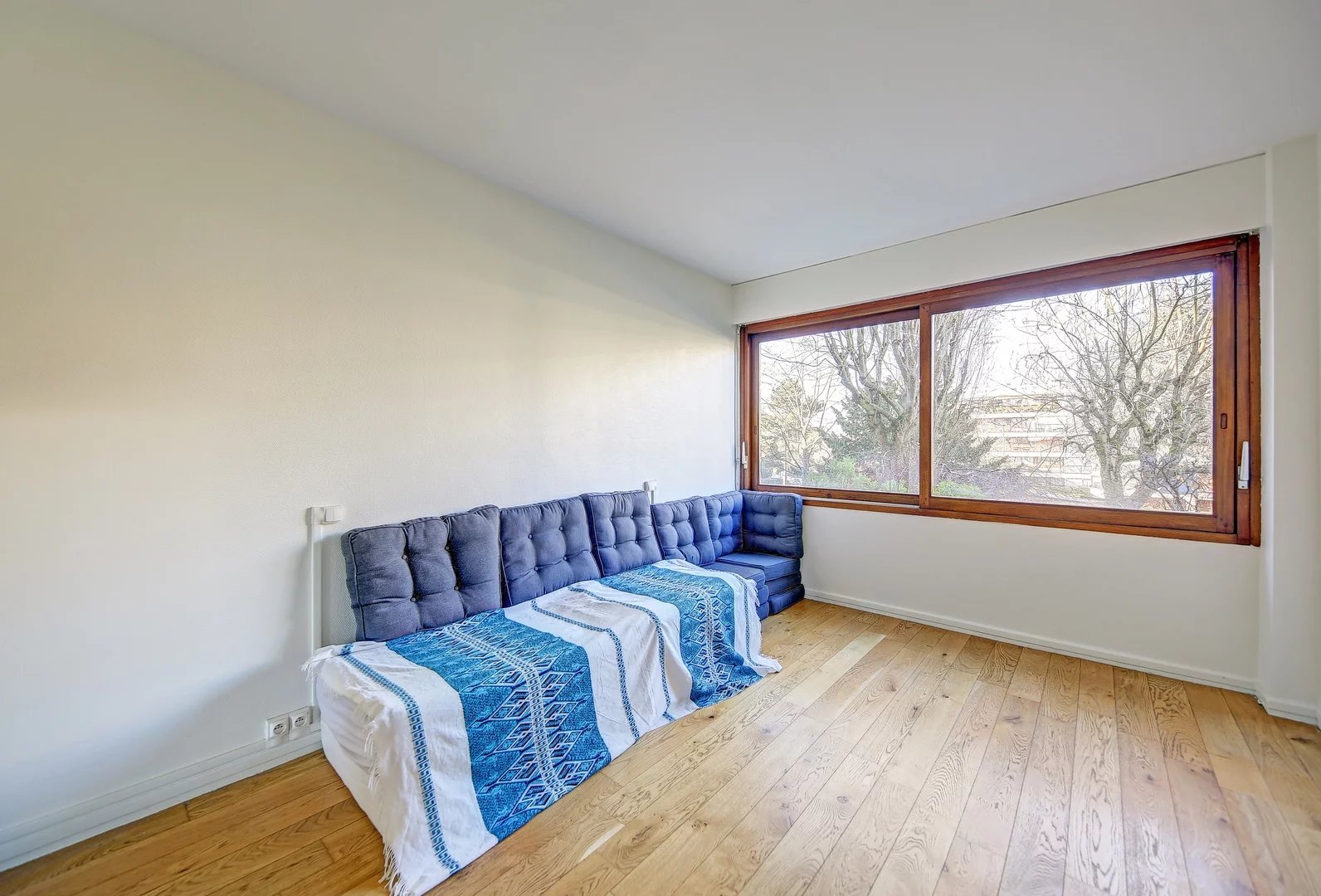Parquet massif, double vitrage, volets roulants électriques dans le salon.