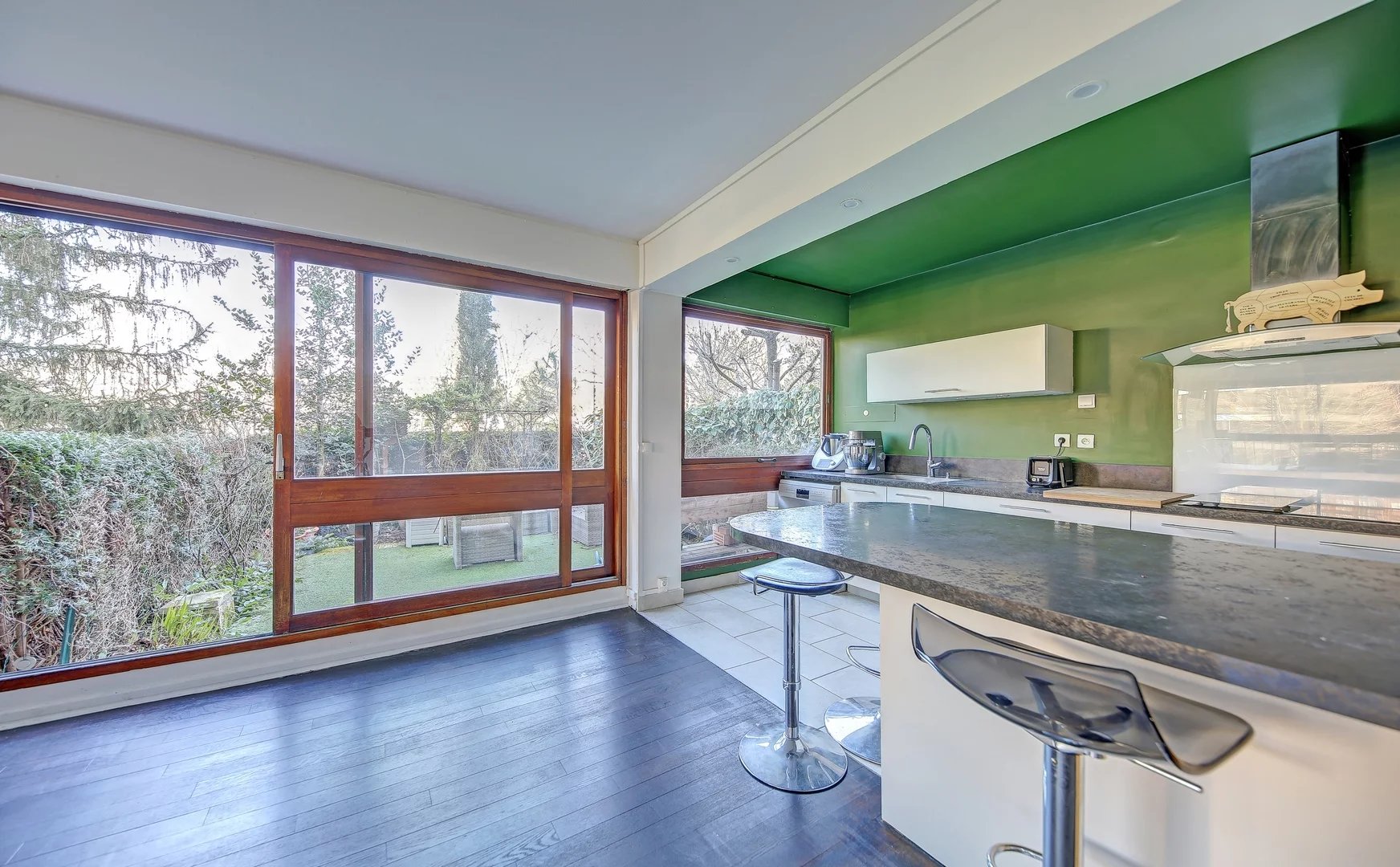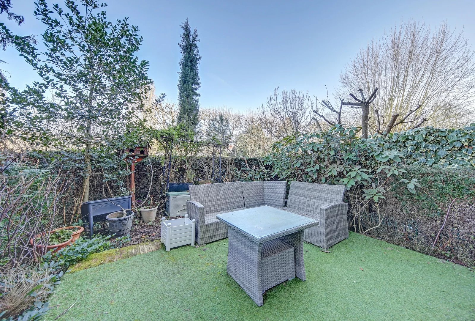 Un espace extérieur rare et arboré, accessible directement depuis le séjour. Un véritable prolongement de la pièce de vie, parfait pour se détendre, recevoir ou partager des moments conviviaux en plein air.