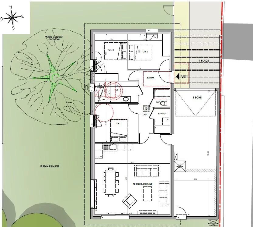 1) Un permis purgé, libre de tout recours pour une maison sera de plain-pied, de 90m² avec extension possible conformément aux règles en vigueur, garage de 35m² et place de stationnement privative.