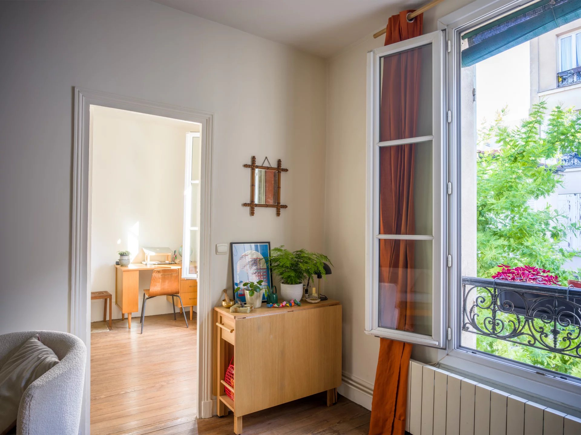 L’appartement se compose d’une entrée desservant une cuisine toute équipée, ouverte sur un séjour lumineux exposé Est et donnant sur une cour végétalisée.