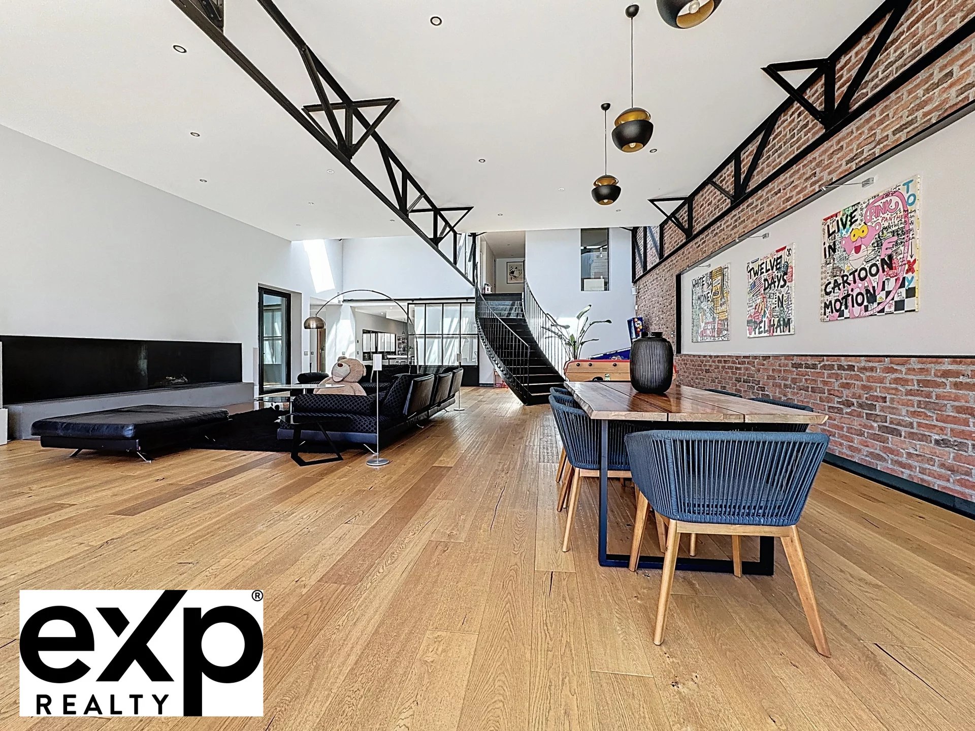 Séjour monumental de 114m² baigné de lumière naturelle grâce aux verrières, murs de brique brute et cheminée monumentale dans un style épuré et haut de gamme.