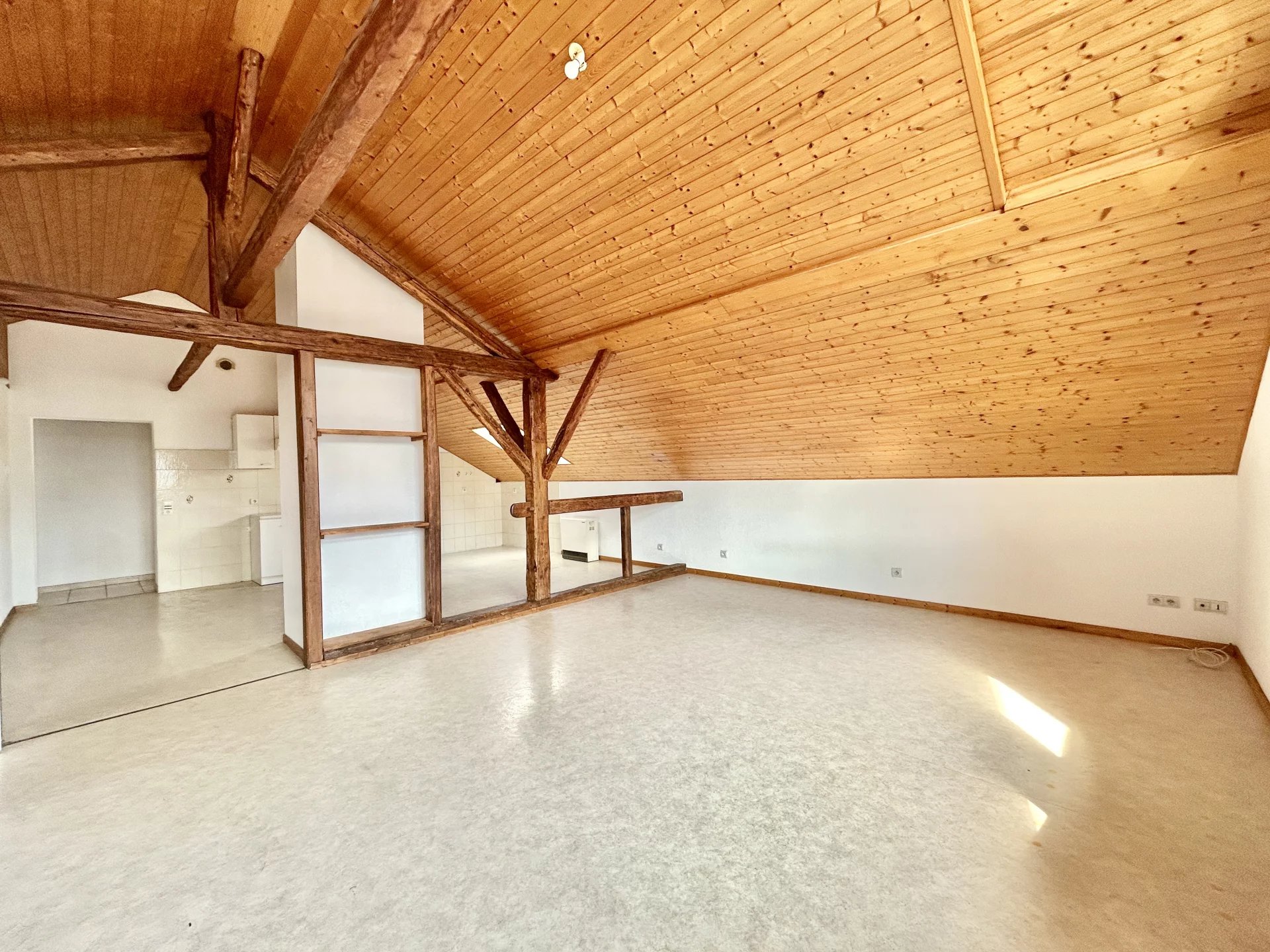 Véritable coup de coeur pour les amateurs de cachet, ce logement bénéficie d’une belle hauteur sous plafond et de poutres apparentes dans la pièce de vie, apportant authenticité et atmosphère cosy.