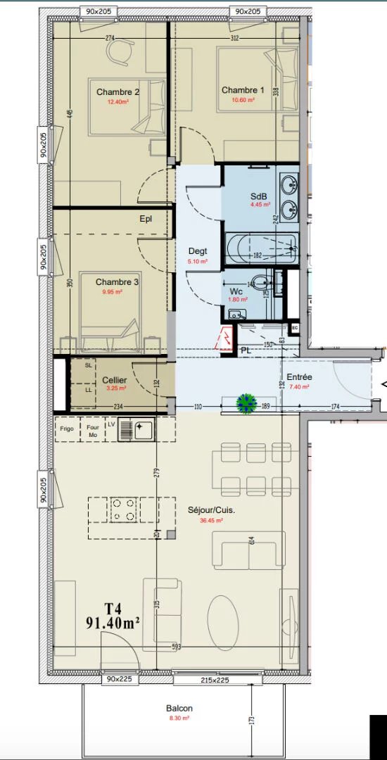Appartement au 3ème étage composé d'une entrée avec placard, accès direct sur une grande pièce-à-vivre de 45m2 + un beau balcon orienté plein Sud, un WC suspendu indépendant, une salle de bain et 3 chambres
