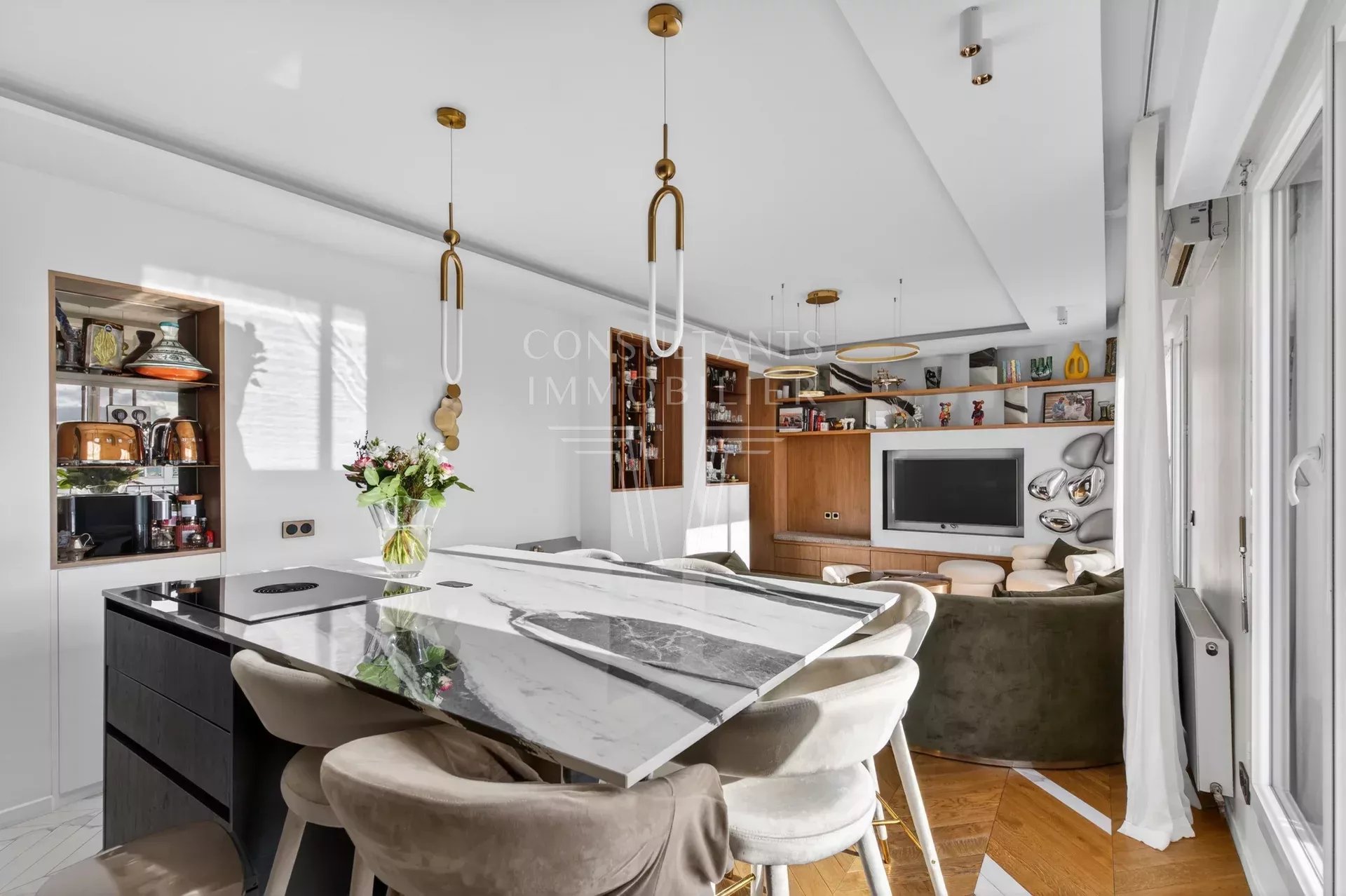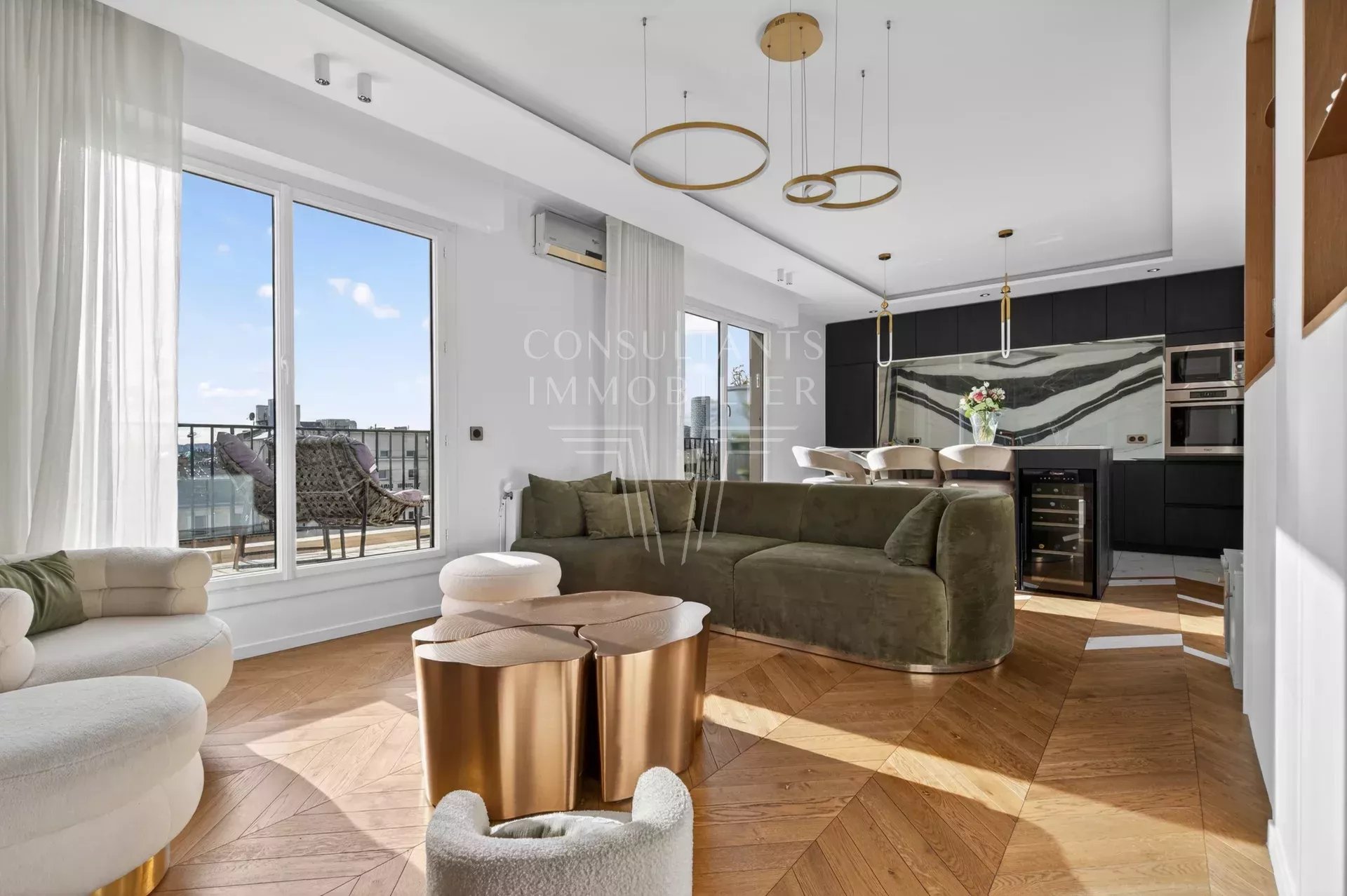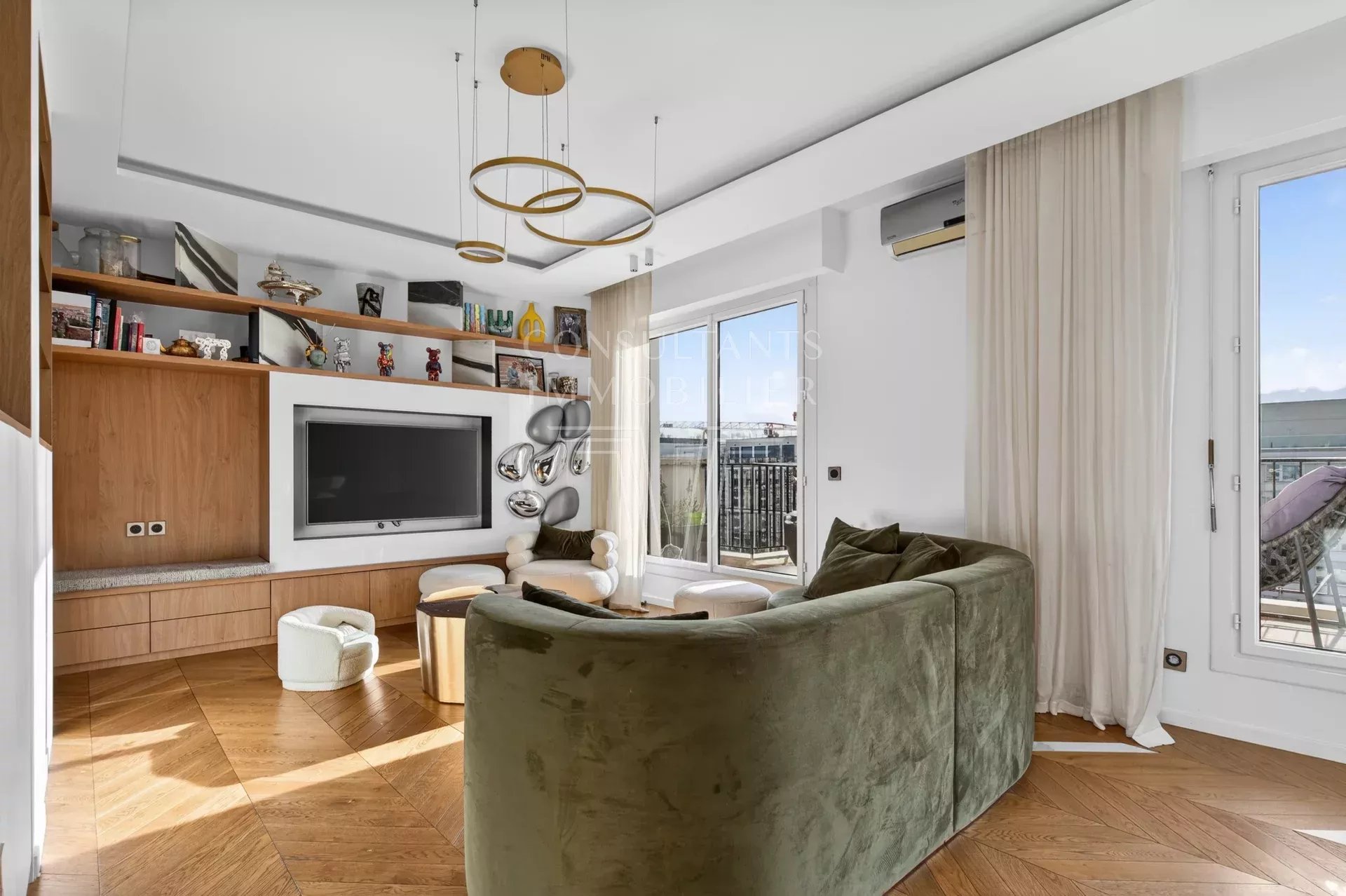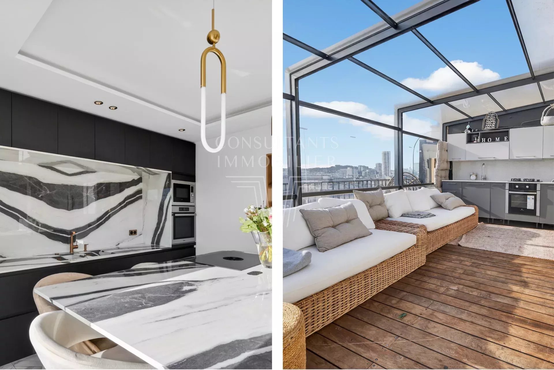 1 890 000 €VUES PANORAMIQUES. DERNIER ETAGE TERRASSE. Appartement situé au 8ème et 9ème étage, d'un immeuble récent, offrant des vues panoramiques de tous les cotés. Appartement REFAIT PAR ARCHITECTE, traversant et extrêmement lumineux. D'une surface de 91m² avec 111m² d'extérieur. Il se compose d'une entrée, deux chambres avec de nombreux rangements, deux salles de douche dont une avec toilettes, des toilettes invités, un séjour exposé plein sud, cuisine américaine toute équipée, cave à vin, ilot central et un terrasse de plain pied de 20m² au niveau du séjour. A l'étage supérieur, accessible par escalier privatif, une véranda de 28m² avec une cuisine murale, aménagée puis tout le toit terrasse au calme, sans aucun vis à vis et vues exceptionnelles !