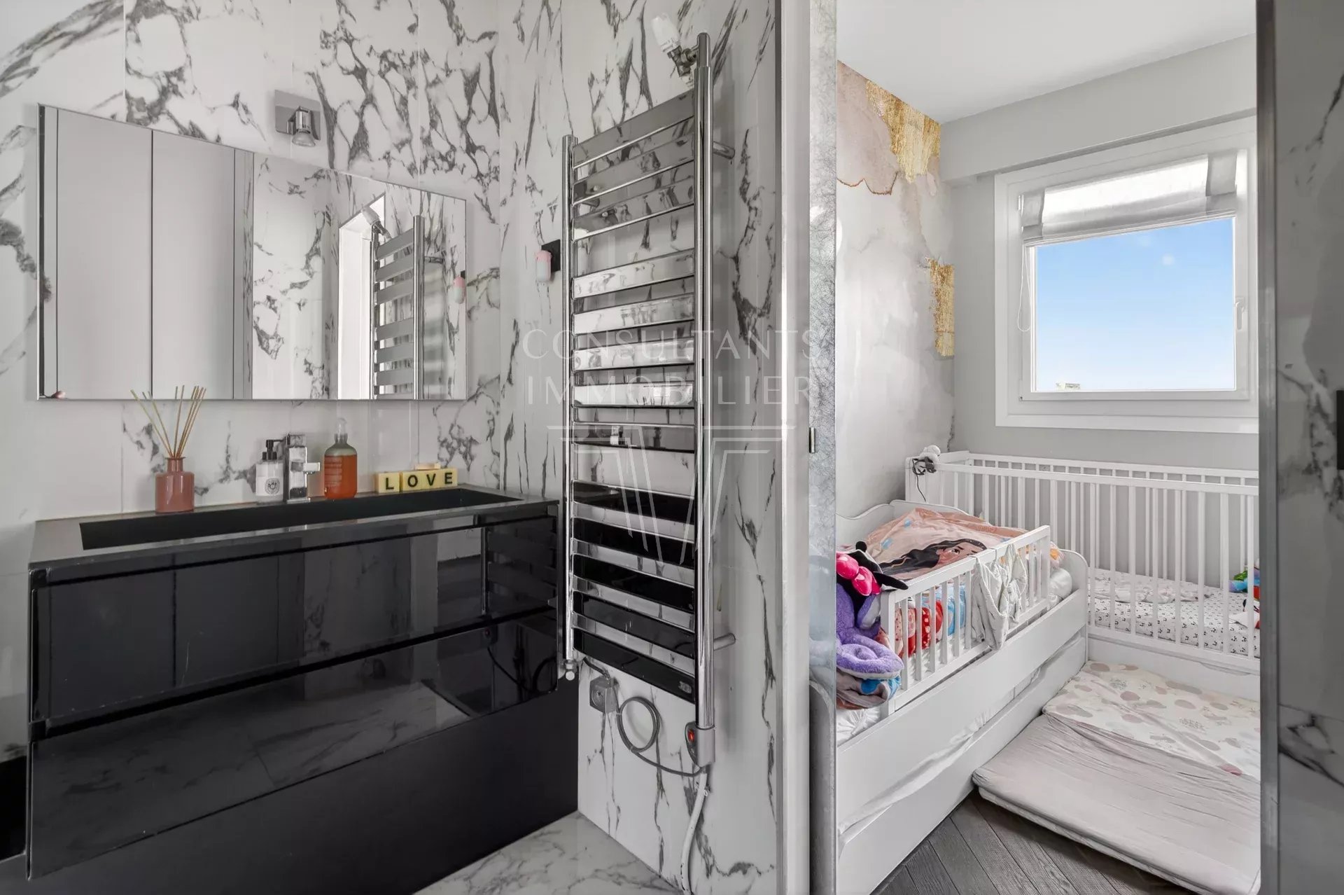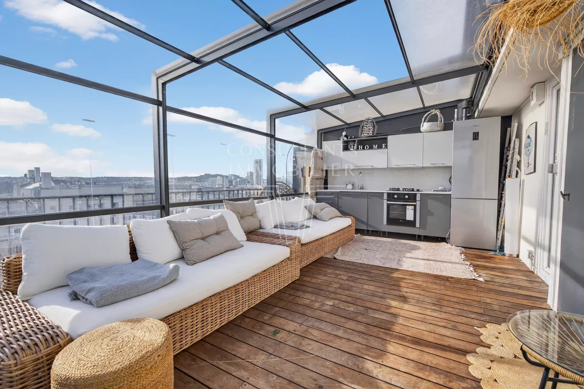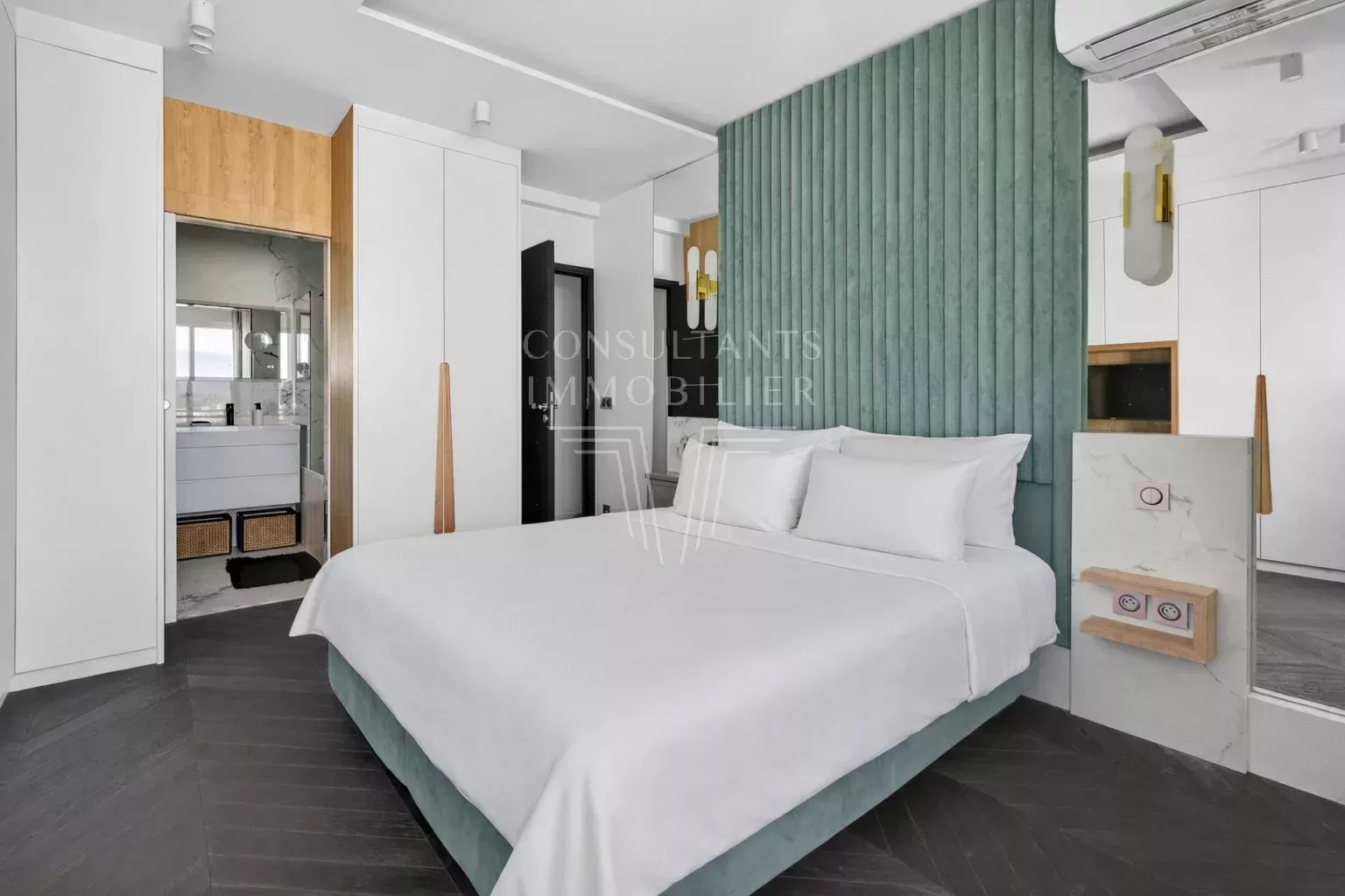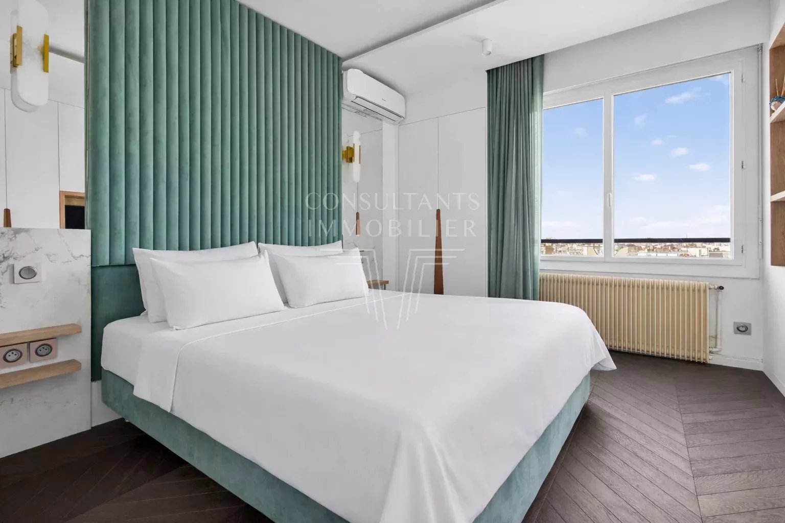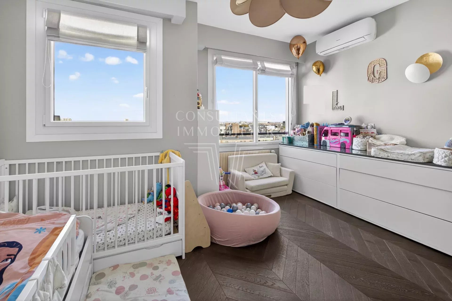 1 890 000 €VUES PANORAMIQUES. DERNIER ETAGE TERRASSE. Appartement situé au 8ème et 9ème étage, d'un immeuble récent, offrant des vues panoramiques de tous les cotés. Appartement REFAIT PAR ARCHITECTE, traversant et extrêmement lumineux. D'une surface de 91m² avec 111m² d'extérieur. Il se compose d'une entrée, deux chambres avec de nombreux rangements, deux salles de douche dont une avec toilettes, des toilettes invités, un séjour exposé plein sud, cuisine américaine toute équipée, cave à vin, ilot central et un terrasse de plain pied de 20m² au niveau du séjour. A l'étage supérieur, accessible par escalier privatif, une véranda de 28m² avec une cuisine murale, aménagée puis tout le toit terrasse au calme, sans aucun vis à vis et vues exceptionnelles !