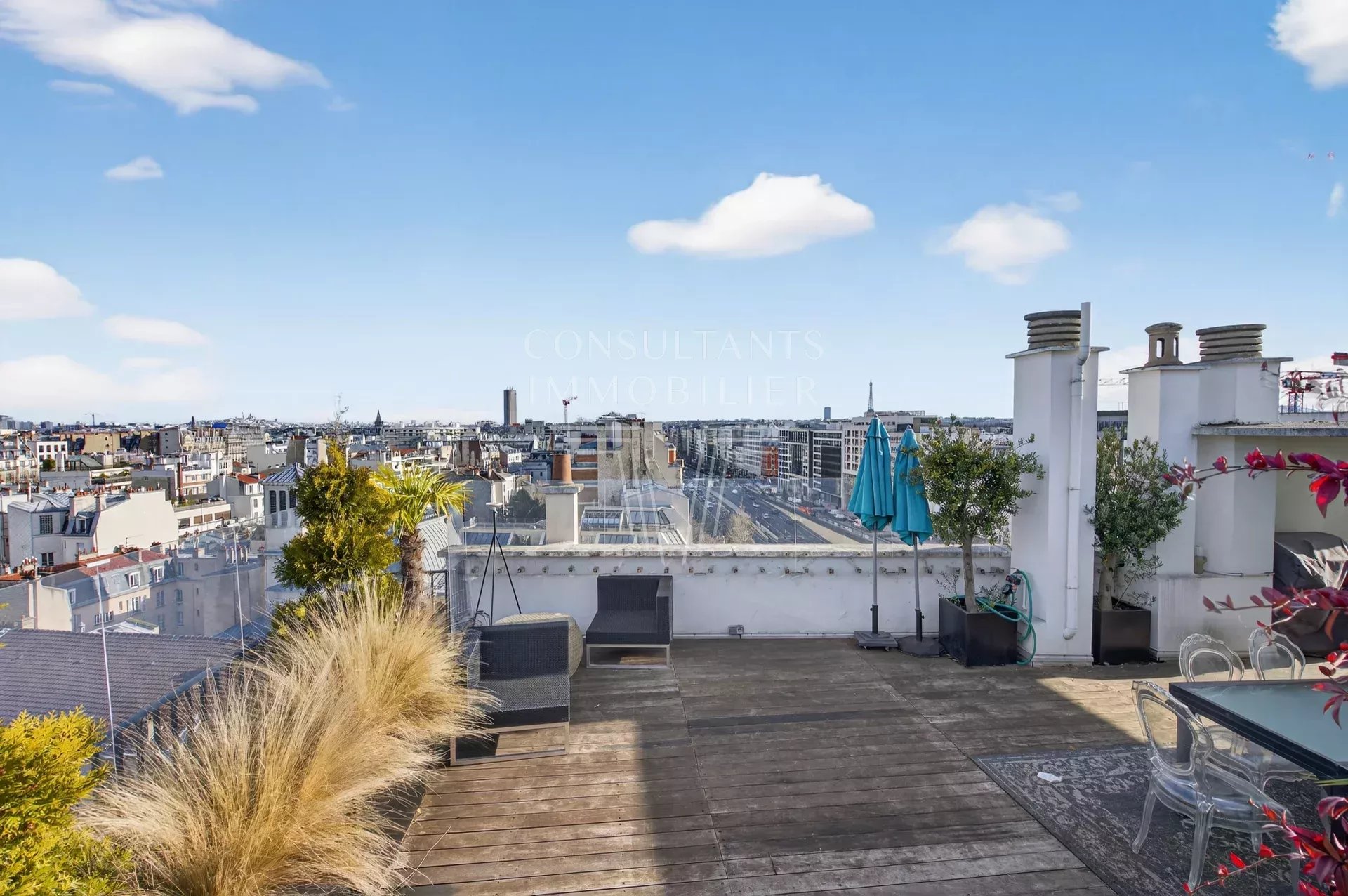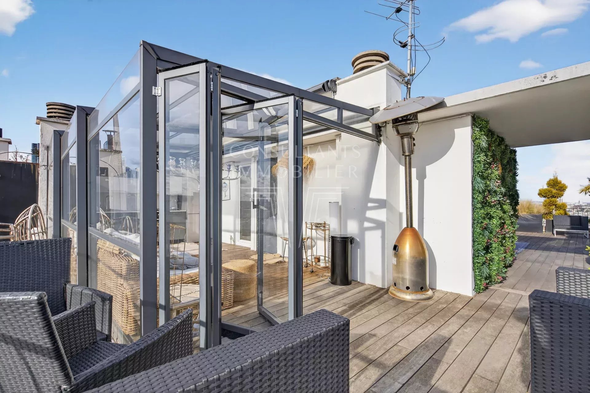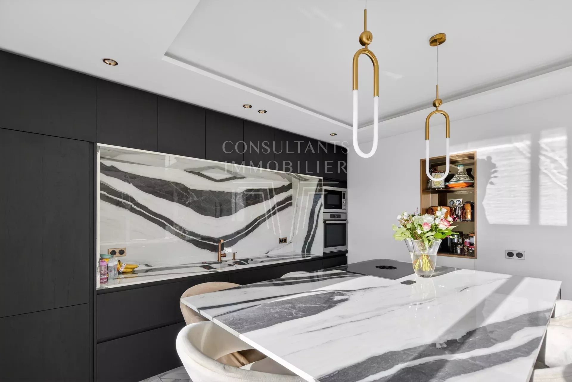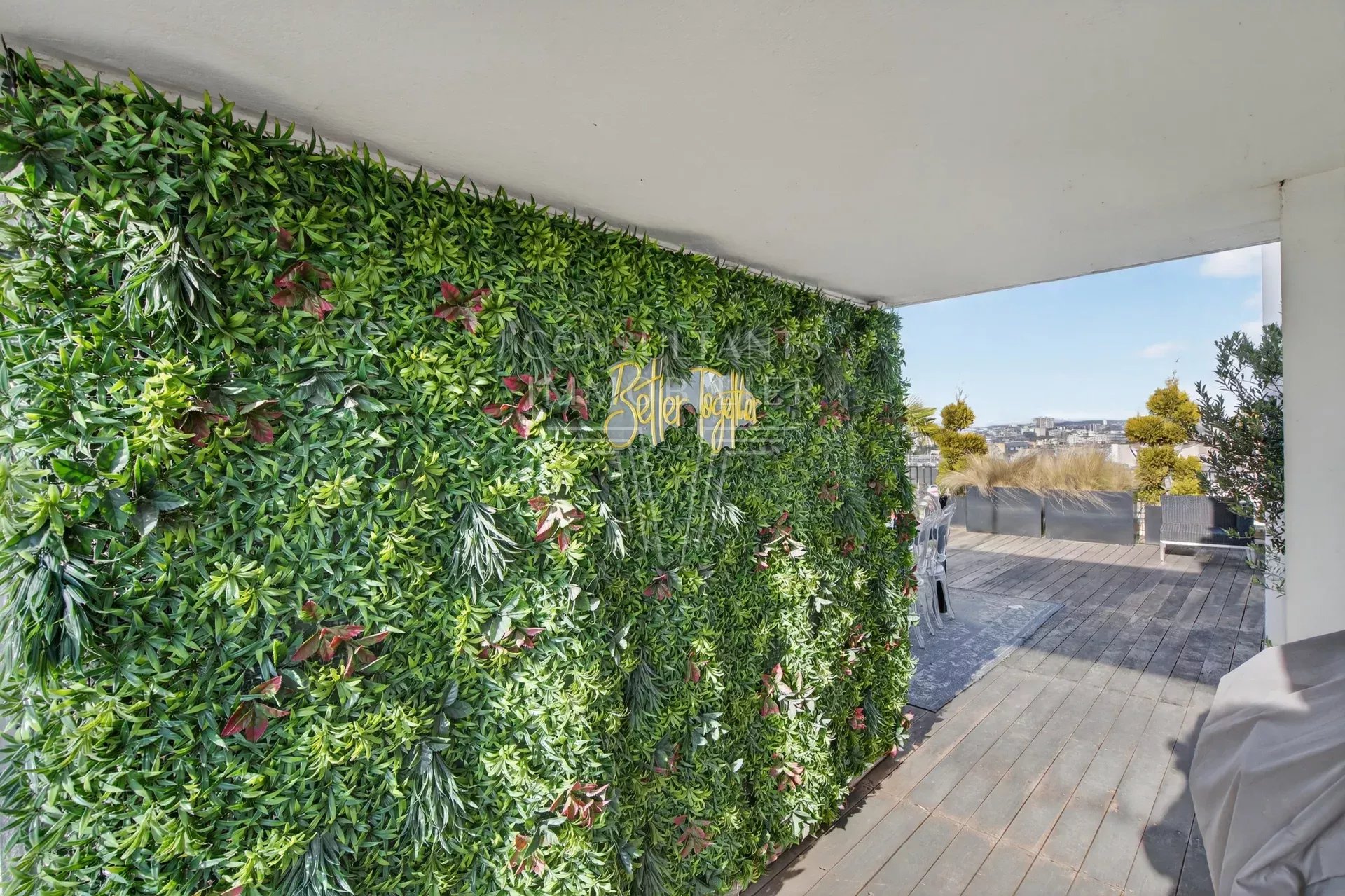 1 890 000 €VUES PANORAMIQUES. DERNIER ETAGE TERRASSE. Appartement situé au 8ème et 9ème étage, d'un immeuble récent, offrant des vues panoramiques de tous les cotés. Appartement REFAIT PAR ARCHITECTE, traversant et extrêmement lumineux. D'une surface de 91m² avec 111m² d'extérieur. Il se compose d'une entrée, deux chambres avec de nombreux rangements, deux salles de douche dont une avec toilettes, des toilettes invités, un séjour exposé plein sud, cuisine américaine toute équipée, cave à vin, ilot central et un terrasse de plain pied de 20m² au niveau du séjour. A l'étage supérieur, accessible par escalier privatif, une véranda de 28m² avec une cuisine murale, aménagée puis tout le toit terrasse au calme, sans aucun vis à vis et vues exceptionnelles !