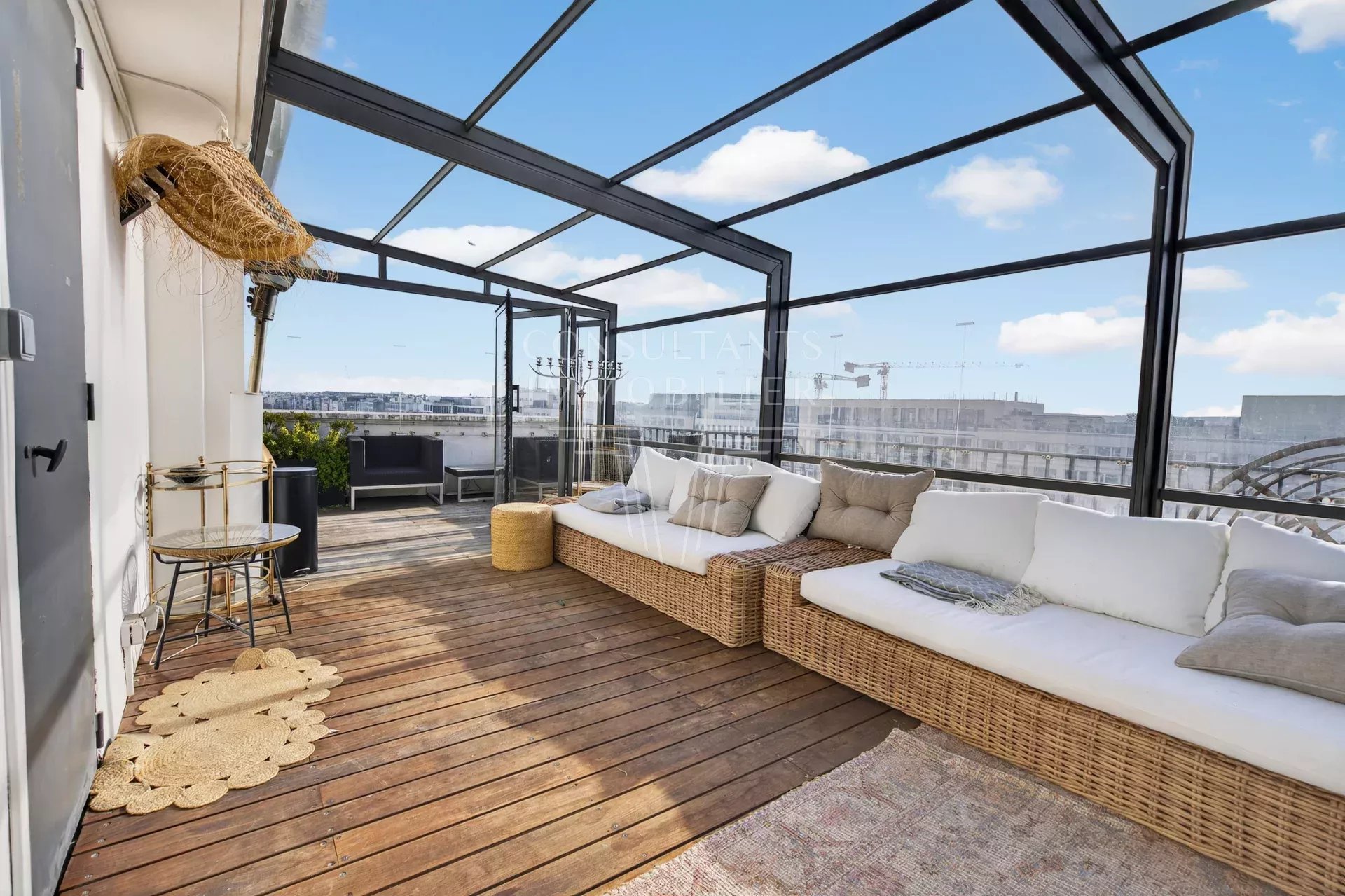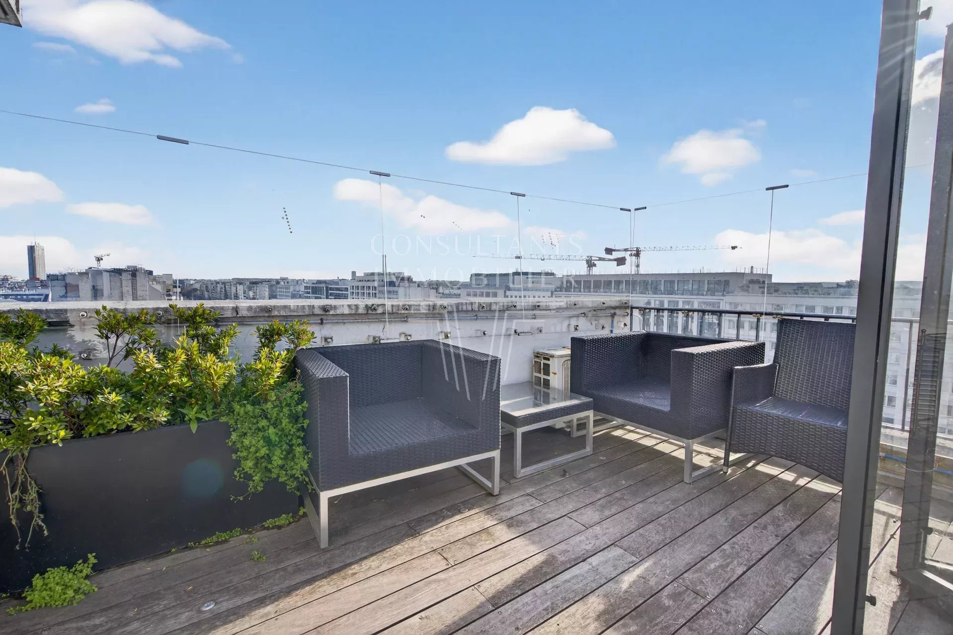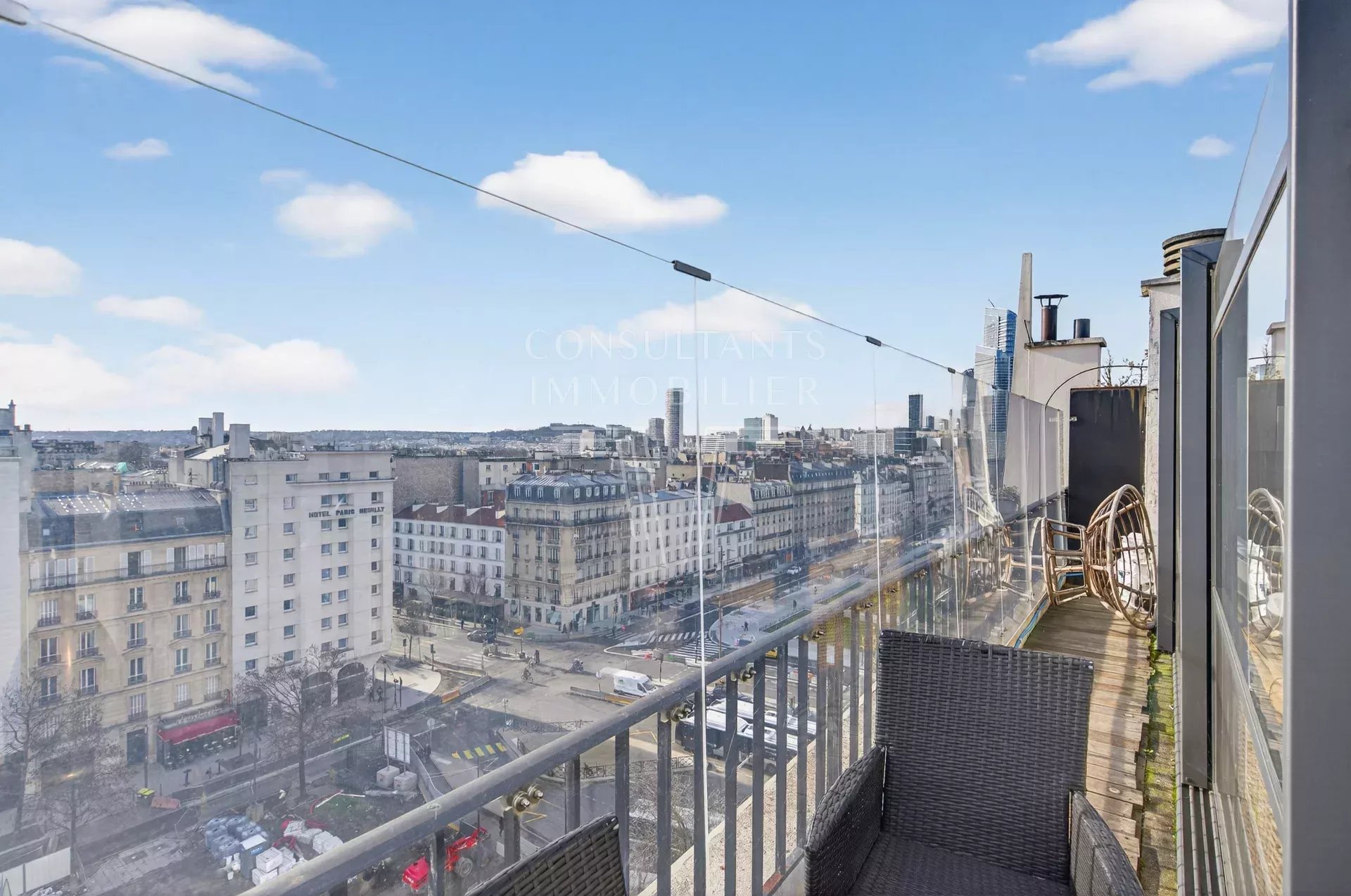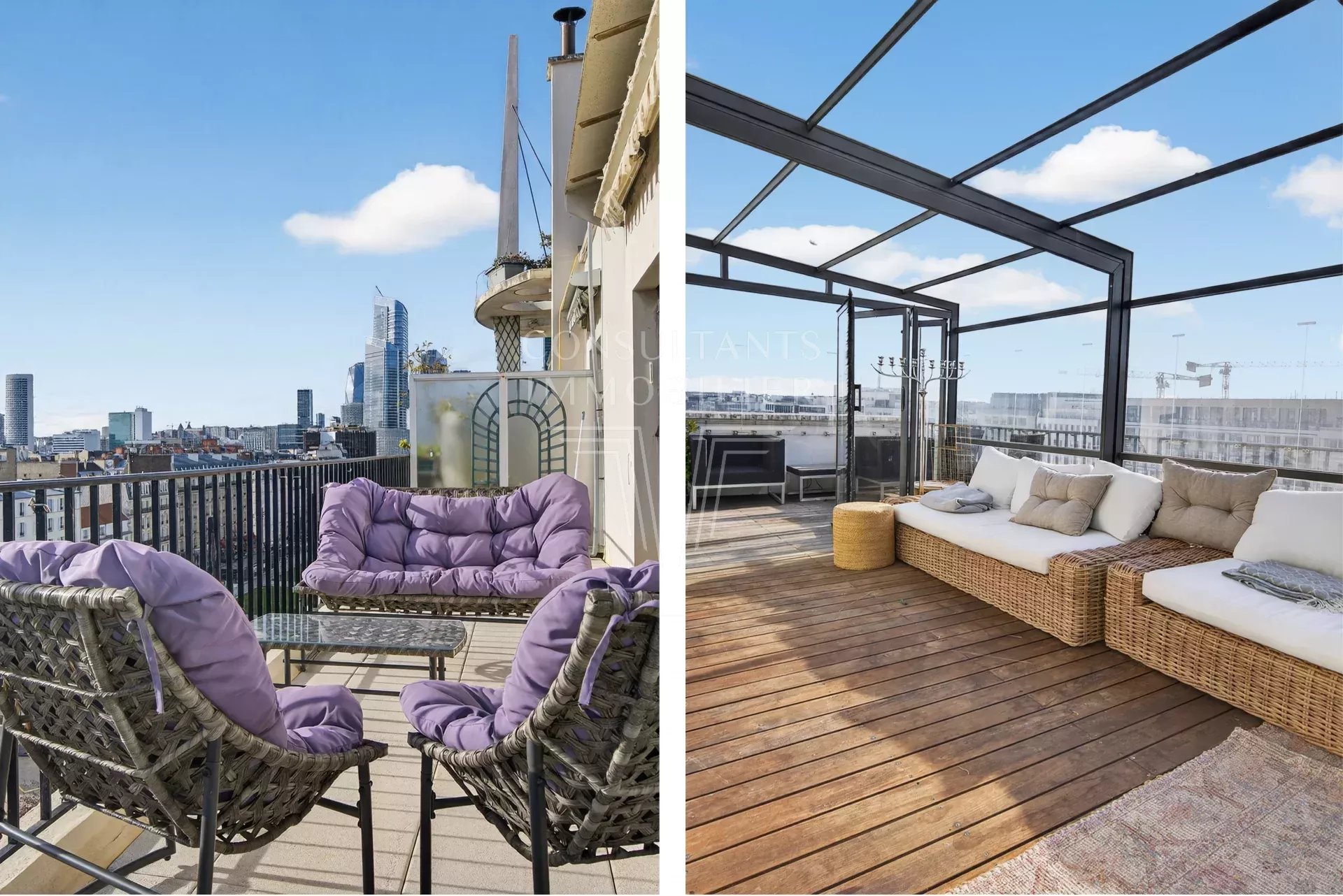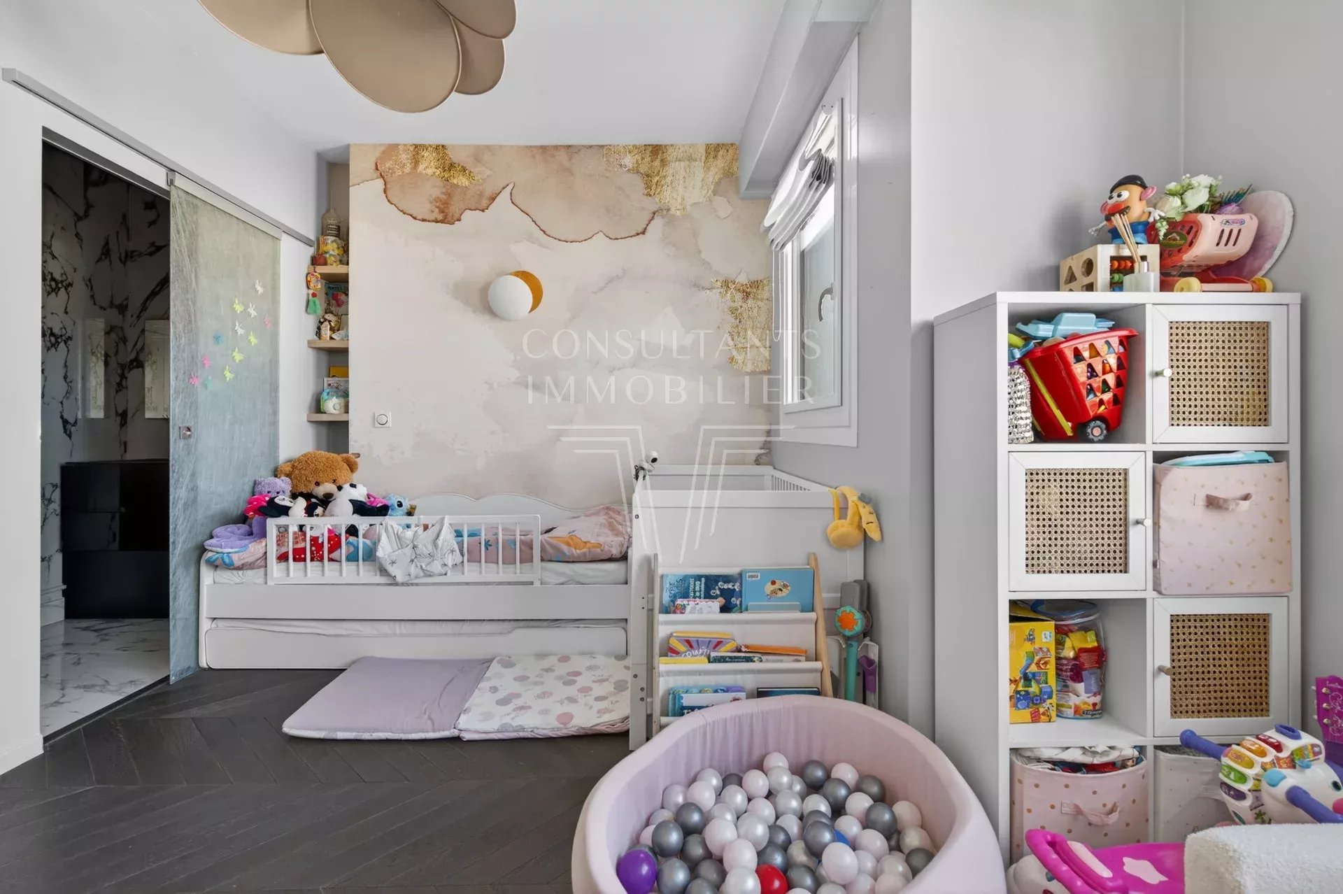 1 890 000 €VUES PANORAMIQUES. DERNIER ETAGE TERRASSE. Appartement situé au 8ème et 9ème étage, d'un immeuble récent, offrant des vues panoramiques de tous les cotés. Appartement REFAIT PAR ARCHITECTE, traversant et extrêmement lumineux. D'une surface de 91m² avec 111m² d'extérieur. Il se compose d'une entrée, deux chambres avec de nombreux rangements, deux salles de douche dont une avec toilettes, des toilettes invités, un séjour exposé plein sud, cuisine américaine toute équipée, cave à vin, ilot central et un terrasse de plain pied de 20m² au niveau du séjour. A l'étage supérieur, accessible par escalier privatif, une véranda de 28m² avec une cuisine murale, aménagée puis tout le toit terrasse au calme, sans aucun vis à vis et vues exceptionnelles !