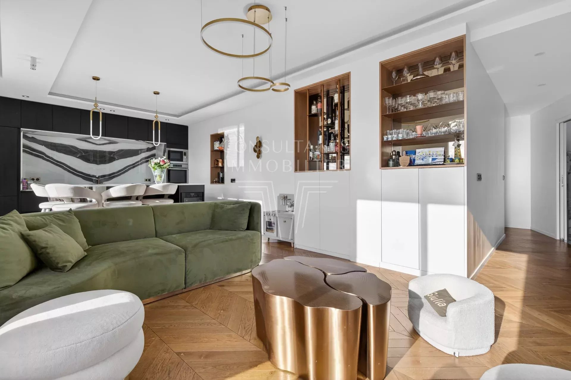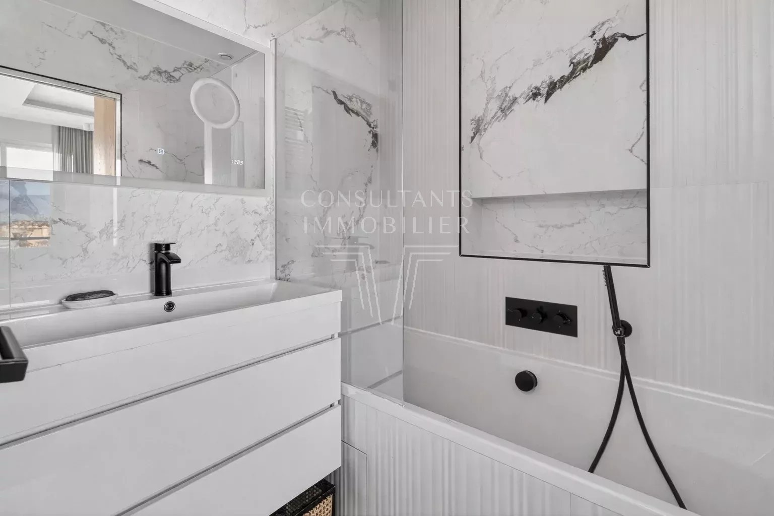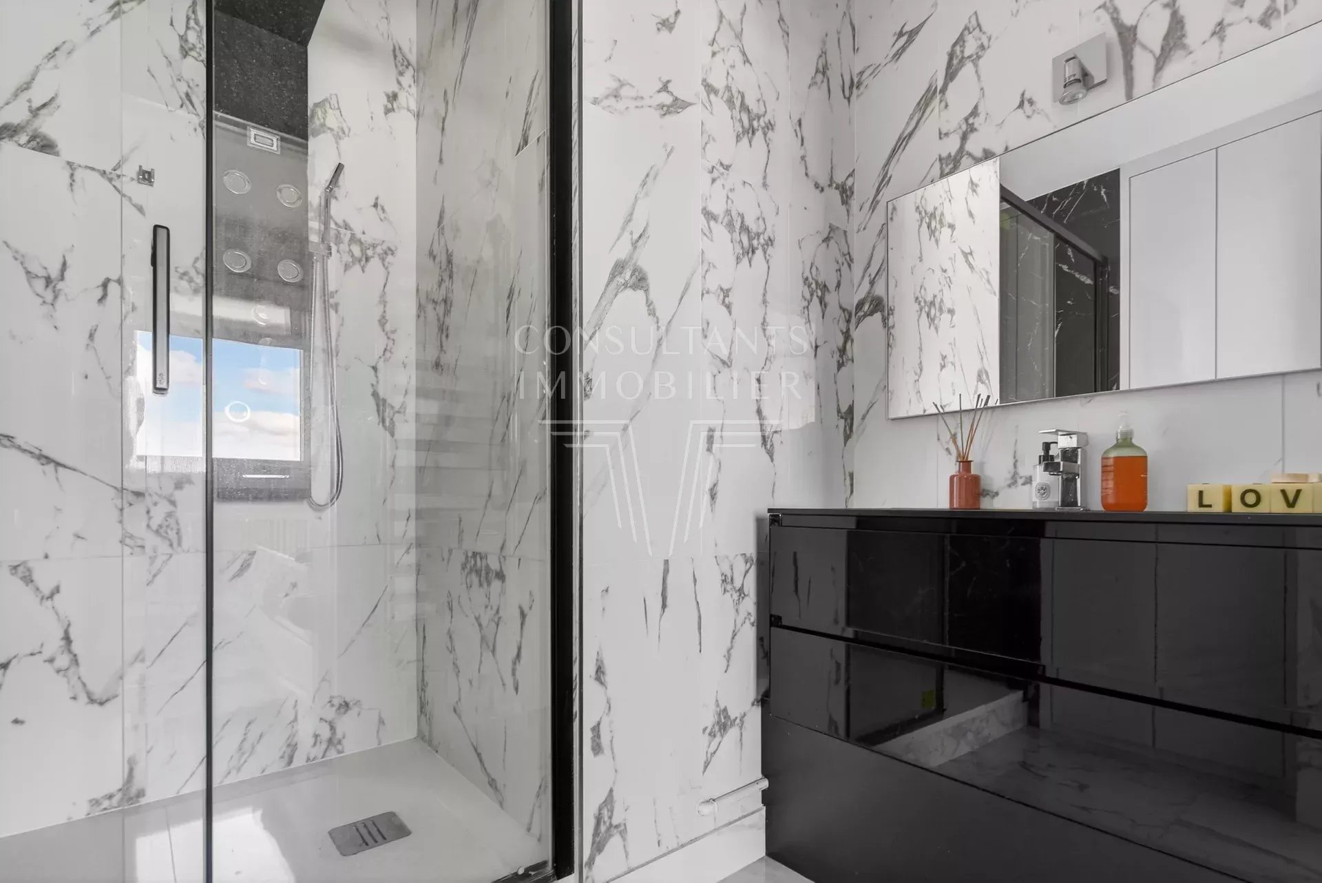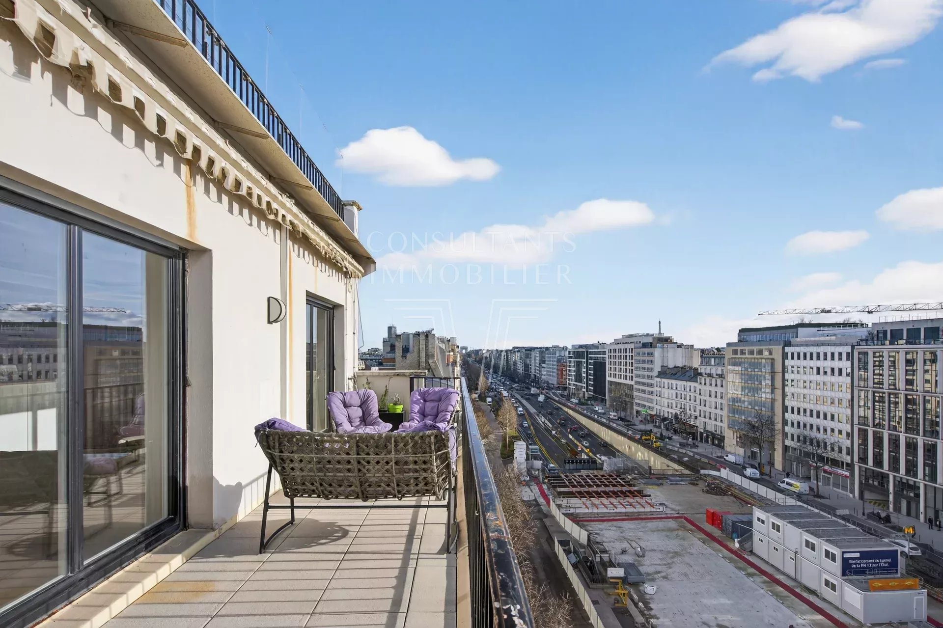 1 890 000 €VUES PANORAMIQUES. DERNIER ETAGE TERRASSE. Appartement situé au 8ème et 9ème étage, d'un immeuble récent, offrant des vues panoramiques de tous les cotés. Appartement REFAIT PAR ARCHITECTE, traversant et extrêmement lumineux. D'une surface de 91m² avec 111m² d'extérieur. Il se compose d'une entrée, deux chambres avec de nombreux rangements, deux salles de douche dont une avec toilettes, des toilettes invités, un séjour exposé plein sud, cuisine américaine toute équipée, cave à vin, ilot central et un terrasse de plain pied de 20m² au niveau du séjour. A l'étage supérieur, accessible par escalier privatif, une véranda de 28m² avec une cuisine murale, aménagée puis tout le toit terrasse au calme, sans aucun vis à vis et vues exceptionnelles !