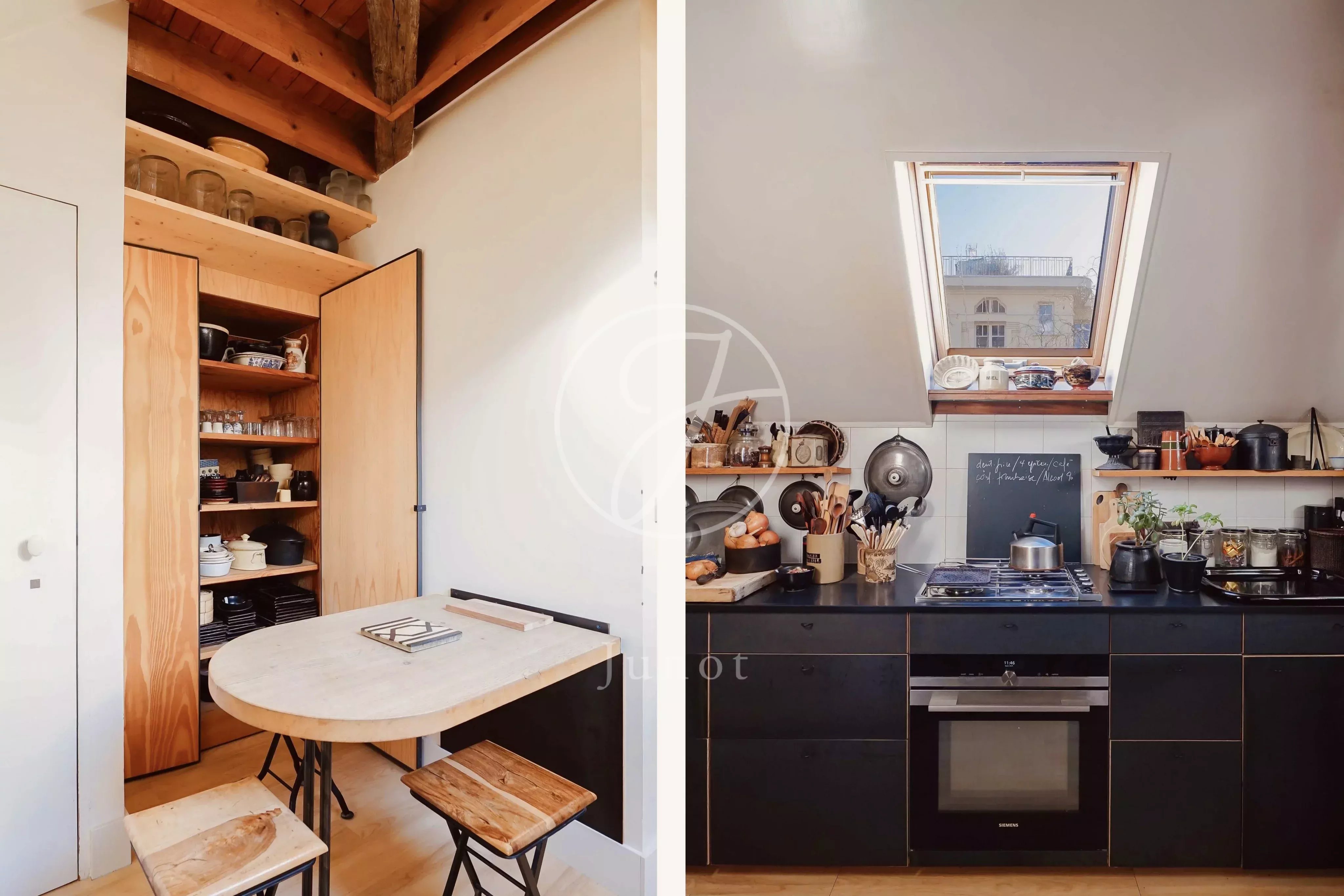 La cuisine occupe une pièce séparée, et l’appartement comprend une salle de bains partagée, deux chambres bien proportionnées, ainsi qu’une mezzanine aménagée en espace nuit. Un coin bureau a été intégré avec intelligence dans le séjour, optimisant encore la fonctionnalité de l’ensemble.
