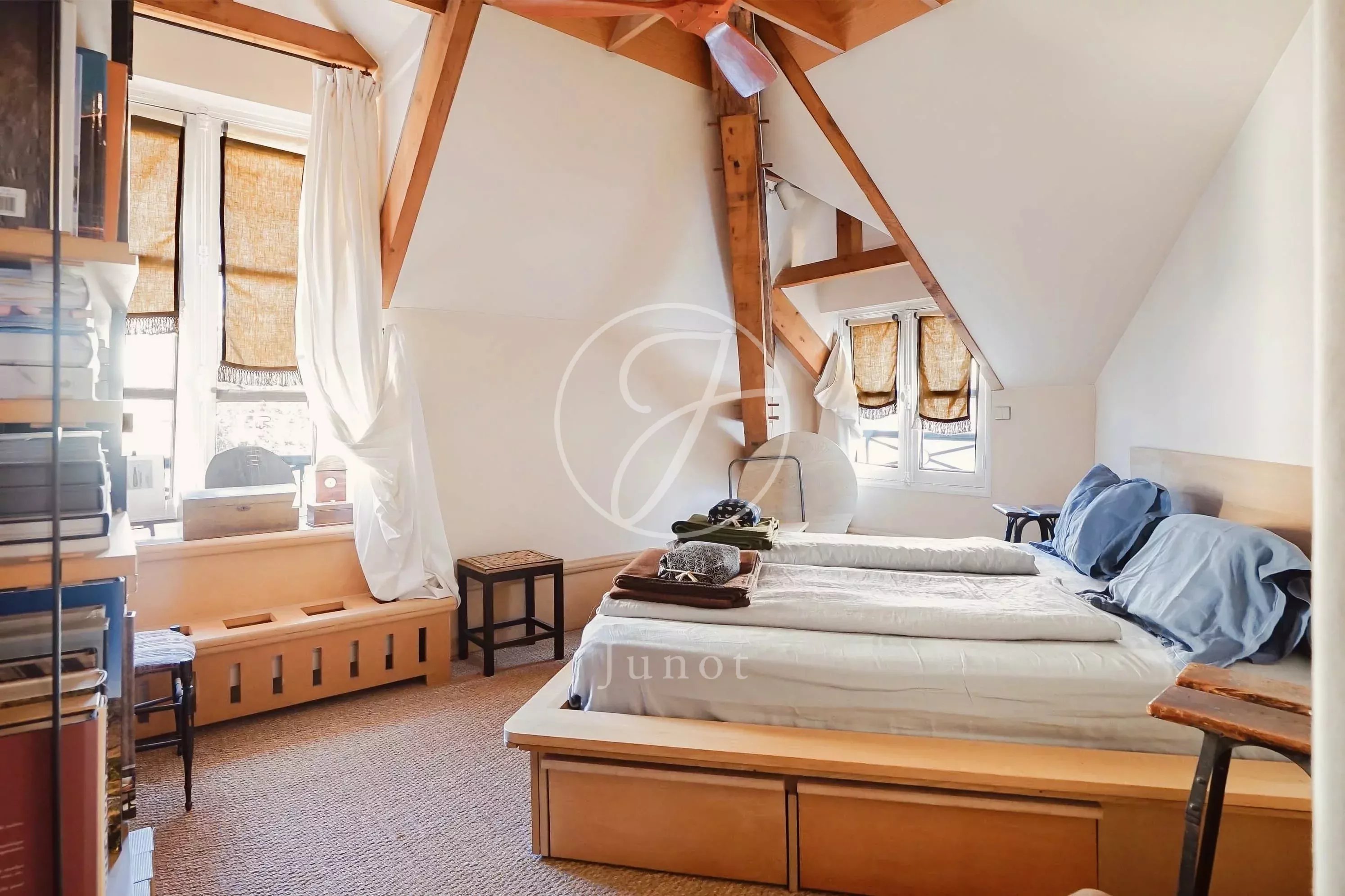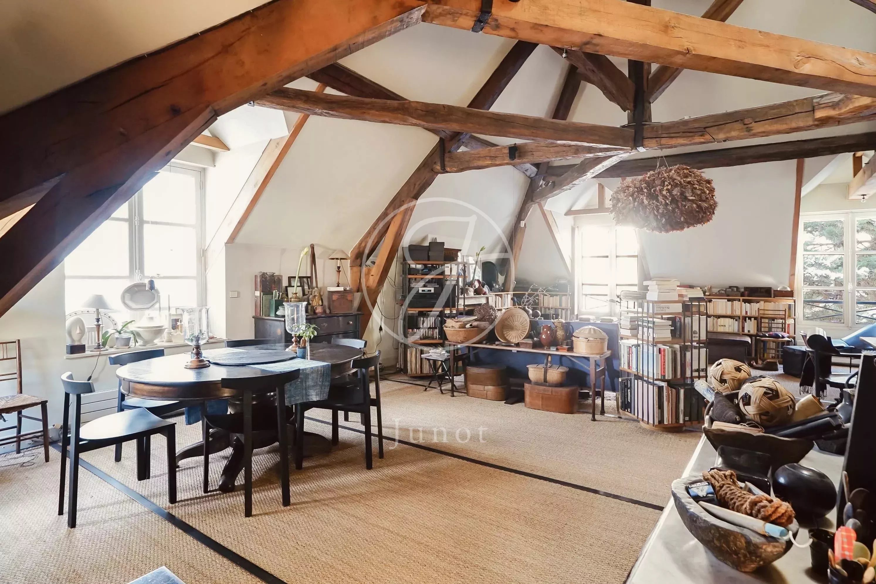 La pièce de vie se déploie comme un vaste espace ouvert, chaleureux, entièrement repensé par un architecte afin d’optimiser les volumes et la circulation. Les matériaux naturels, les couleurs douces et les éléments chinés composent une atmosphère élégante. La cheminée fonctionnelle et les volets intérieurs ajoutent au charme du lieu, tandis que le double vitrage garantit un bon confort acoustique.
