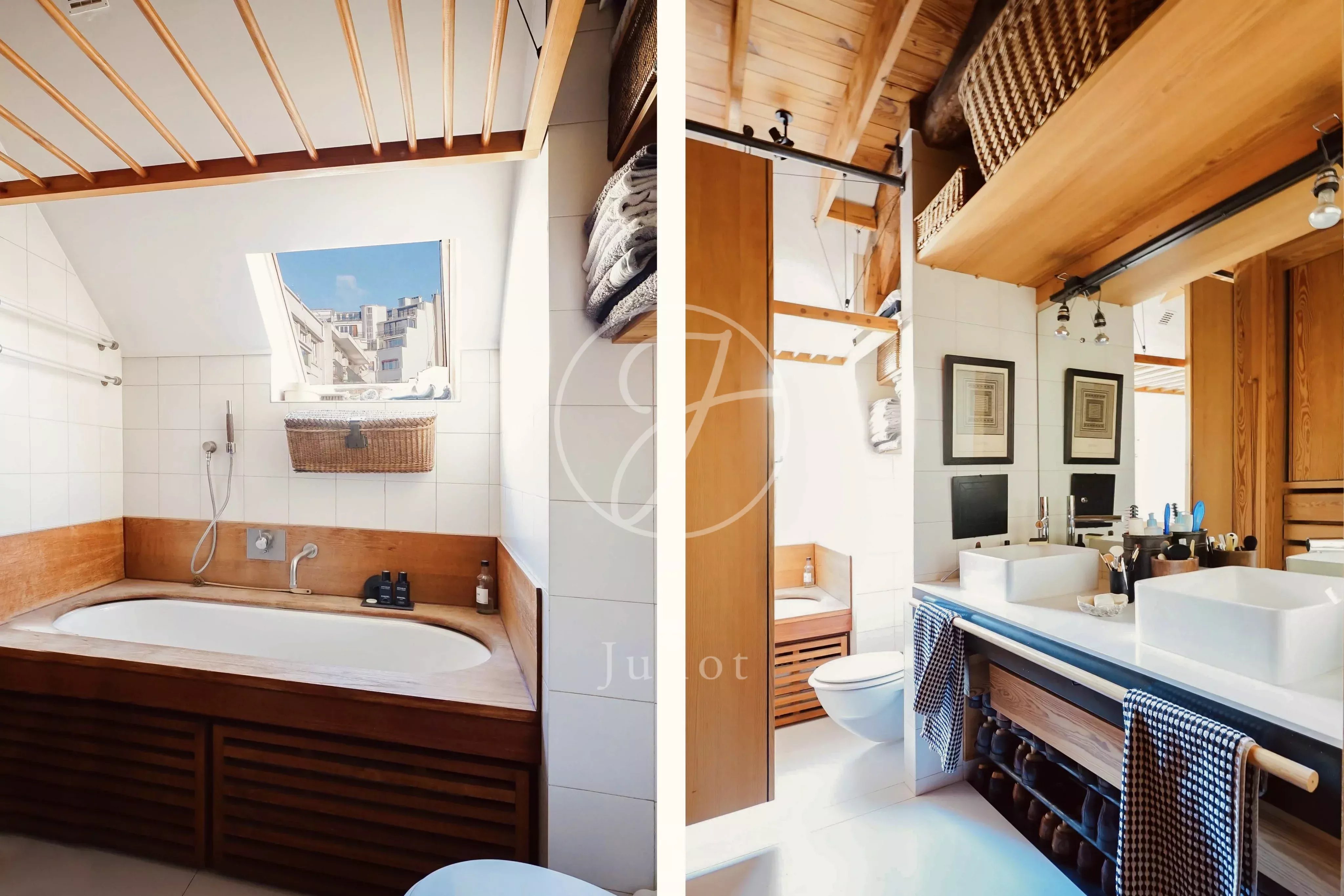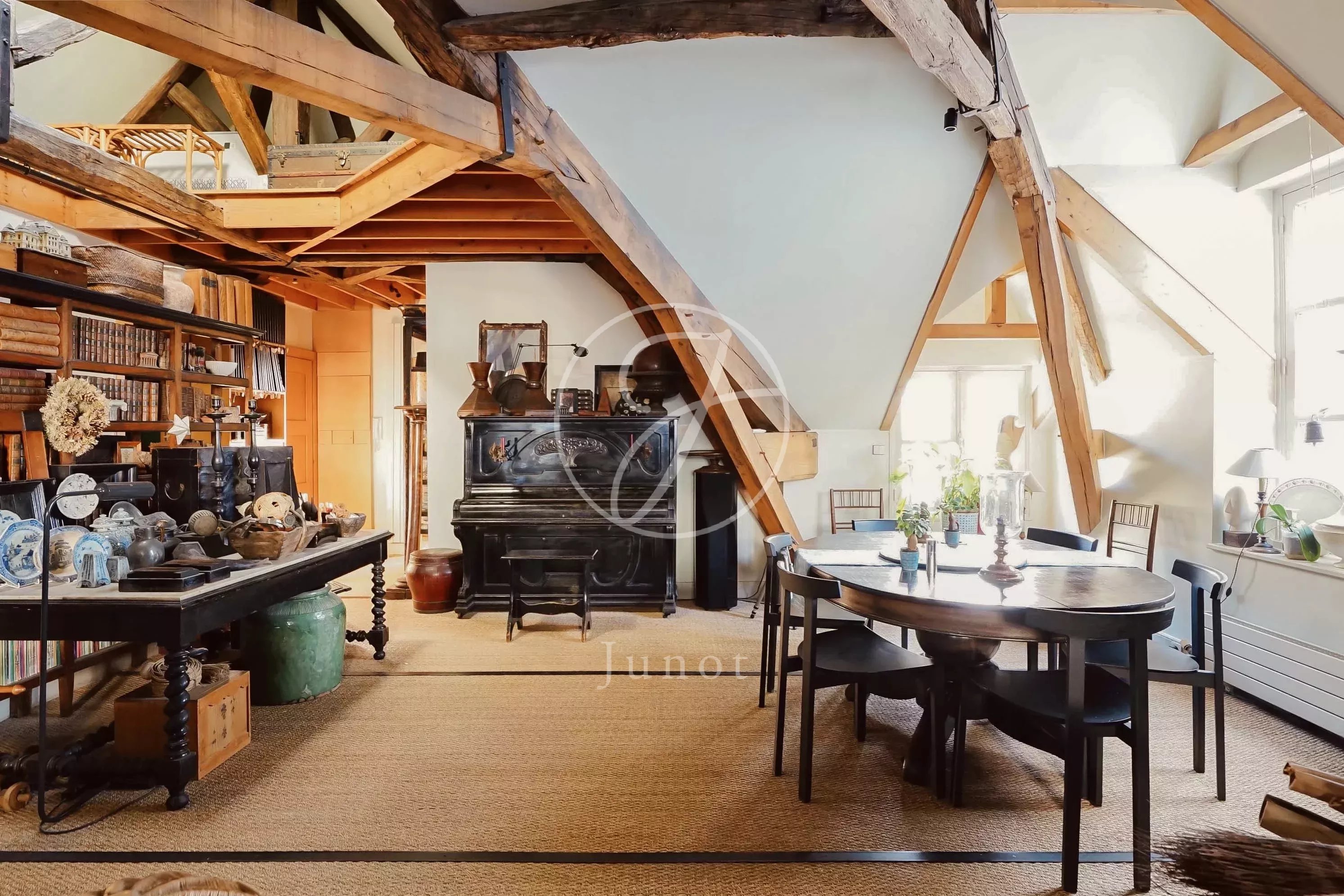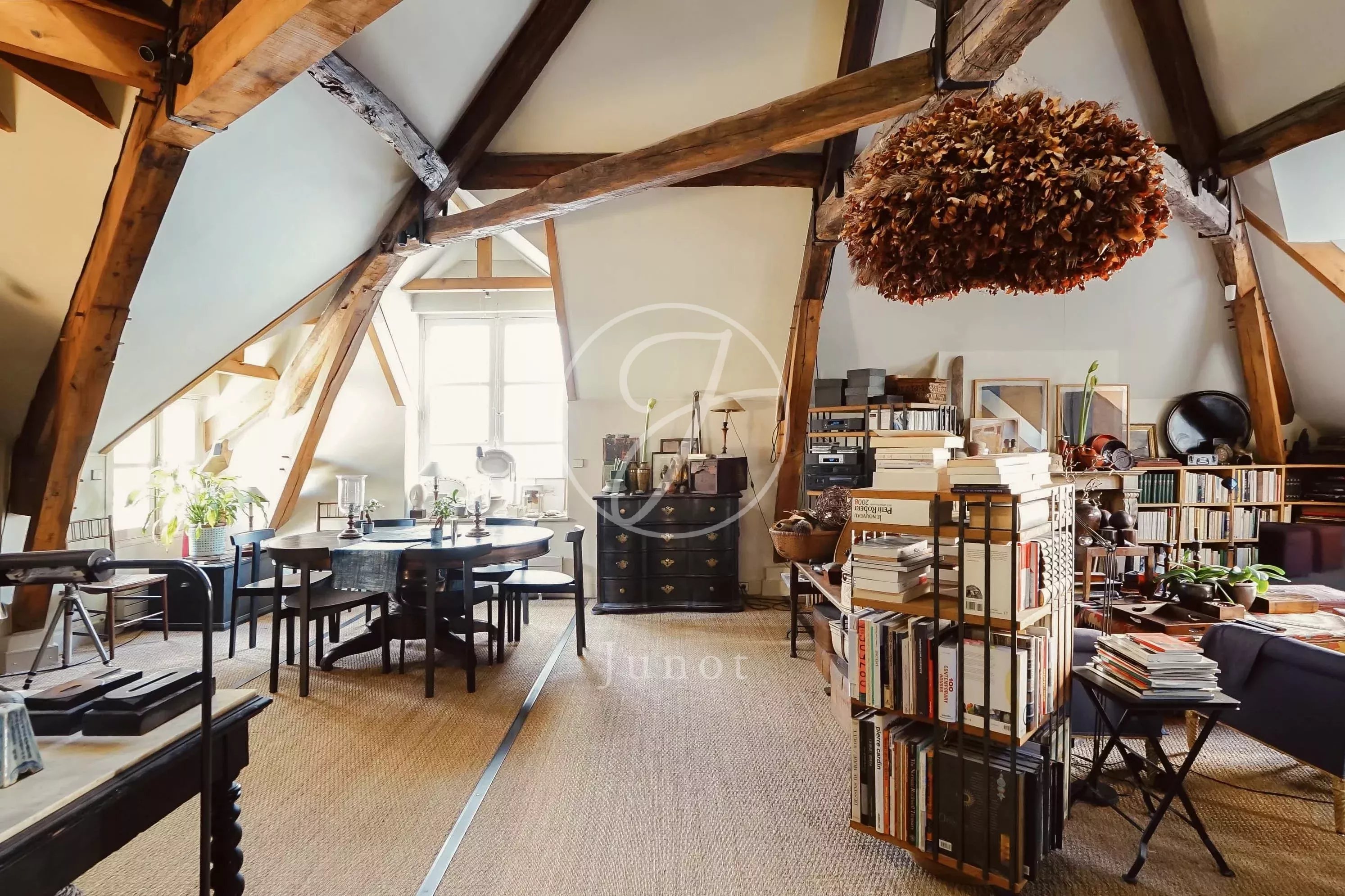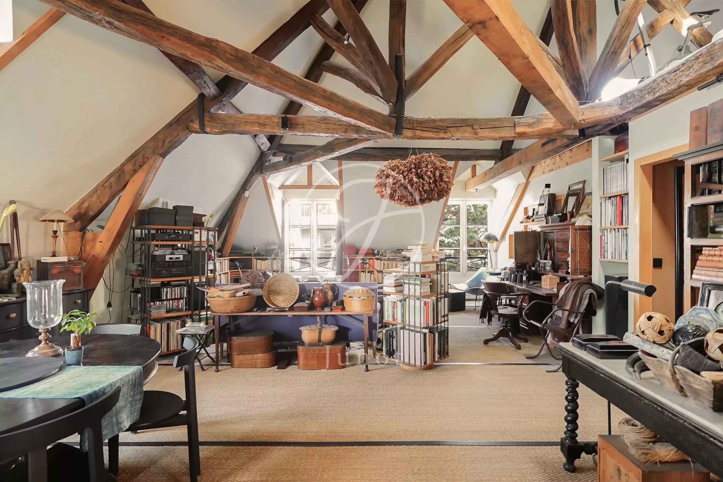 L’appartement, situé au troisième et dernier étage, bénéficie d’un palier entièrement privatif, renforçant le sentiment d’intimité. Il développe sur 120 mètres carrés de beaux volumes, avec une hauteur sous plafond particulièrement généreuse qui amplifie la sensation d’espace et a permis la création d’une mezzanine dotée elle aussi d’un plafond confortable, offrant un usage agréable au quotidien.