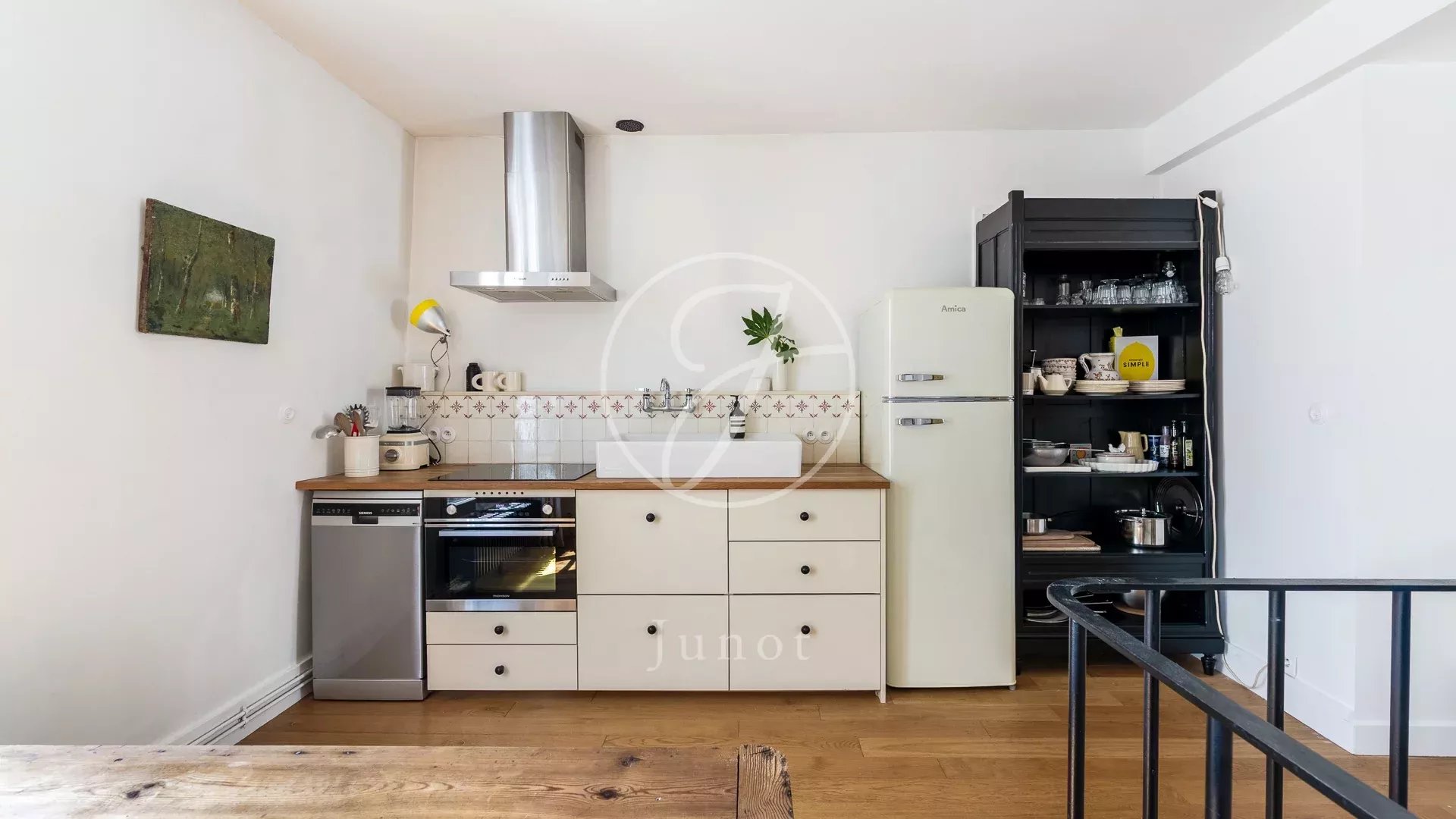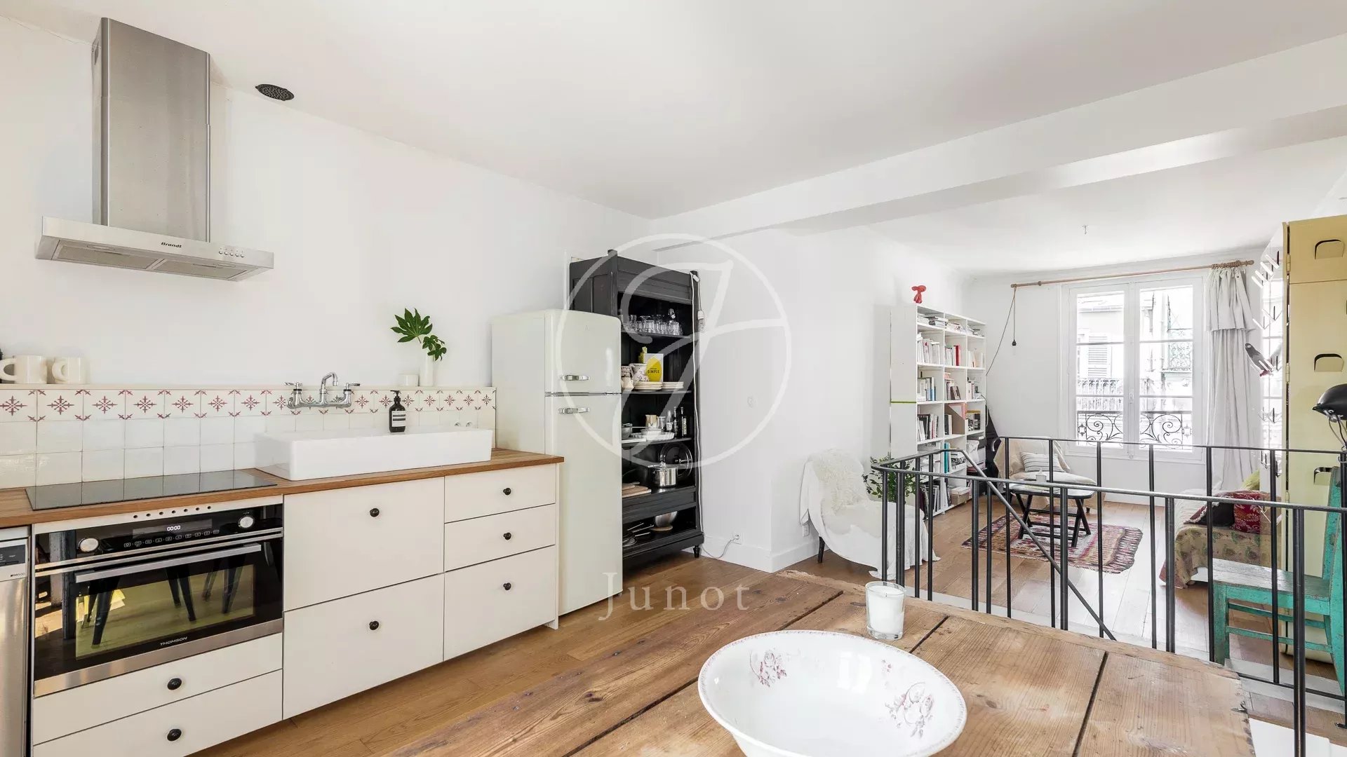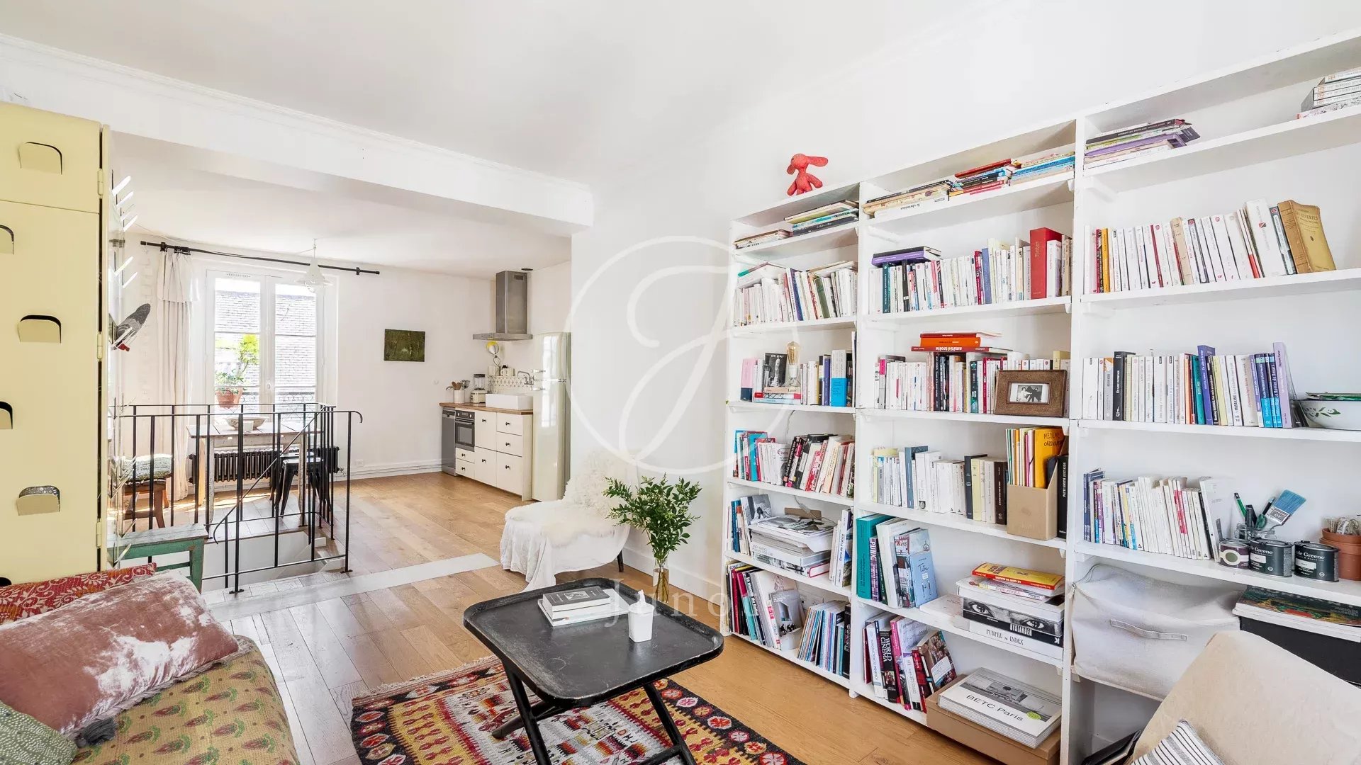 À l’étage supérieur, le séjour lumineux s’ouvre sur une cuisine américaine entièrement équipée, créant un espace de vie à la fois cosy et fonctionnel.