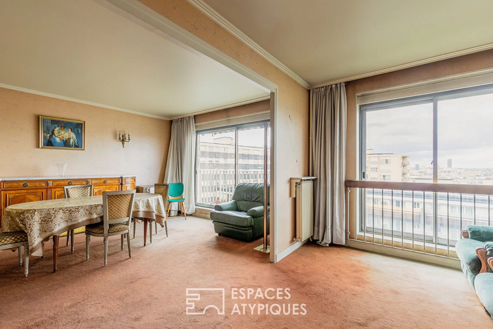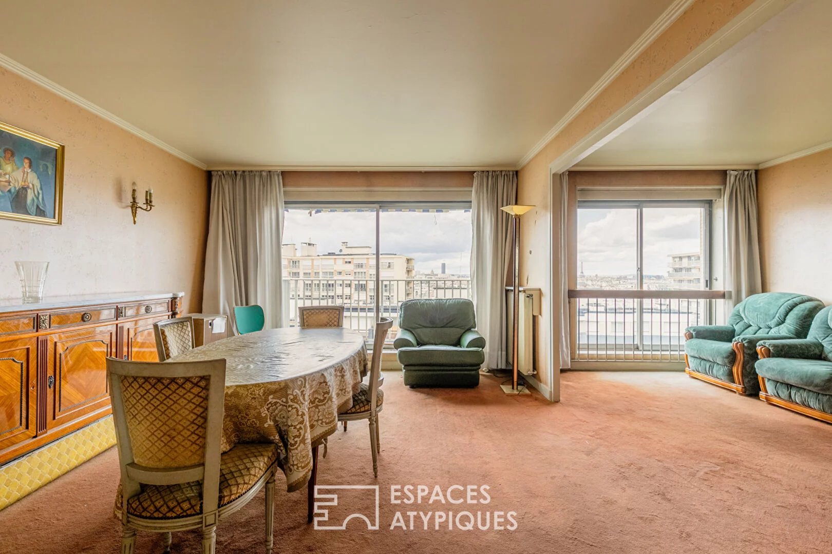 Situé au 8ème étage d'une copropriété bien entretenue des années 70 avec ascenseur, cet appartement traversant de 88,5 m² Carrez séduit par sa luminosité, ses volumes et sa vue exceptionnelle sur les monuments de Paris.