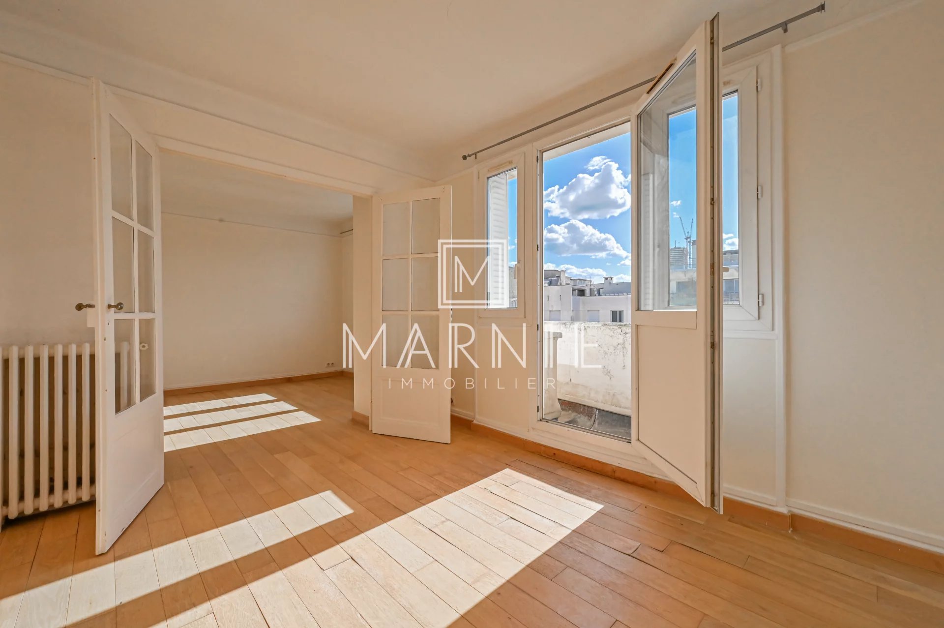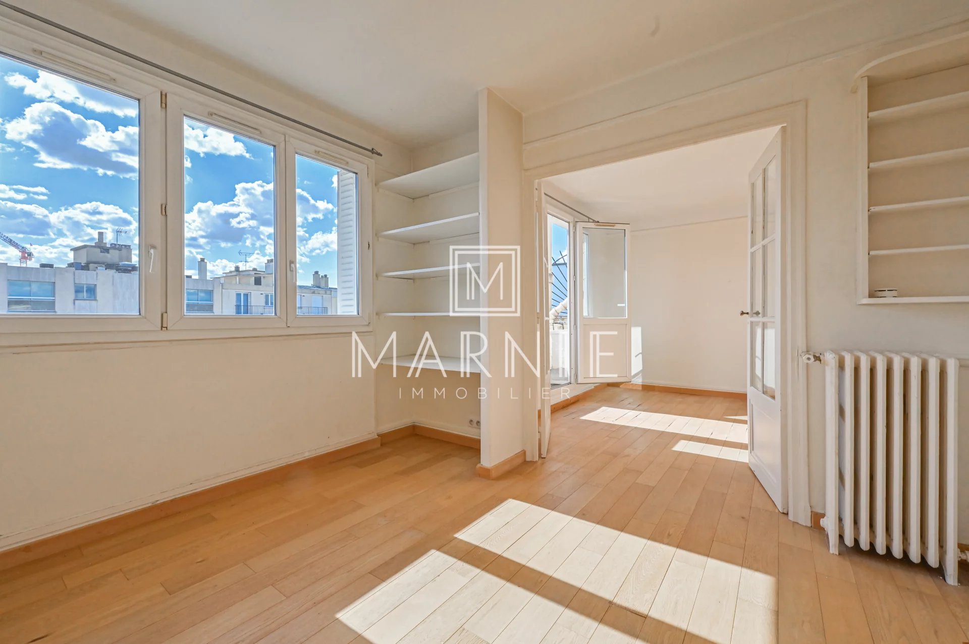 Cet appartement traversant, baigné de lumière et au calme absolu, offre une vue dégagée de toutes parts.