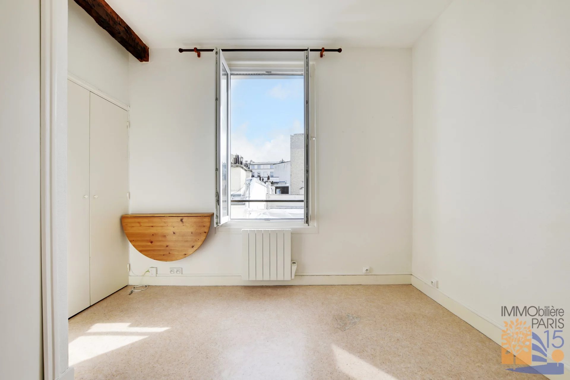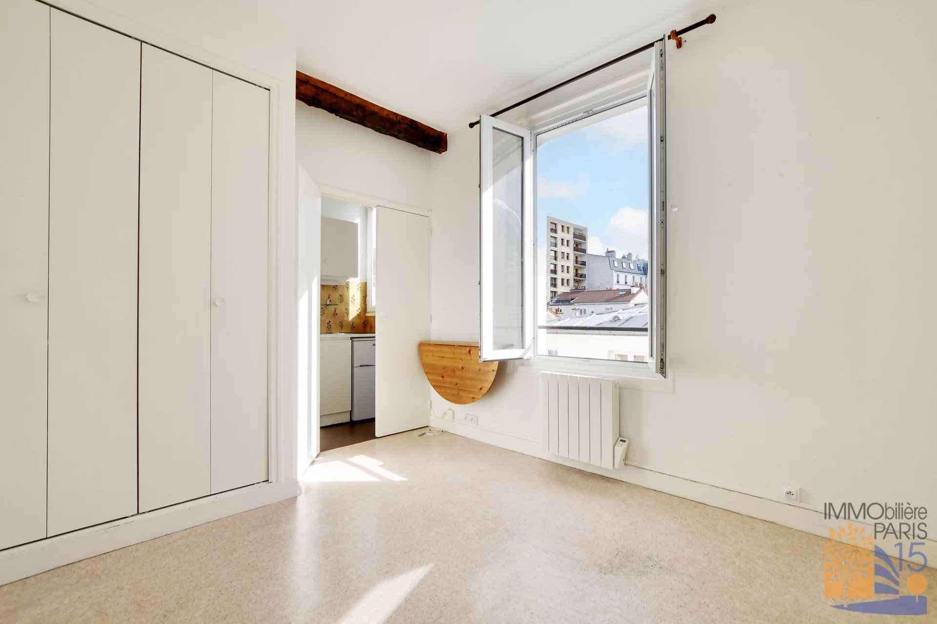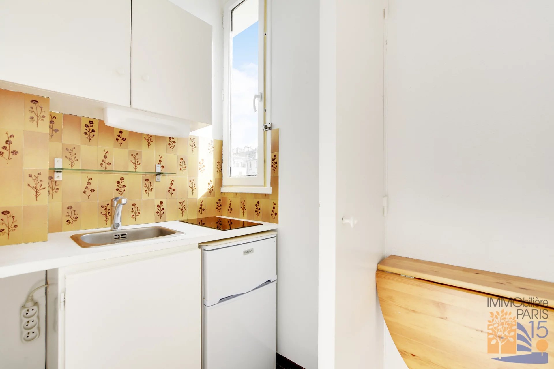 L'agence Immobilière Paris 15 vous propose en exclusivité, dans une charmante villa à côté de la gare Montparnasse, un très beau studio avec vue dégagée, au troisième étage avec ascenseur, 13.50 m2, parfaitement agencé, sans perte de place, cuisine avec fenêtre, salle de bain avec WC, rangements dans la pièce principale, calme, exposé plein Est.
