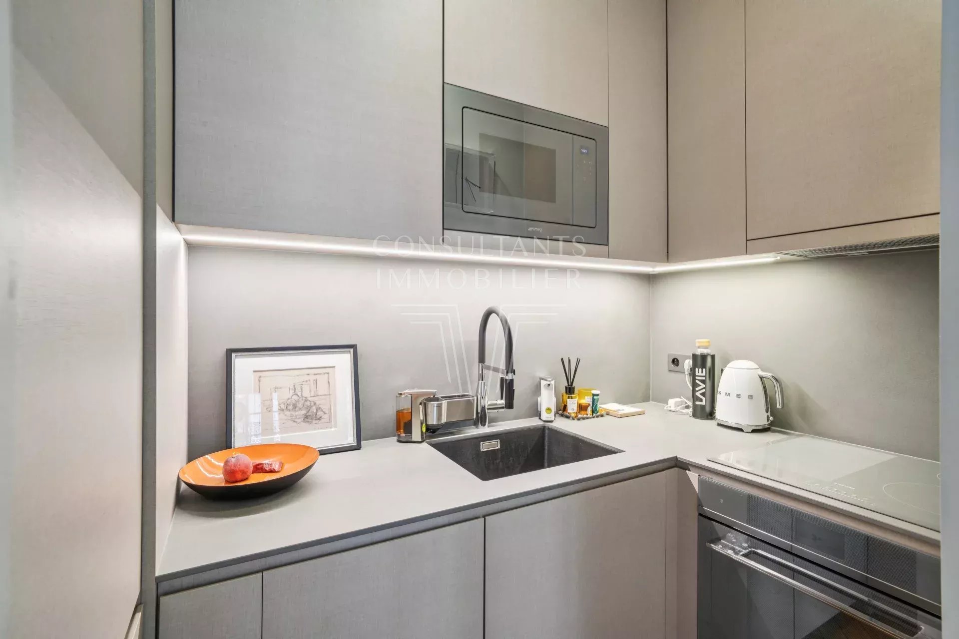 Une entrée, un double séjour de 36 m², une petite cuisine indépendante équipée tout intégré, une suite au calme absolu dotée d'une vue très agréable sur un ravissant hôtel particulier et une jolie cour, un dressing sur mesure de plus de 10 m² – ou seconde chambre – et une salle de douche avec toilettes, des toilettes indépendantes pour les invités.