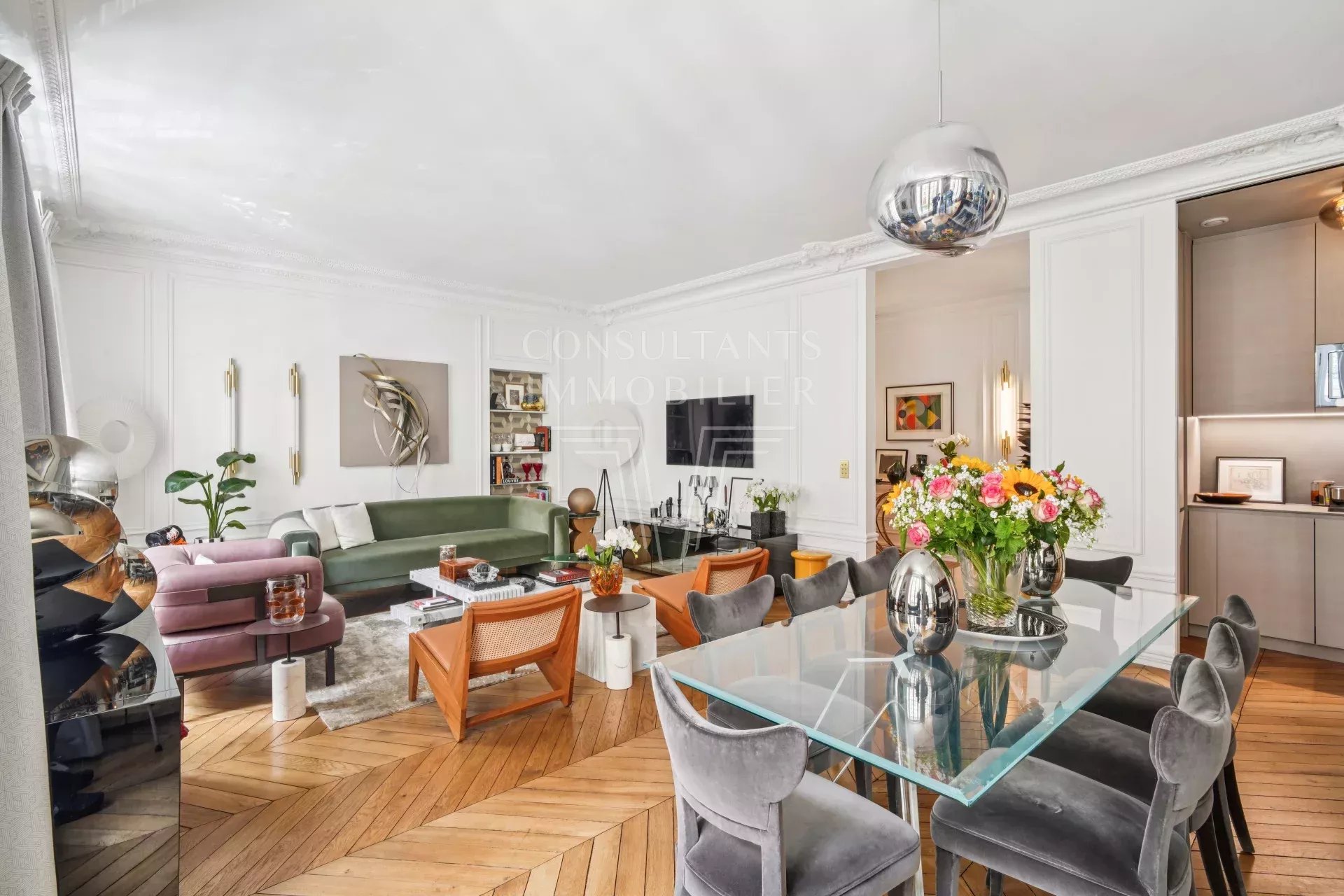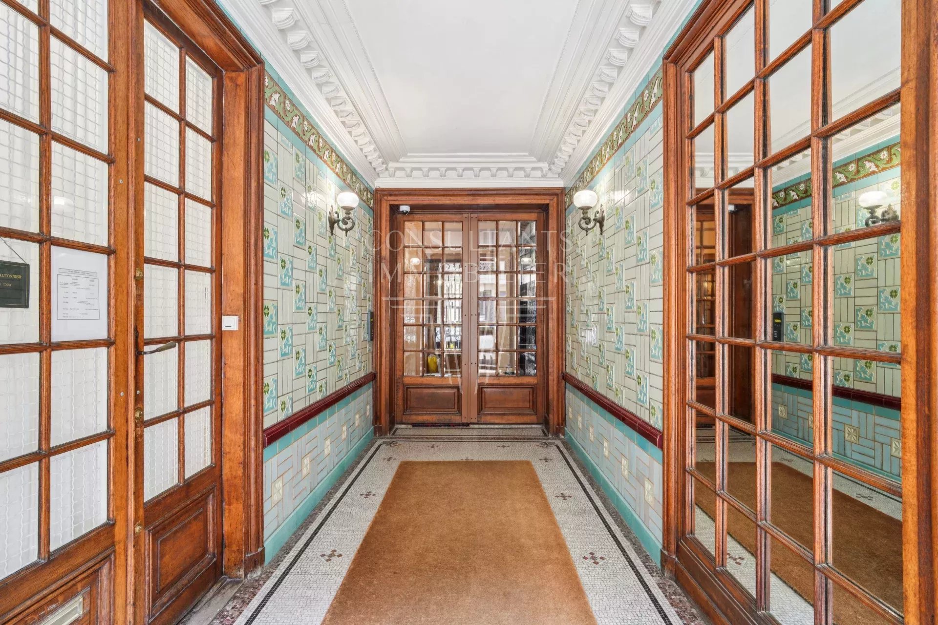 Magnifique appartement traversant de 77,23 m² loi Carrez, idéalement situé entre la place du Trocadéro et la rue de Passy, dans un bel immeuble ancien en pierre de taille, aux jolies parties communes avec gardien.