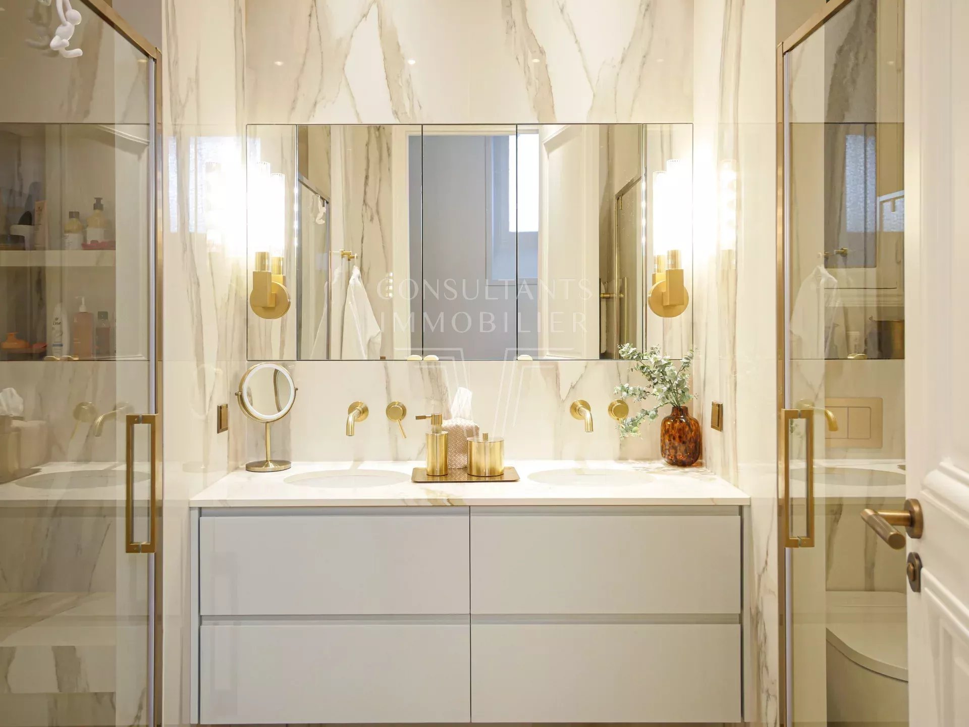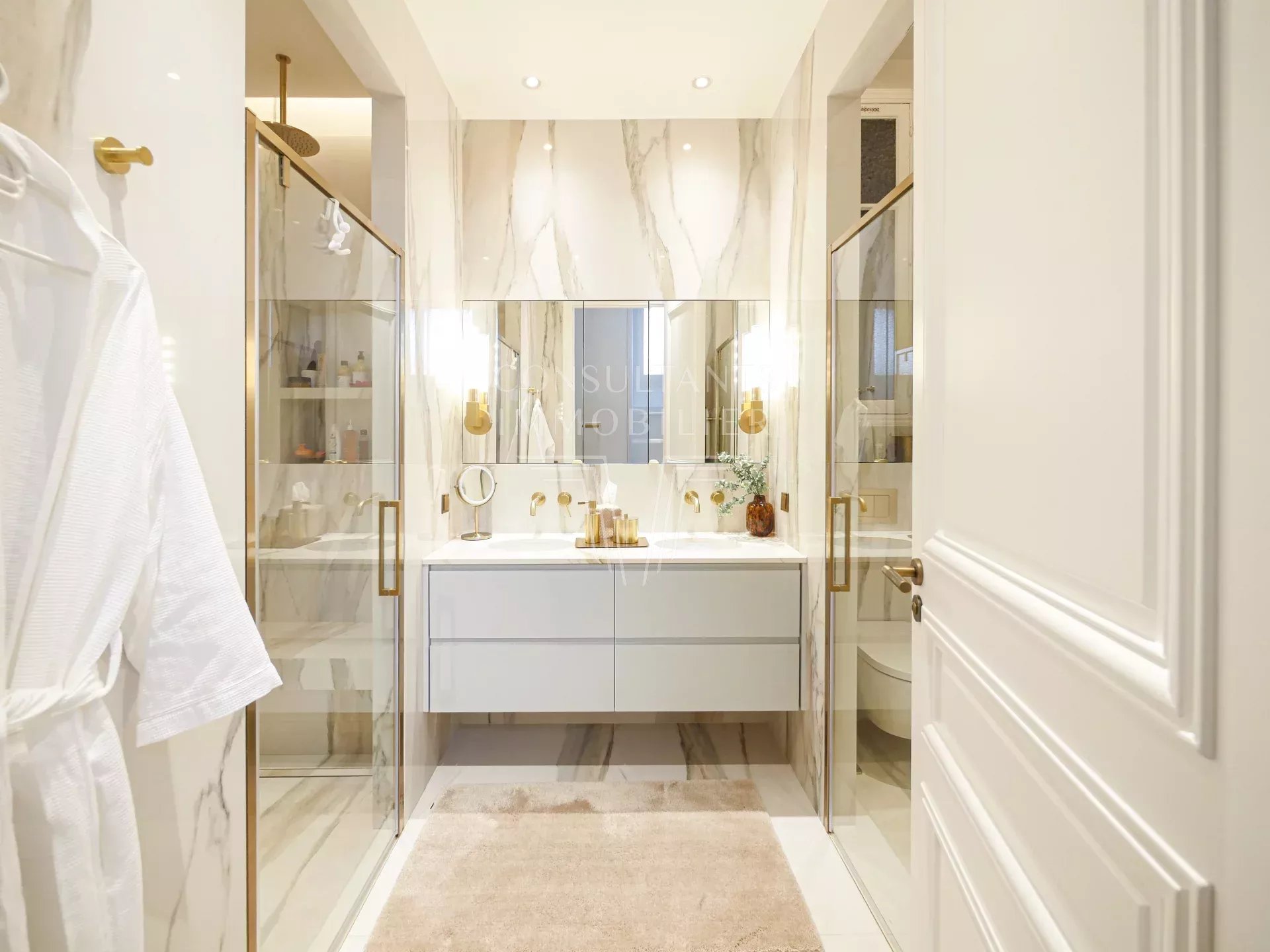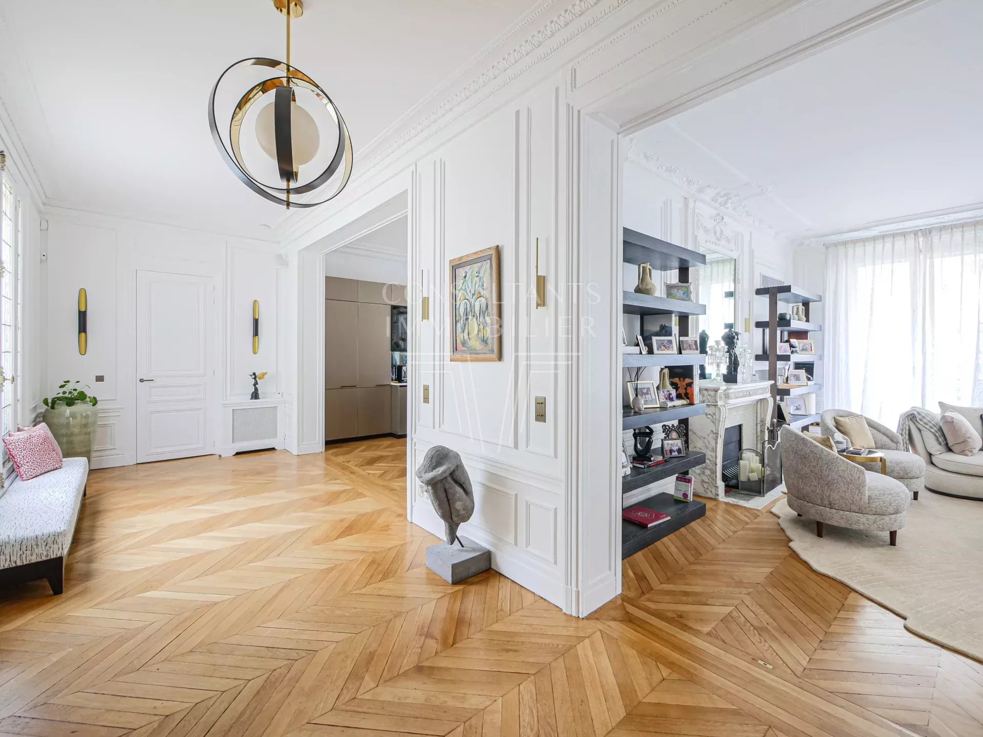Il comprend : une galerie d'entrée, un double séjour lumineux avec cheminée, une salle à manger-cuisine ouverte, un office, une buanderie, quatre suites, chacune avec douche à l'italienne et dressing. Plusieurs toilettes dans l'appartement.
