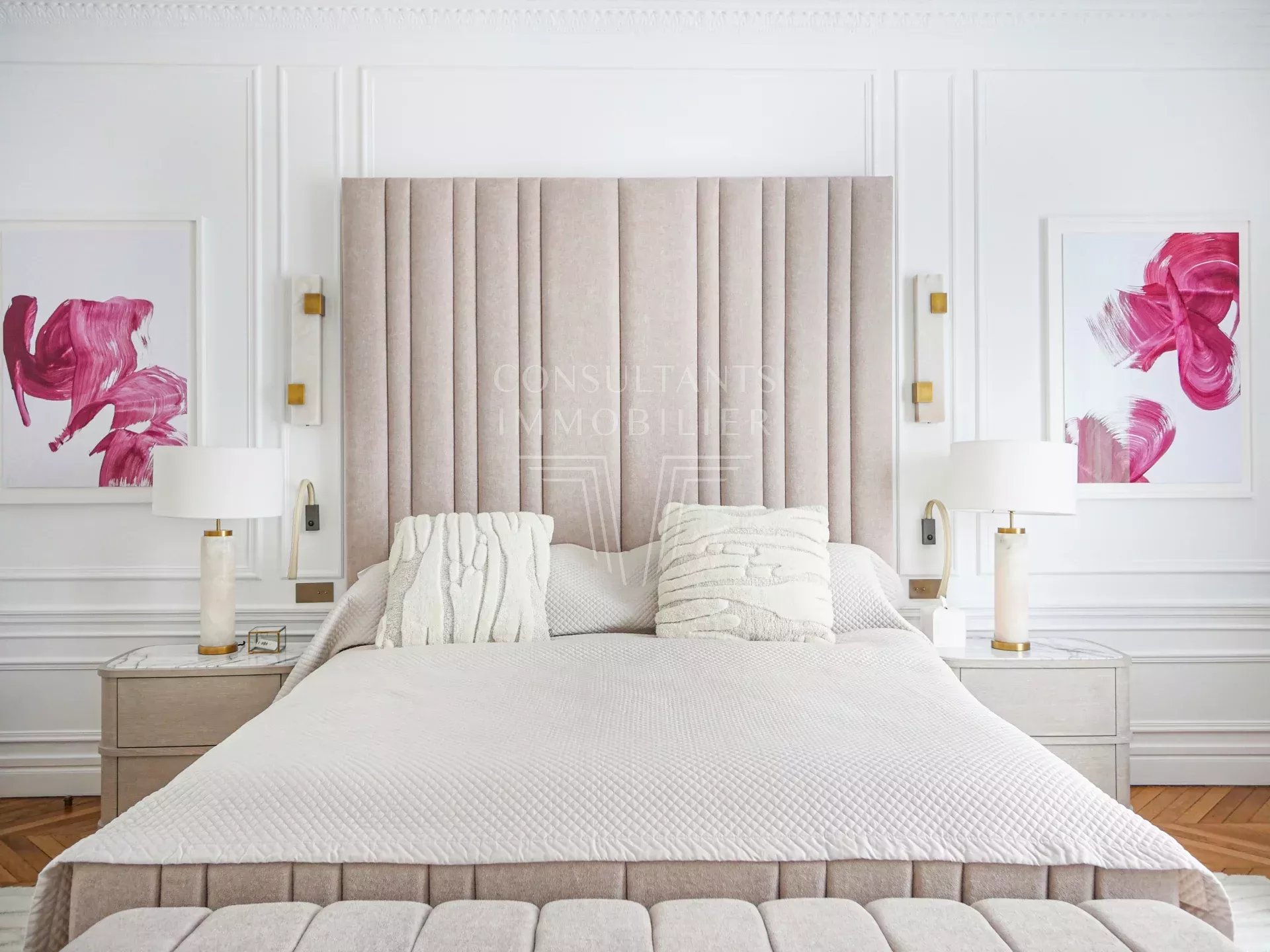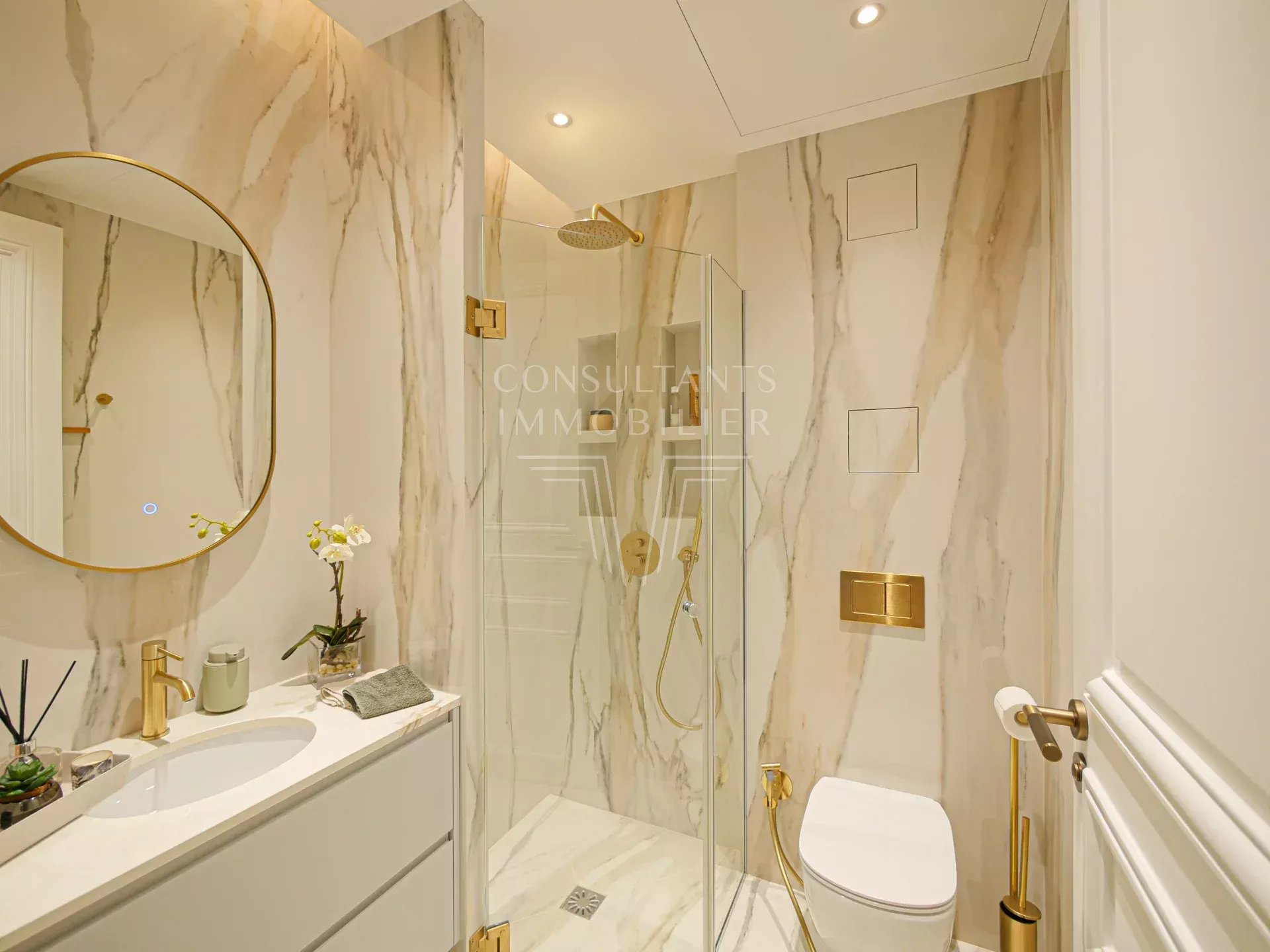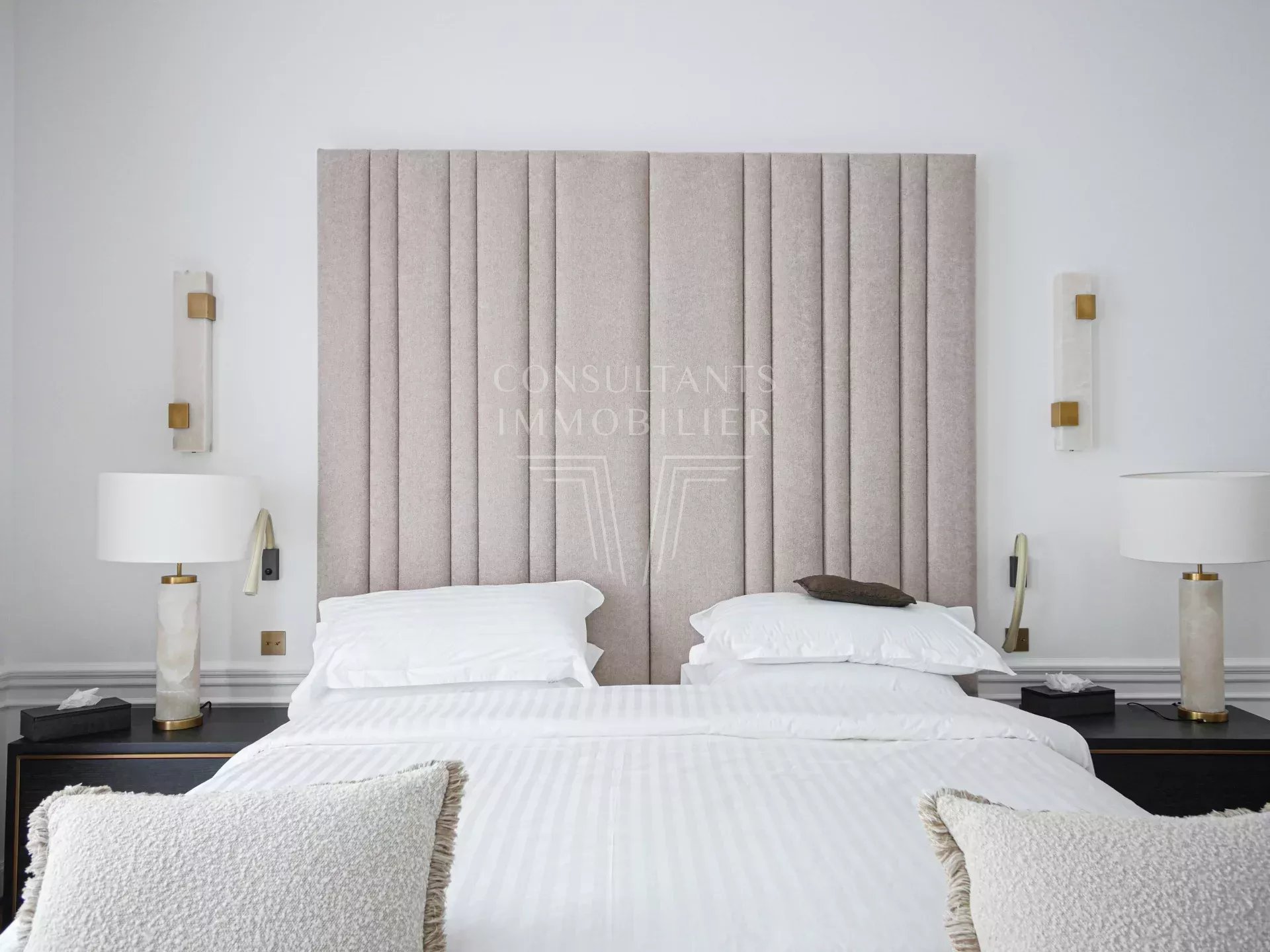 Il comprend : une galerie d'entrée, un double séjour lumineux avec cheminée, une salle à manger-cuisine ouverte, un office, une buanderie, quatre suites, chacune avec douche à l'italienne et dressing. Plusieurs toilettes dans l'appartement.
