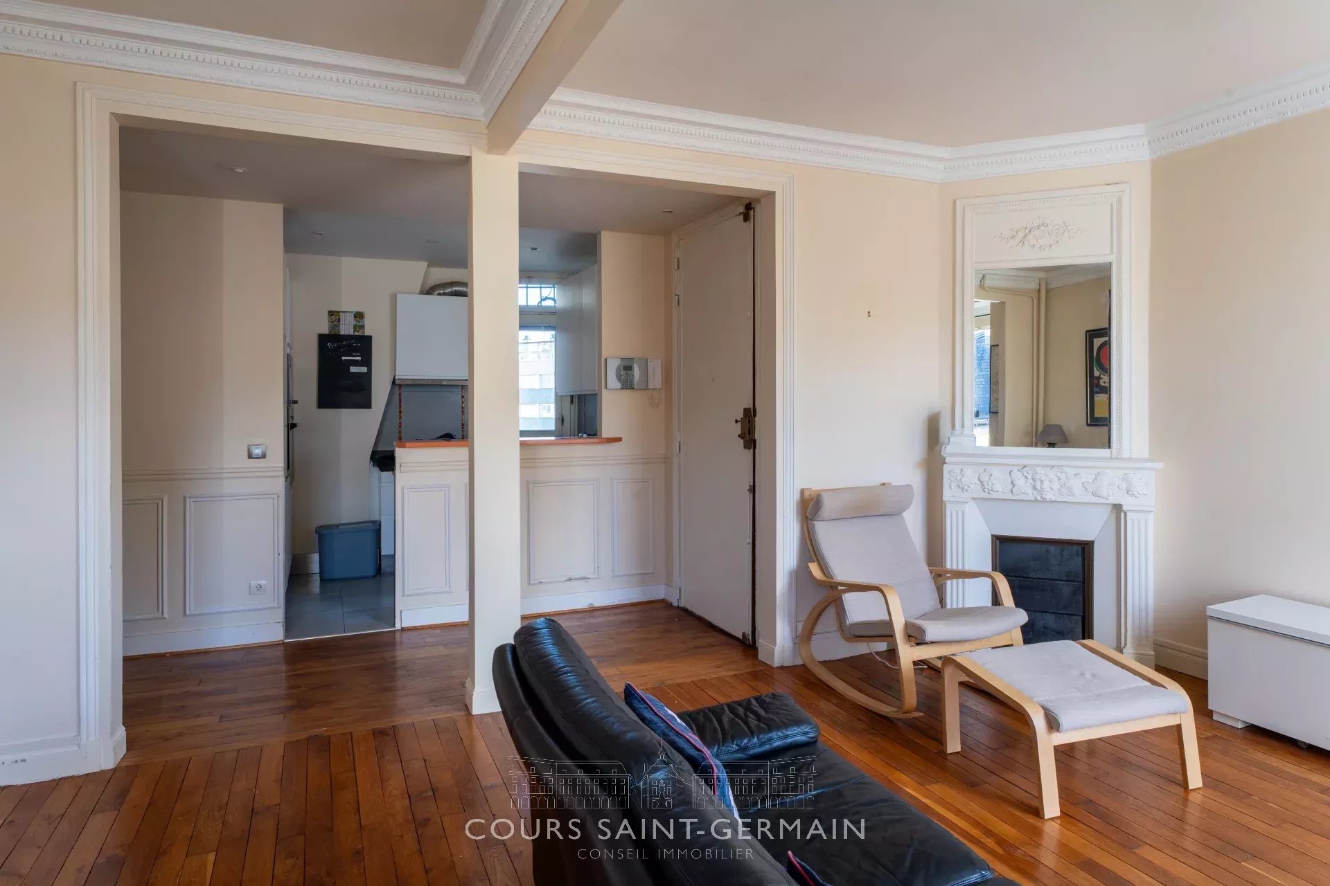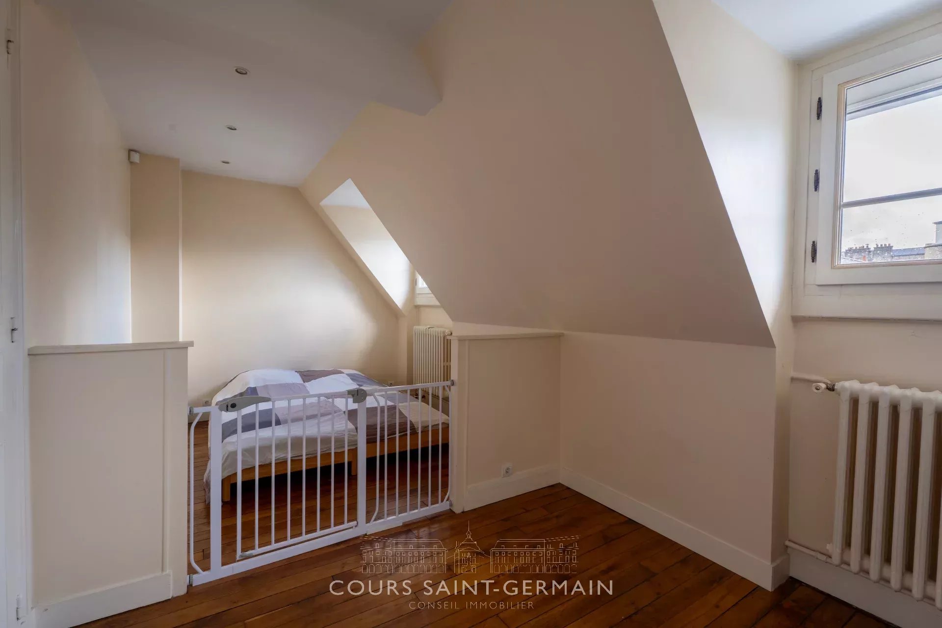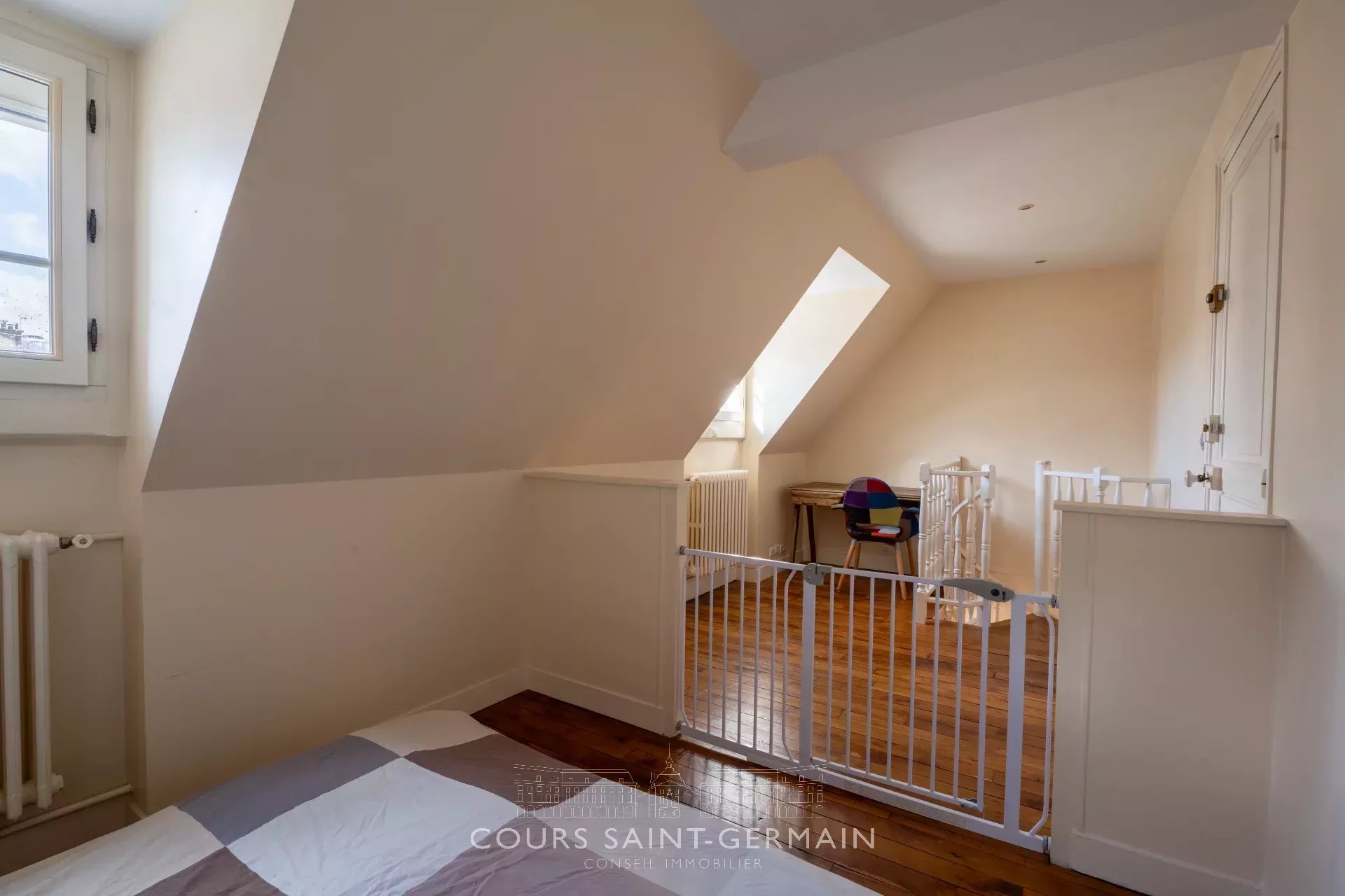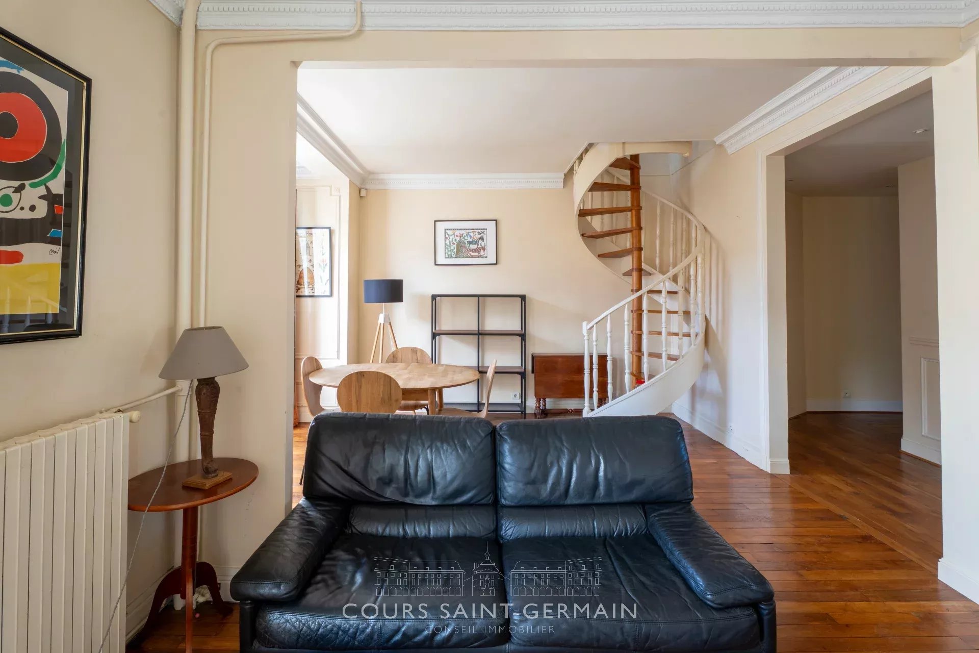 850 000 €Bel appartement familial au 6 ème et 7ème étage d'un immeuble bourgeois dans une voie sans issue. Un 4 pièces avec Une entrée, un double séjour de exposée ouest avec balcons, un salon avec cheminée, une salle à manger, une cuisine ouverte aménagée, donnant sur un balcon exposé est, deux chambres exposées sud, une salle de bains, un toilette indépendant, des rangements. De la salle à manger un escalier en colimasson monte dans la troisième chambre située au 7ème, face à laquelle il y a une salle de douches avec wc ( accès par couloir du 7ème).