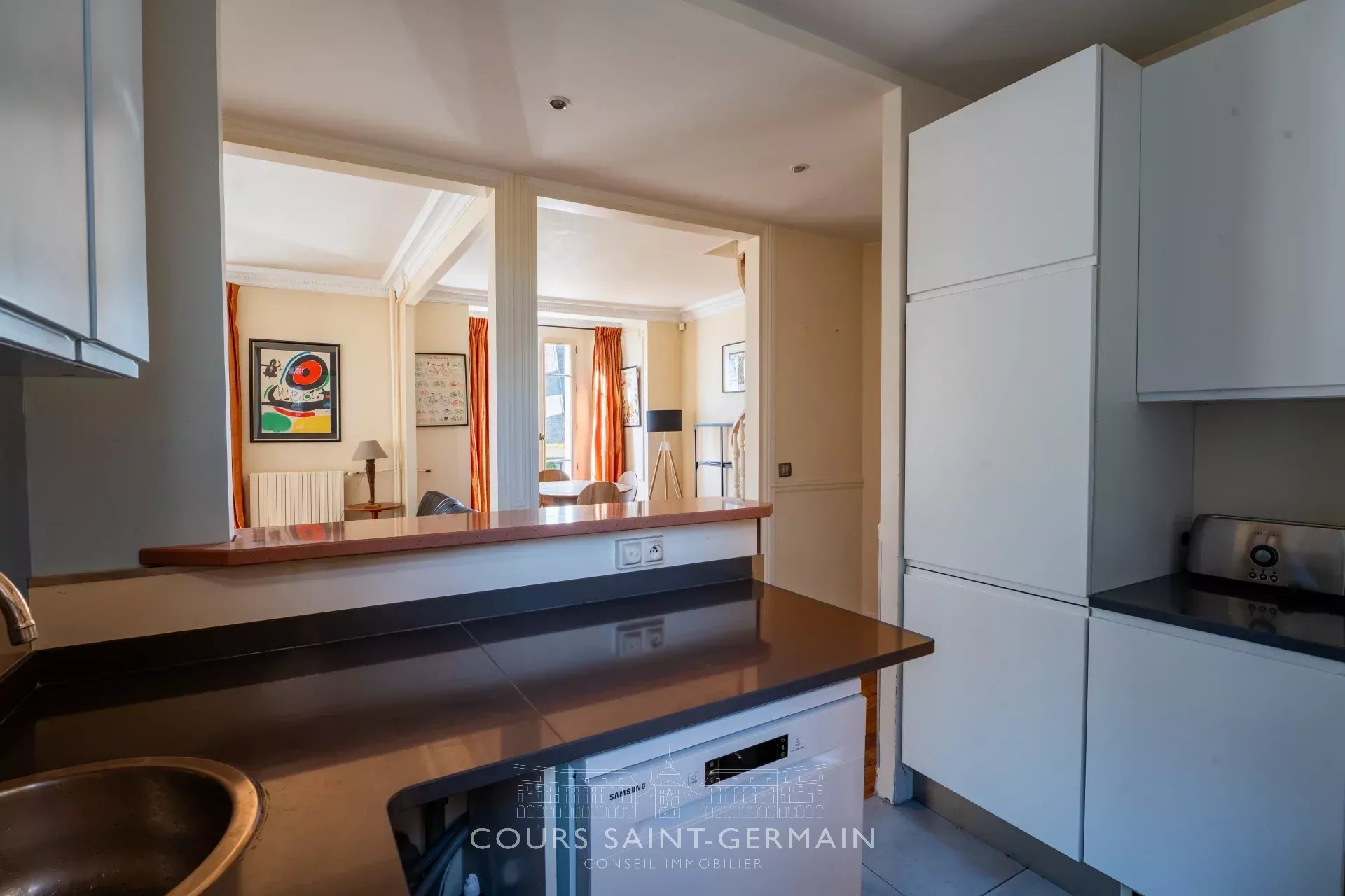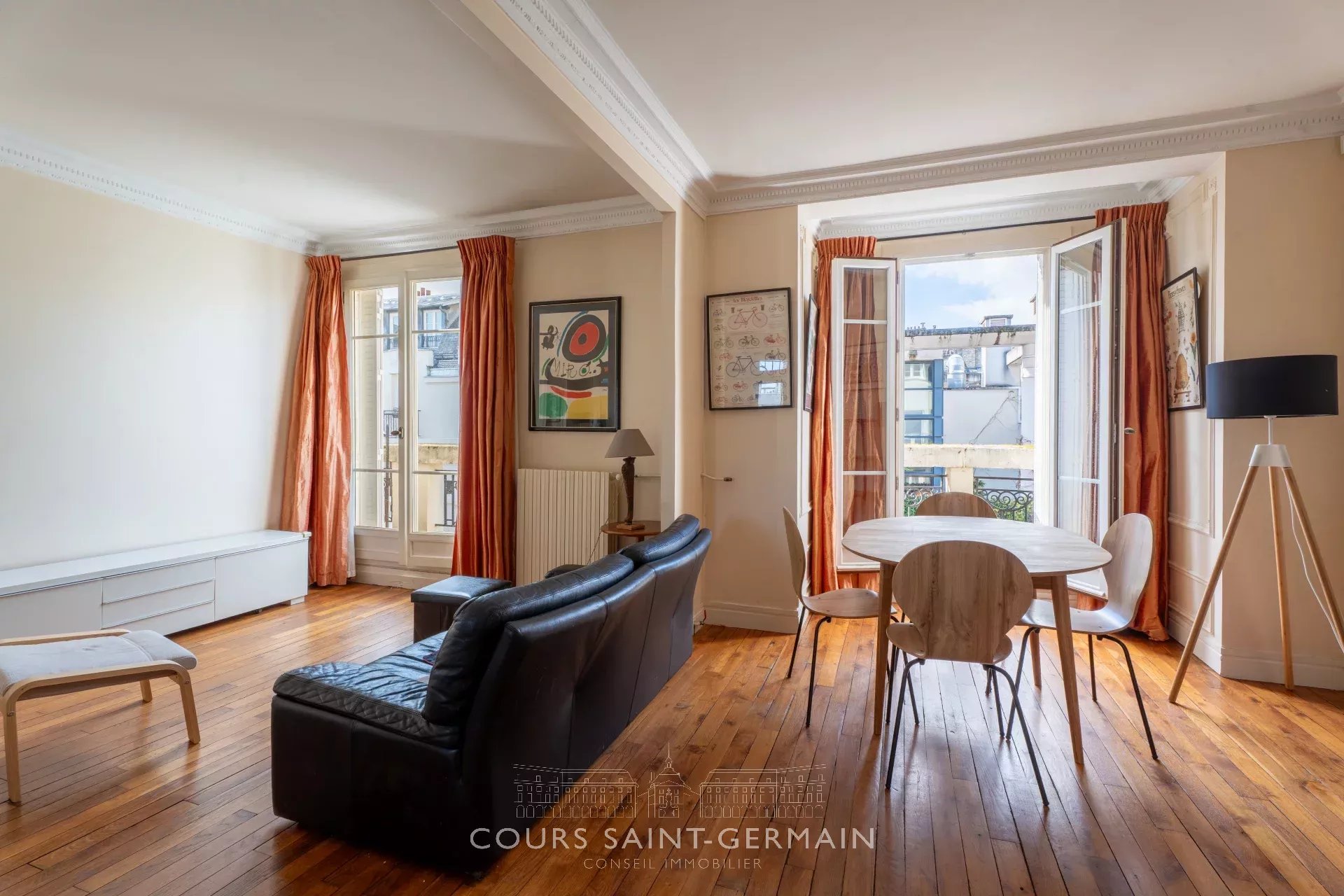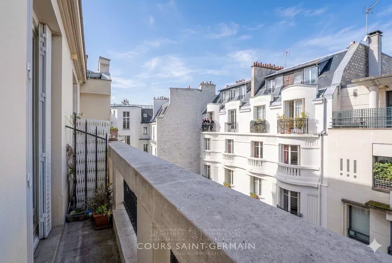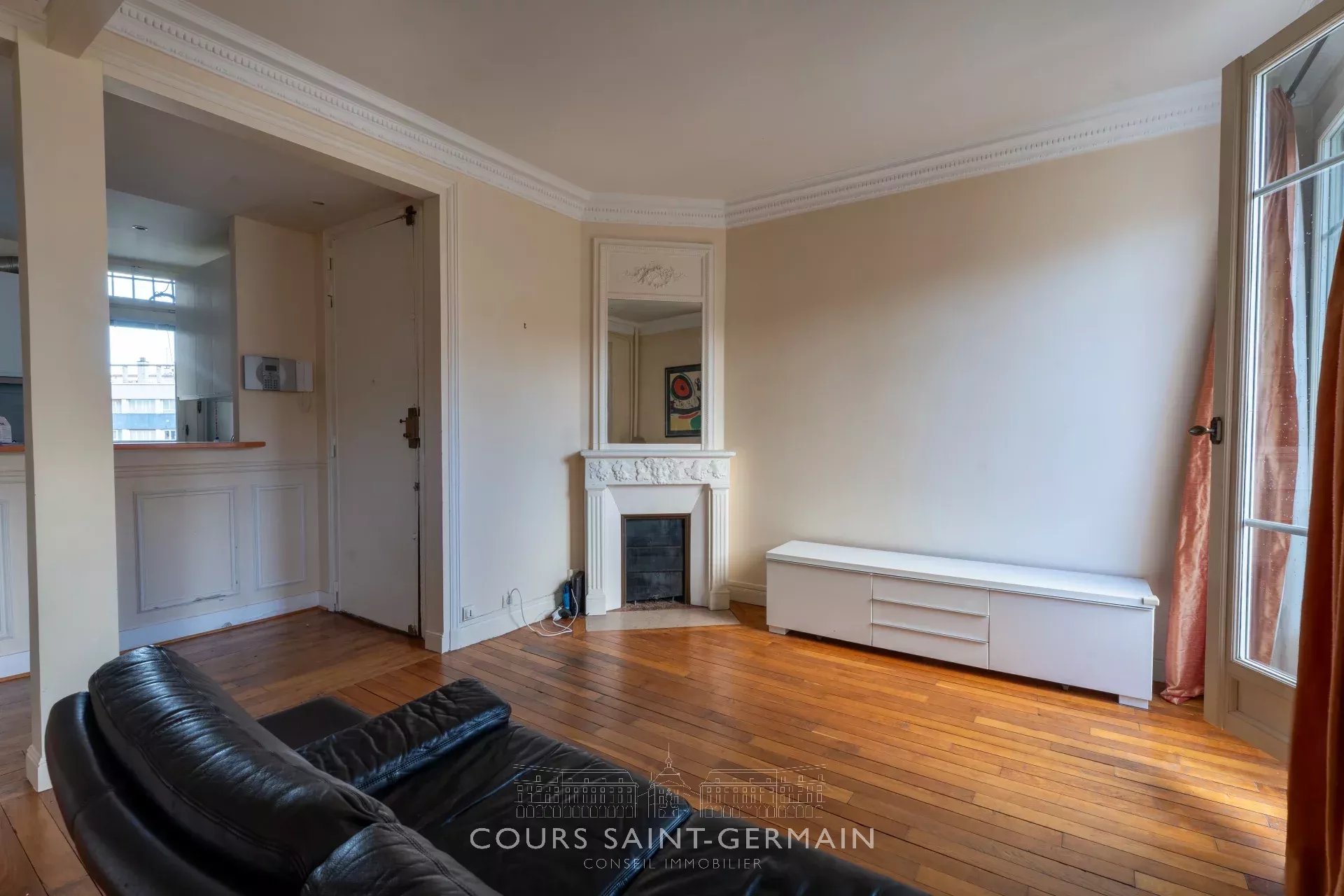850 000 €Bel appartement familial au 6 ème et 7ème étage d'un immeuble bourgeois dans une voie sans issue. Un 4 pièces avec Une entrée, un double séjour de exposée ouest avec balcons, un salon avec cheminée, une salle à manger, une cuisine ouverte aménagée, donnant sur un balcon exposé est, deux chambres exposées sud, une salle de bains, un toilette indépendant, des rangements. De la salle à manger un escalier en colimasson monte dans la troisième chambre située au 7ème, face à laquelle il y a une salle de douches avec wc ( accès par couloir du 7ème).