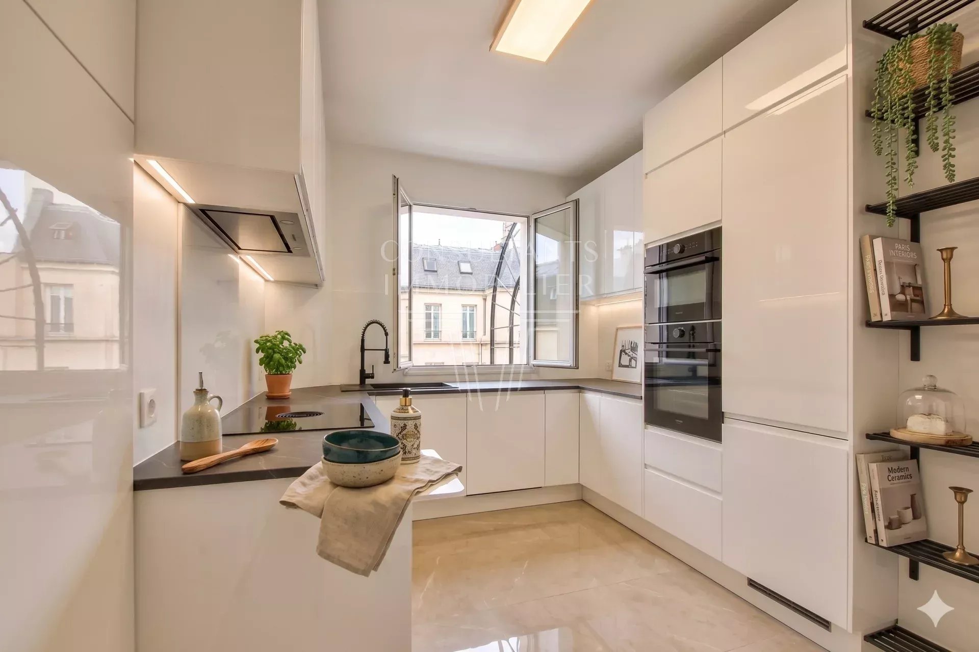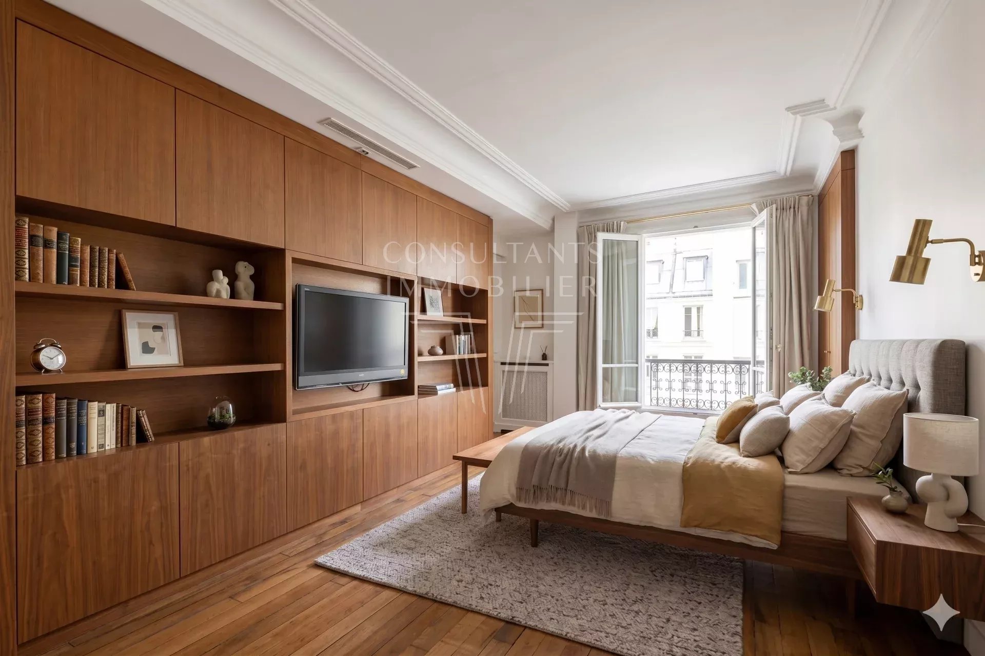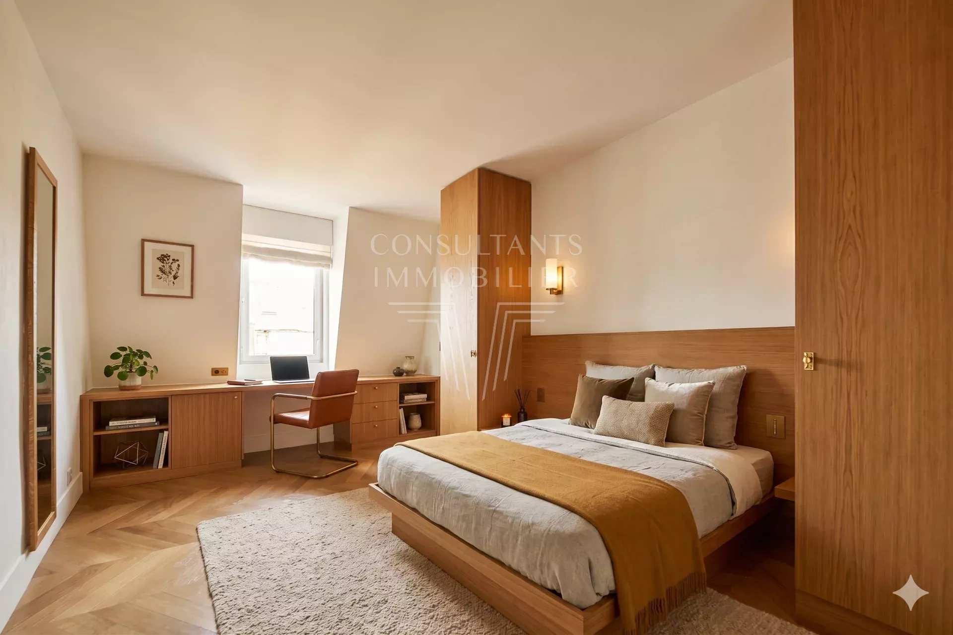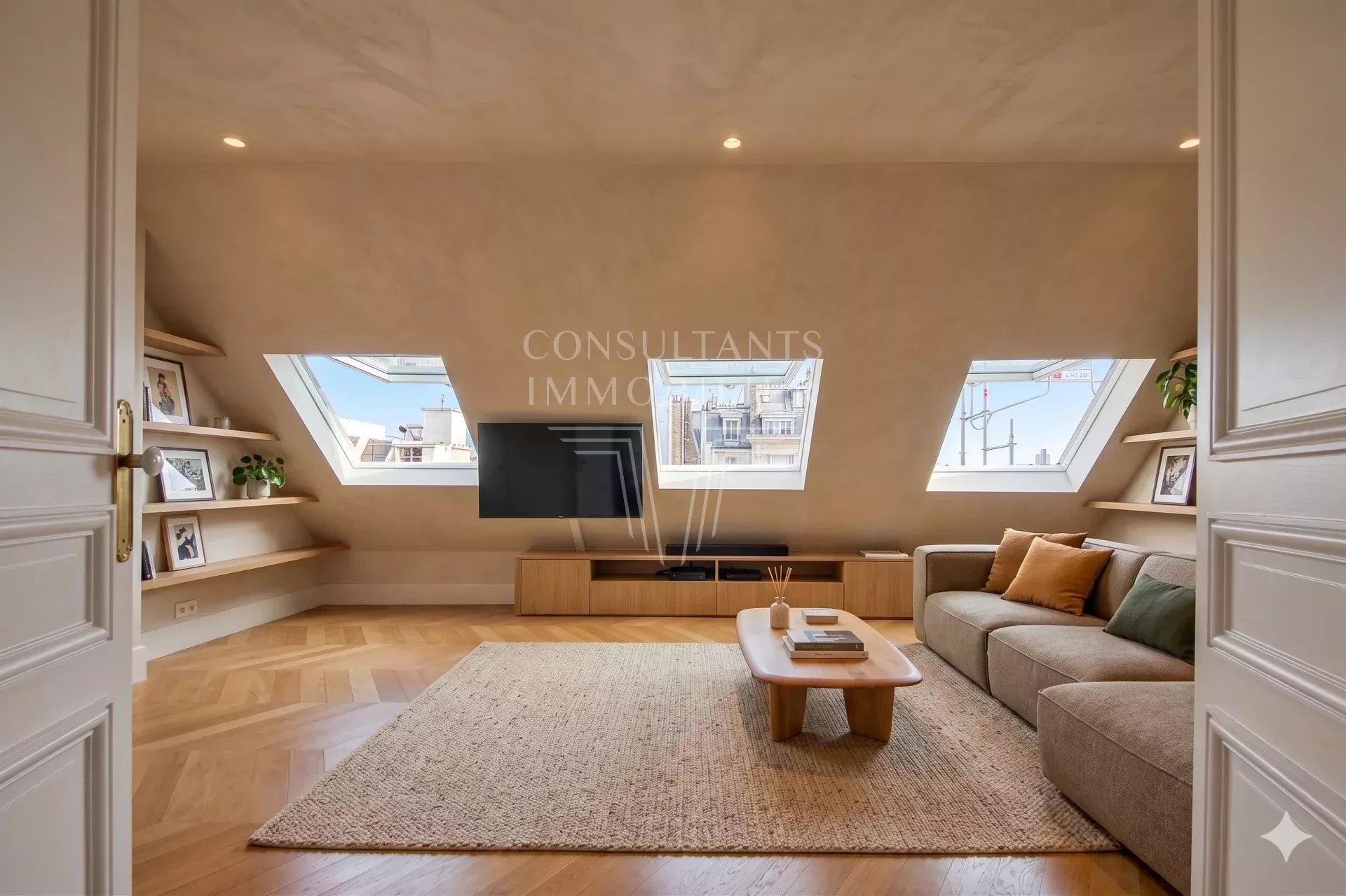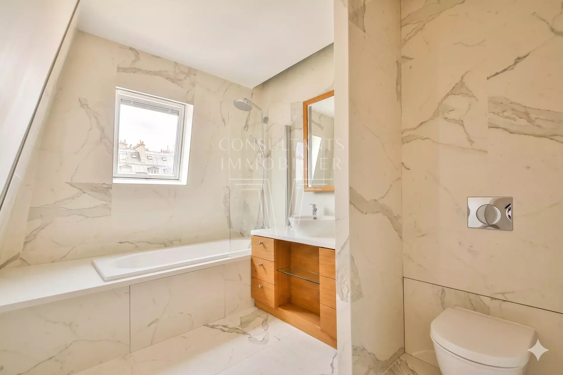 Aux cinquième et sixième derniers étages d'un immeuble en pierre de taille haussmannien de très bon standing, situé à proximité de la place des États-Unis :
