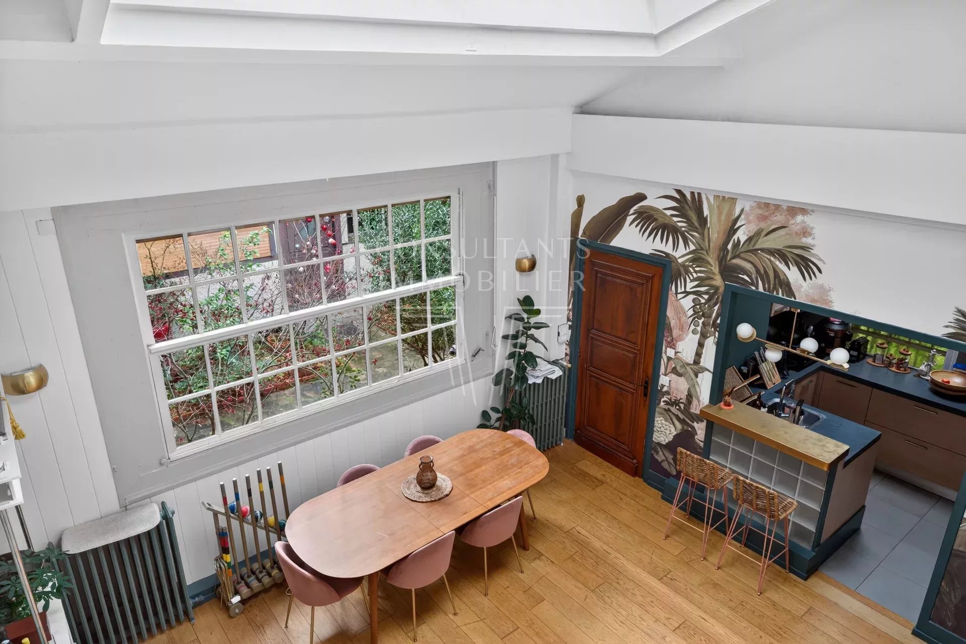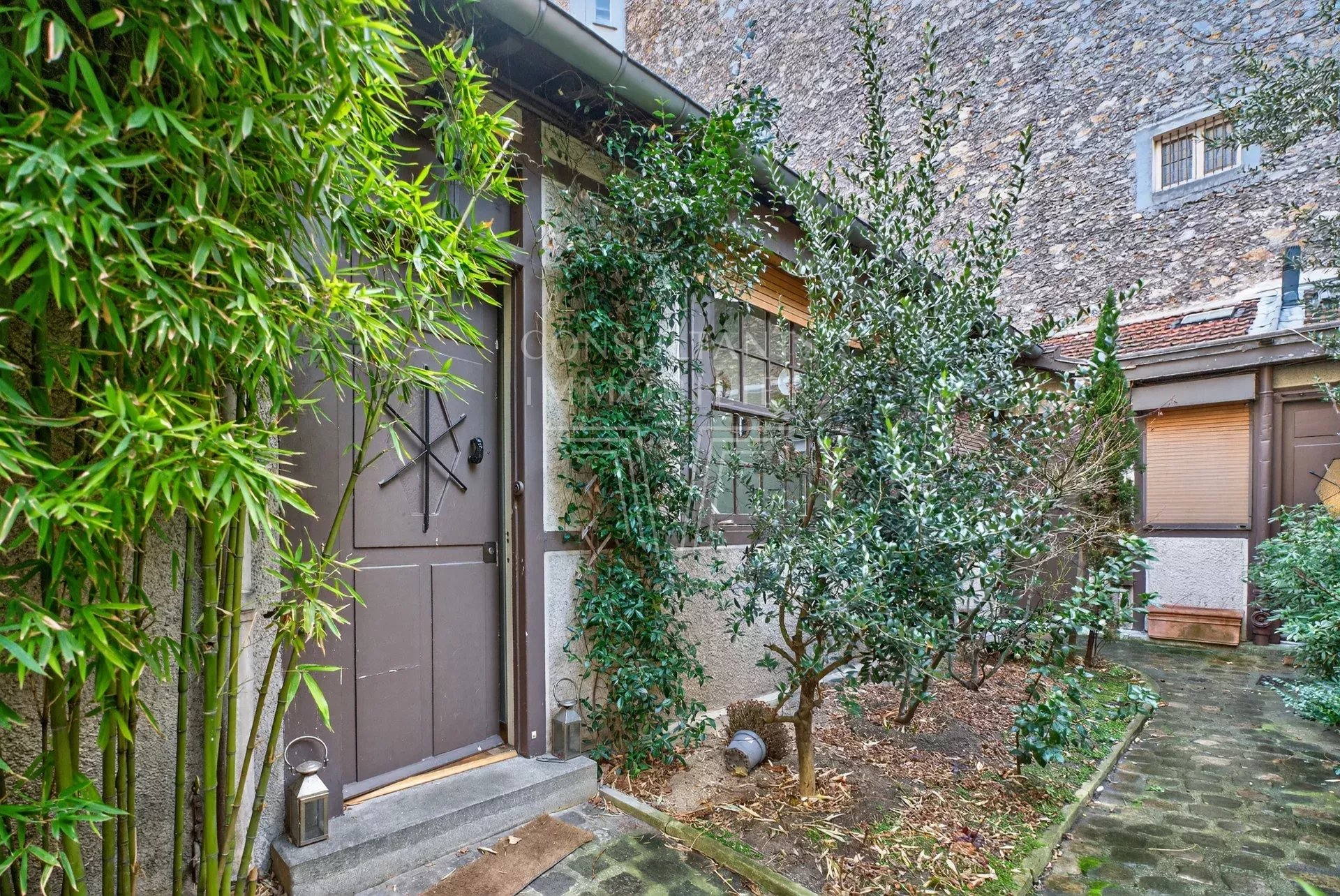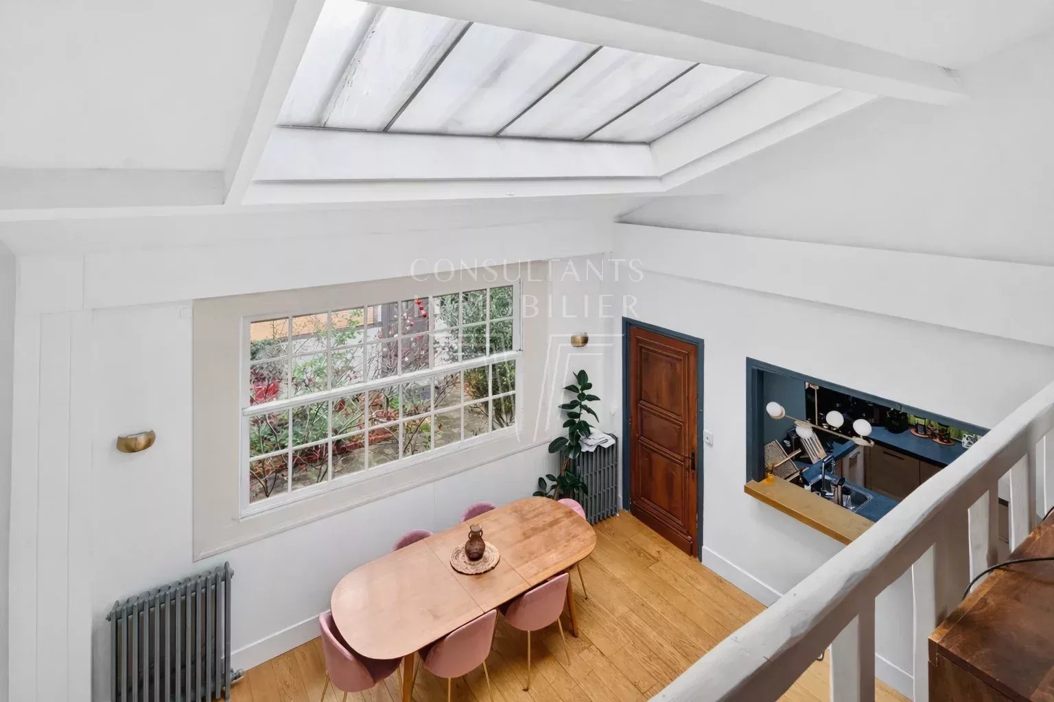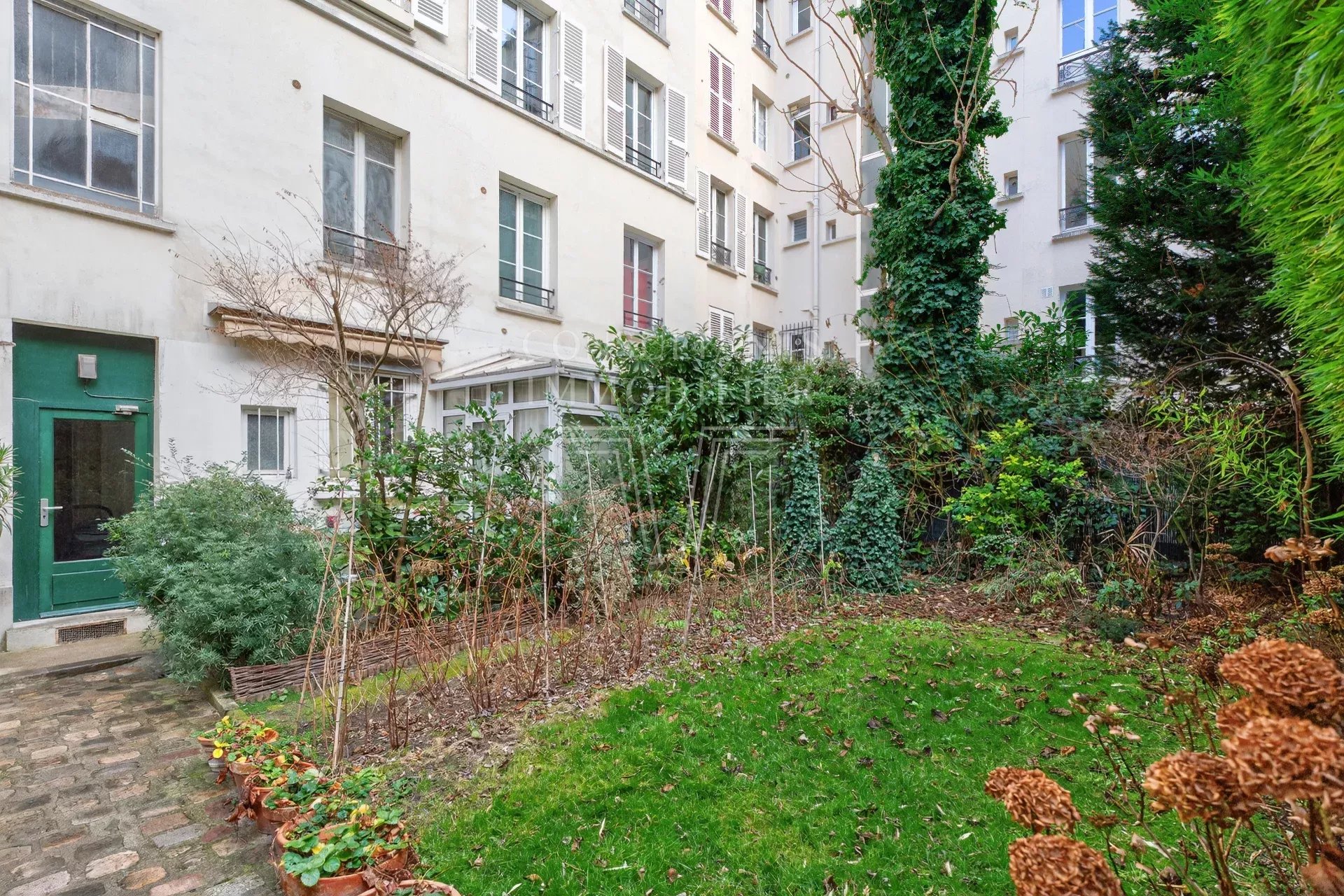 Au sein d'une copropriété du début XIXe, entretenue, idéalement située entre Passy et Trocadéro, atelier d’artiste aménagé comme une maison au calme absolu bénéficiant d’une entrée indépendante accessible par un agréable jardin arboré et fleuri.
