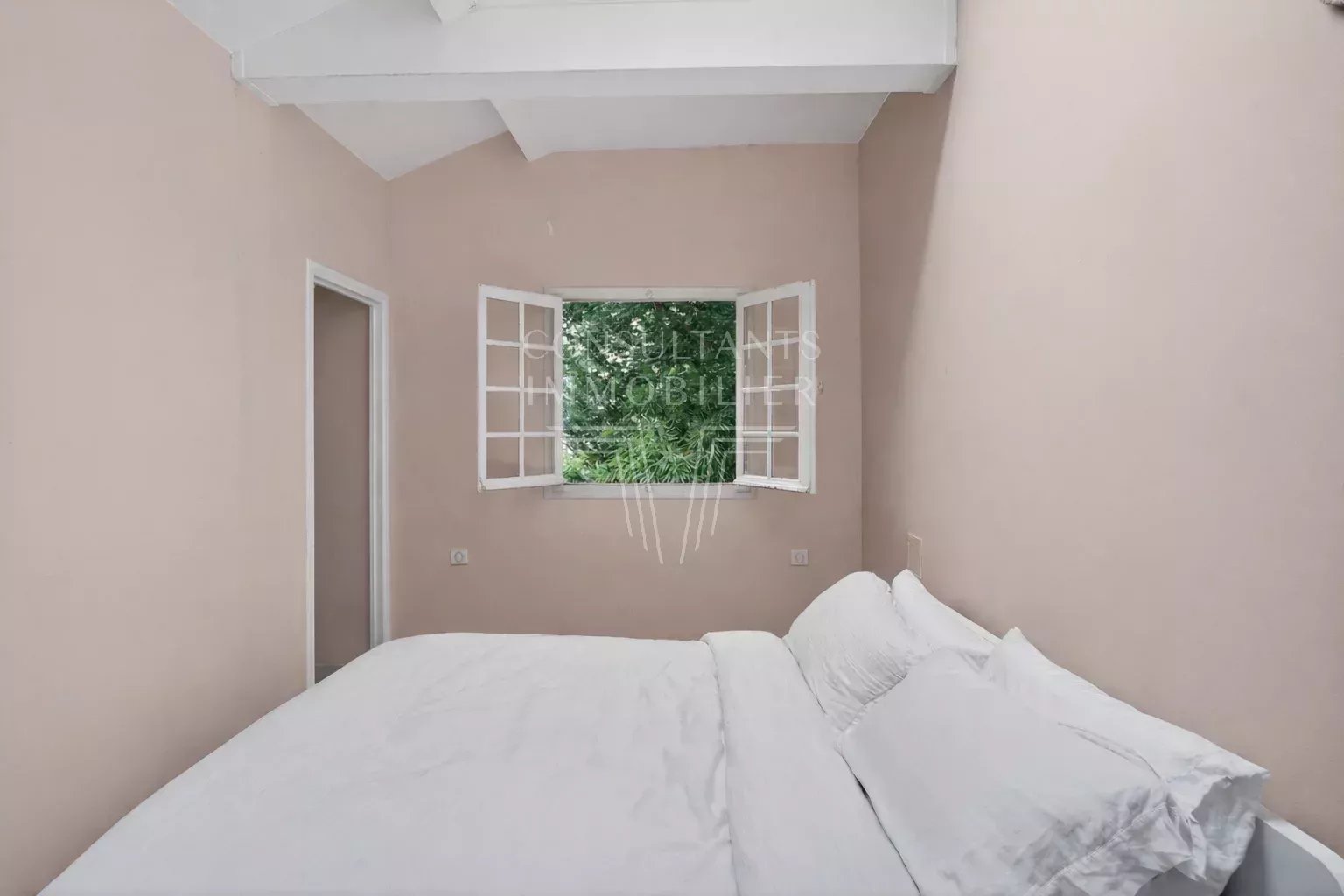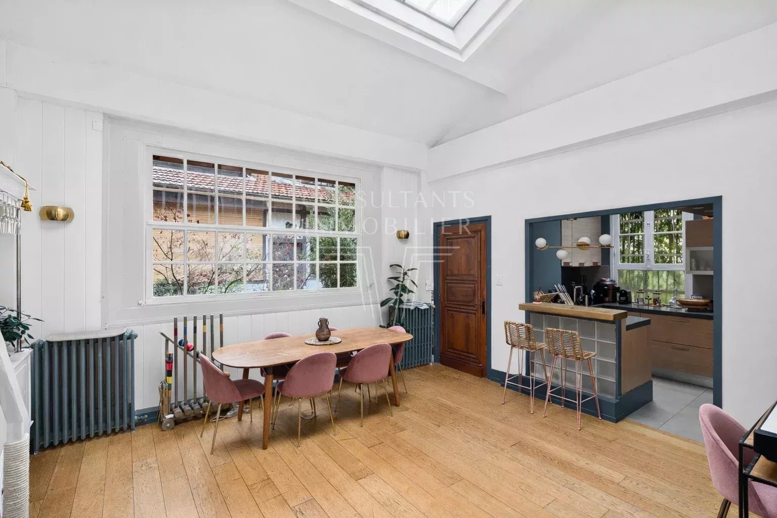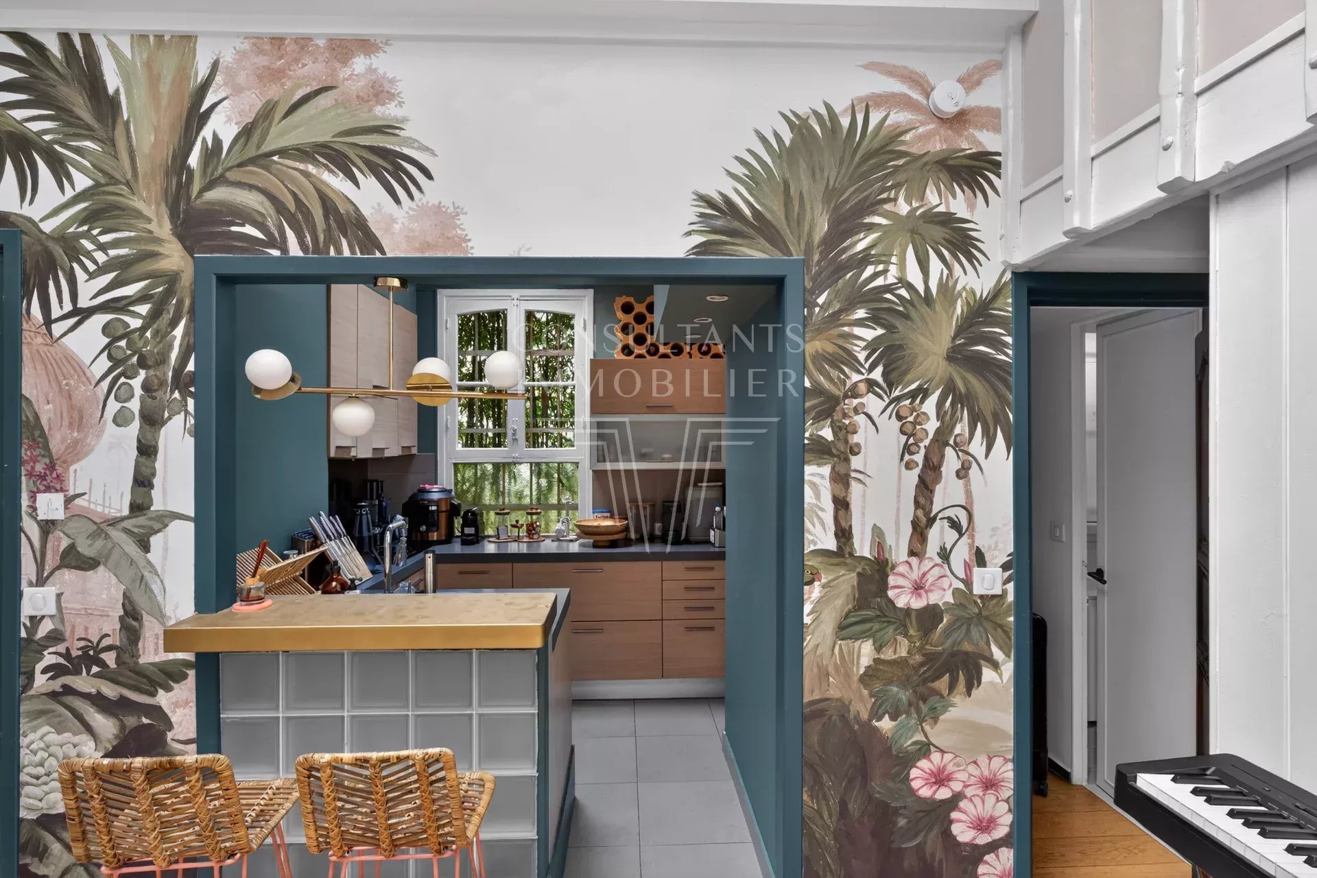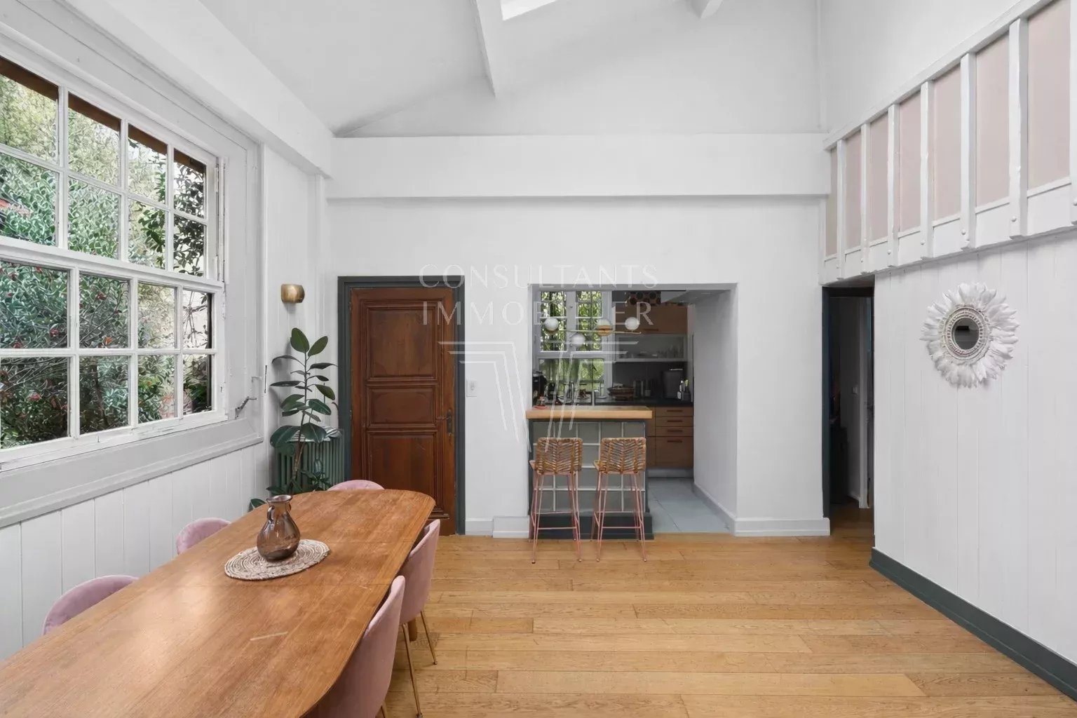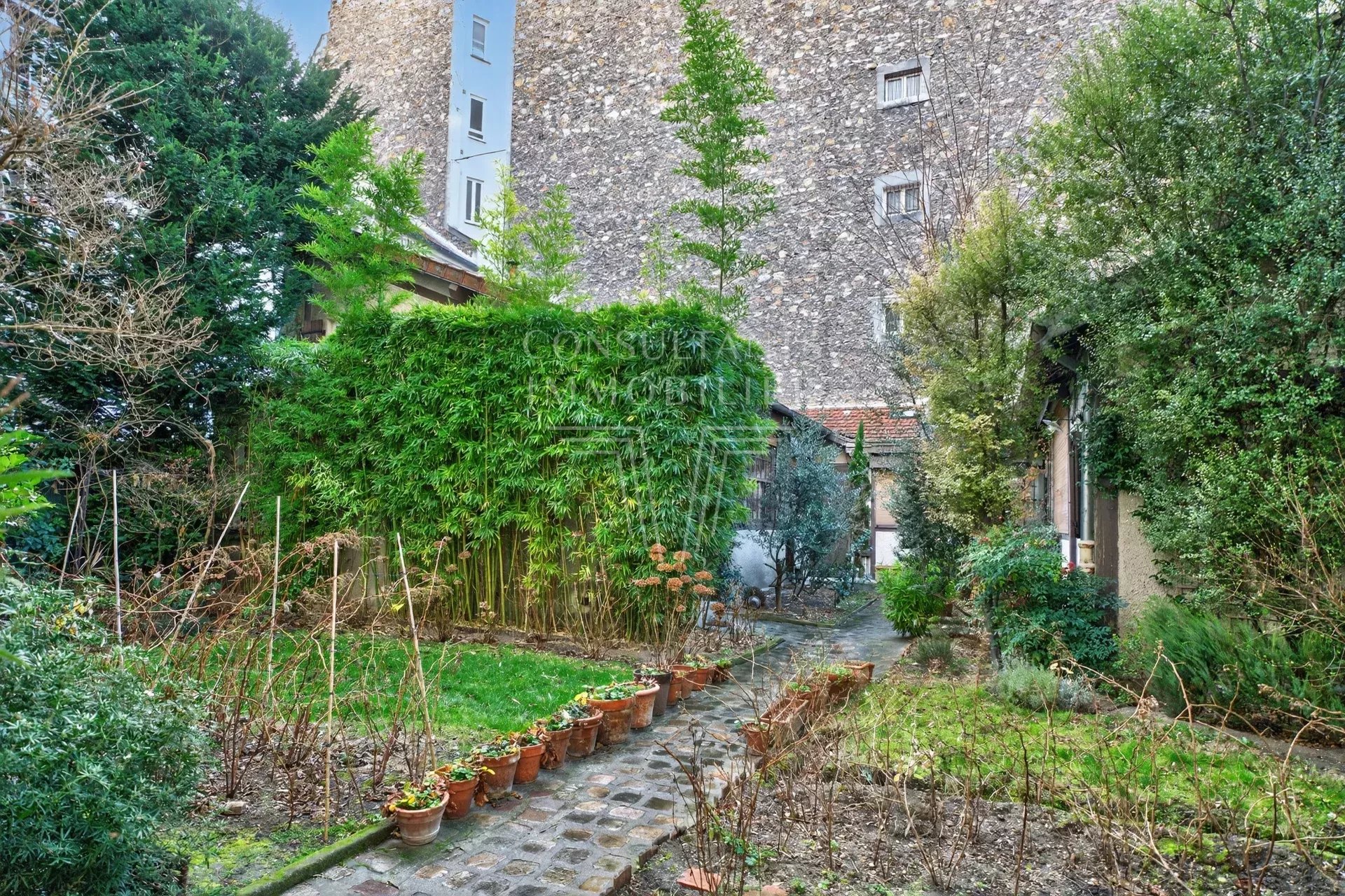 Au sein d'une copropriété du début XIXe, entretenue, idéalement située entre Passy et Trocadéro, atelier d’artiste aménagé comme une maison au calme absolu bénéficiant d’une entrée indépendante accessible par un agréable jardin arboré et fleuri.