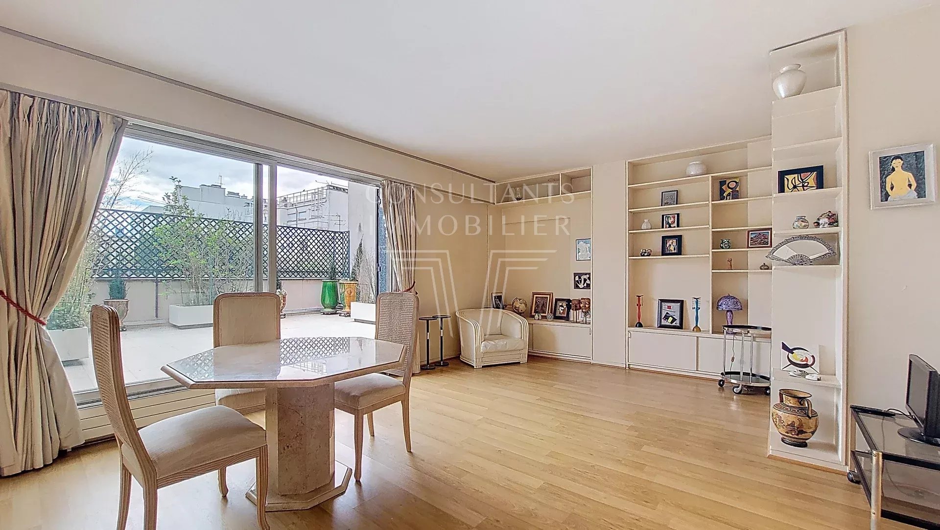 Appartement ensoleillé de deux pièces principales aux proportions parfaites, bénéficiant d'une belle terrasse de 25 m² exposée sud/sud-est avec une vue sur la tour Eiffel.