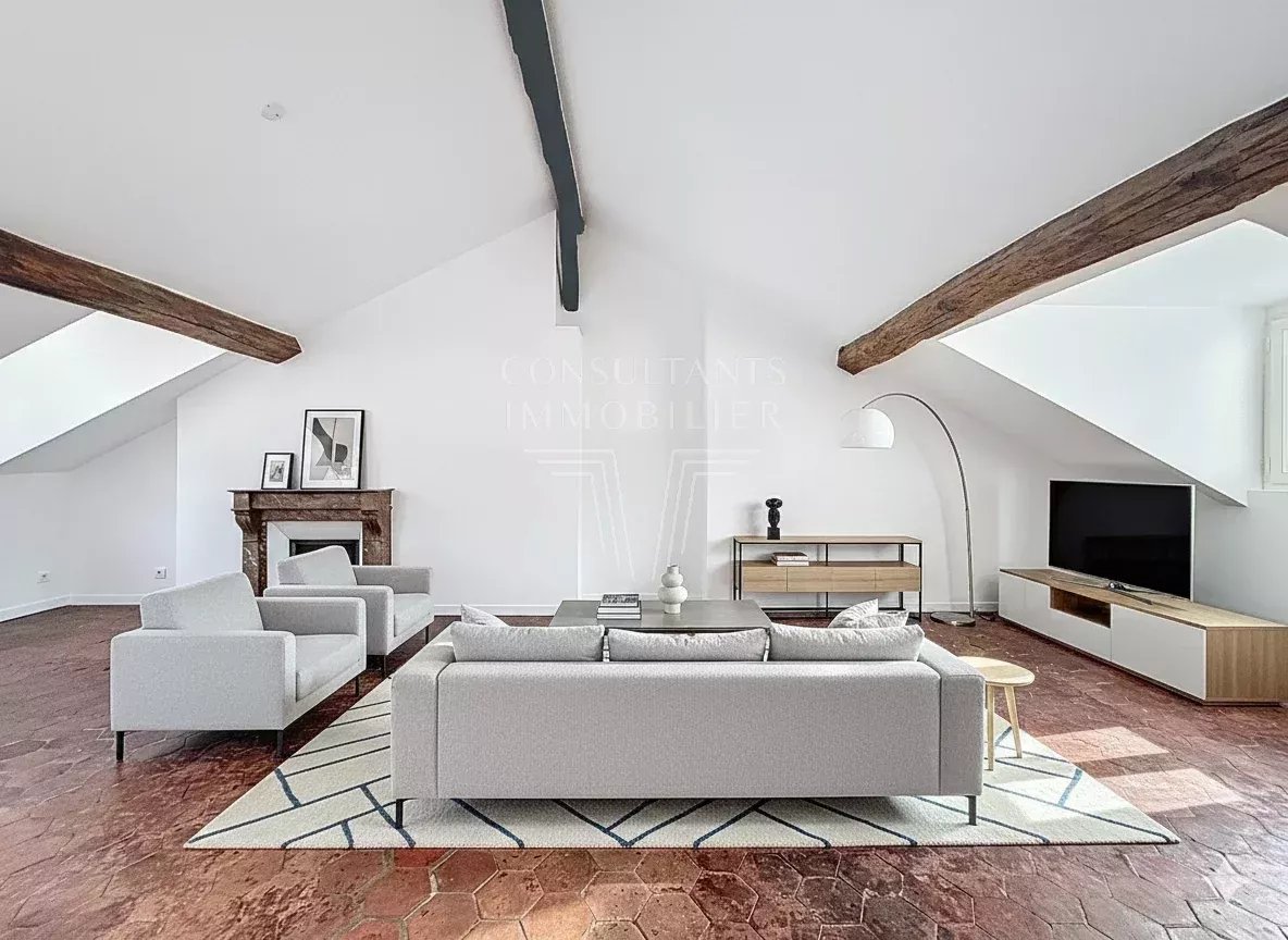 Avec ses poutres apparentes, ses tomettes anciennes, sa cheminée et la belle hauteur sous plafond, il bénéficie d'un charme "rive gauche" en plein 16e.