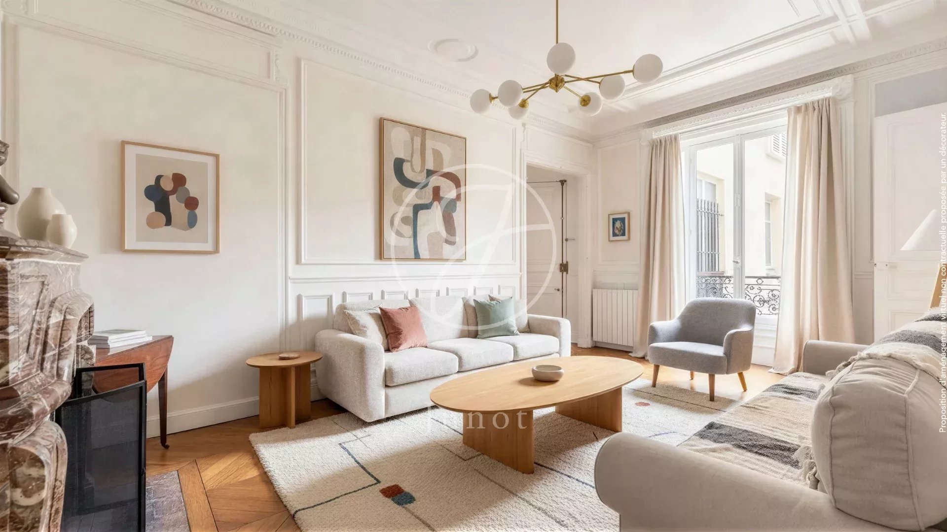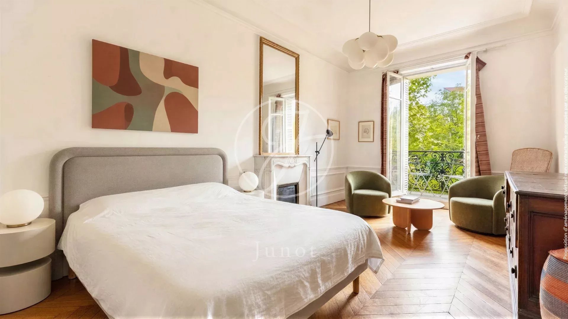Le charme de l’ancien a été préservé — parquet, moulures, cheminée — tout en offrant un plan optimisé et modulable permettant aisément la création d’une seconde chambre.