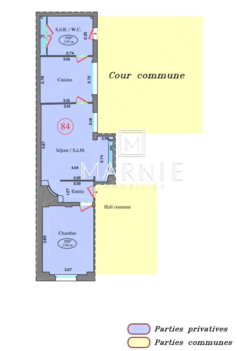 Il se compose d’une entrée, d’une chambre sur rue, d’un séjour sur cour, d’une cuisine indépendante, ainsi que d’une salle de bains avec WC bénéficiant d’un accès direct à la cour de l’immeuble par porte-fenêtre.