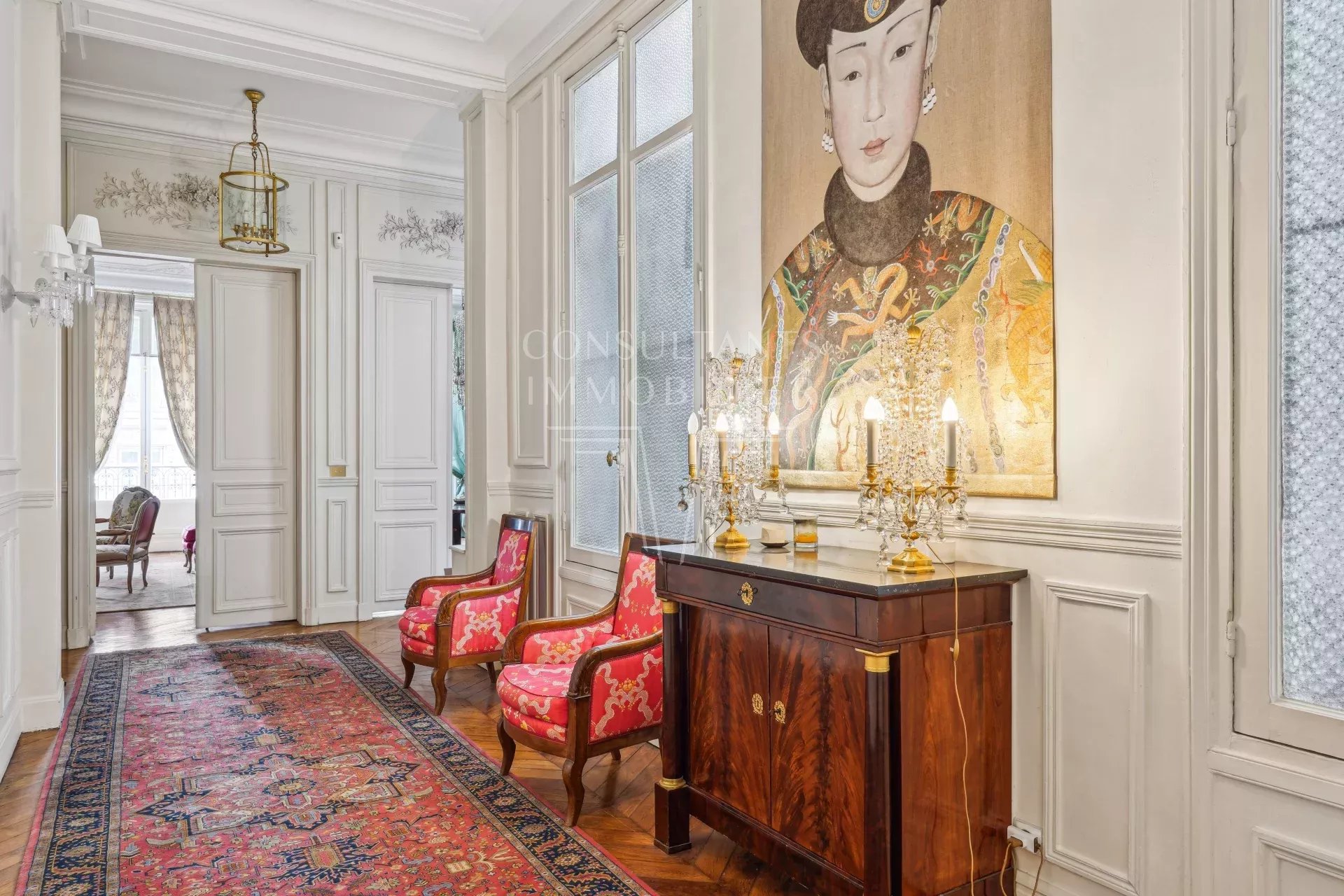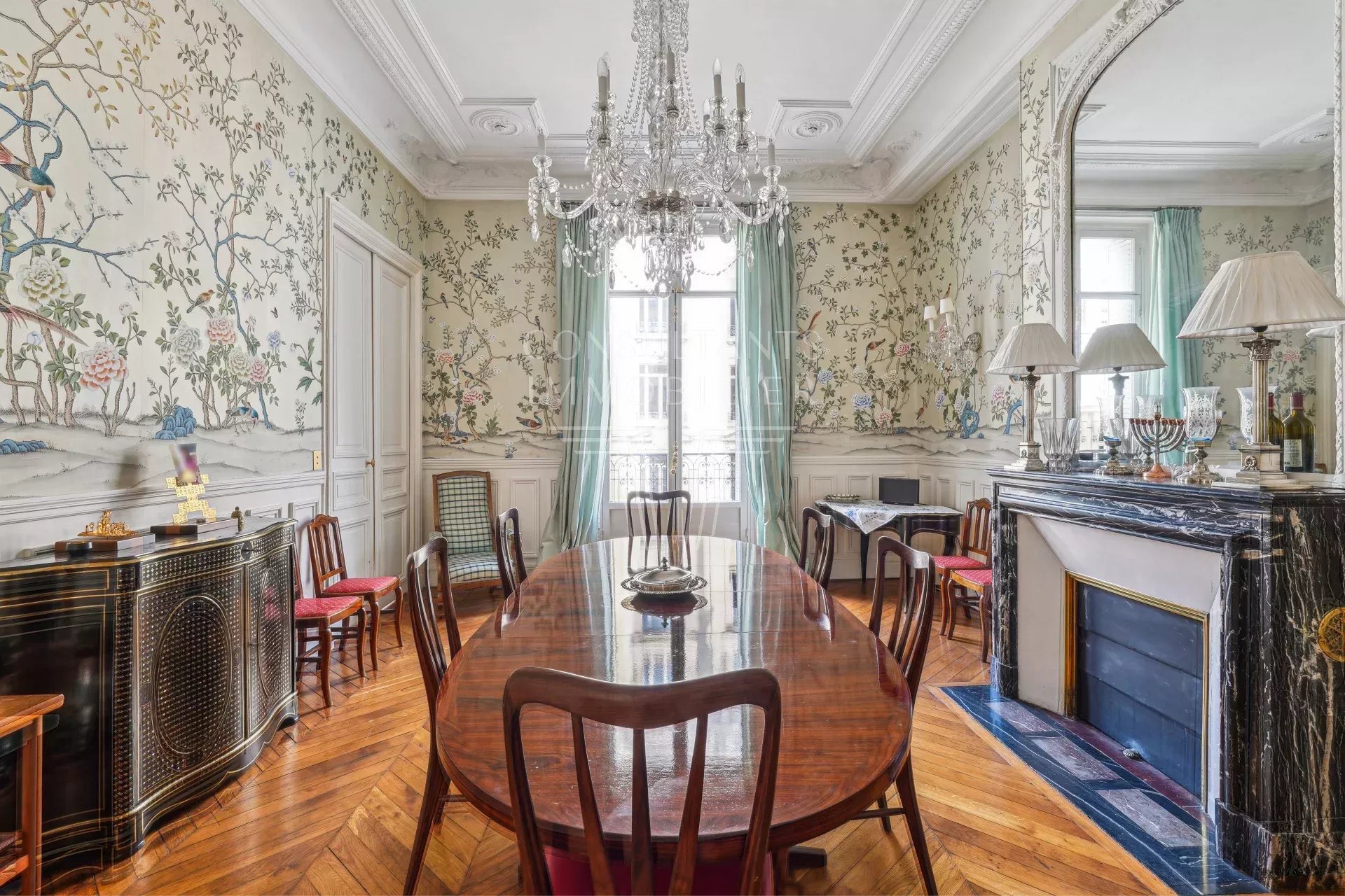Appartement traversant à la fois familial et de réception comprenant six pièces principales, d'une superficie de 225 m² bénéficiant de volumes très généreux avec une hauteur sous plafond de près de 4 m. En bon état, cet appartement très élégant a tous les plus beaux attributs de l'ancien.