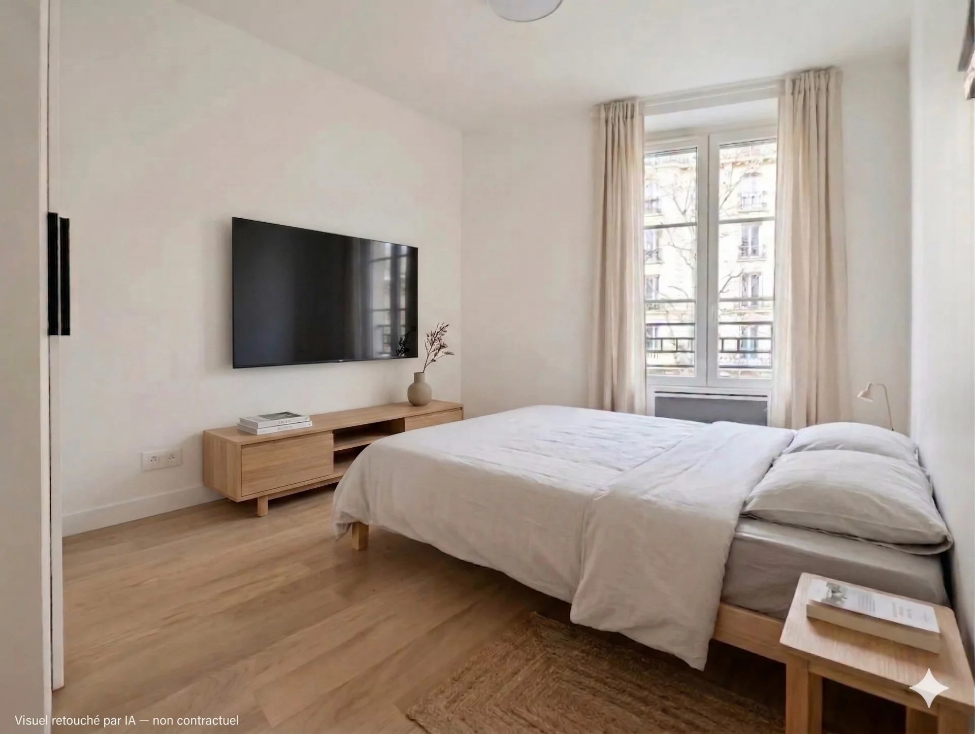 Cet appartement lumineux et traversant se compose d'une entrée, d'une belle salle d'eau avec toilettes, d'un vaste séjour avec une cuisine ouverte et de deux vraies chambres avec rangement sur mesure.